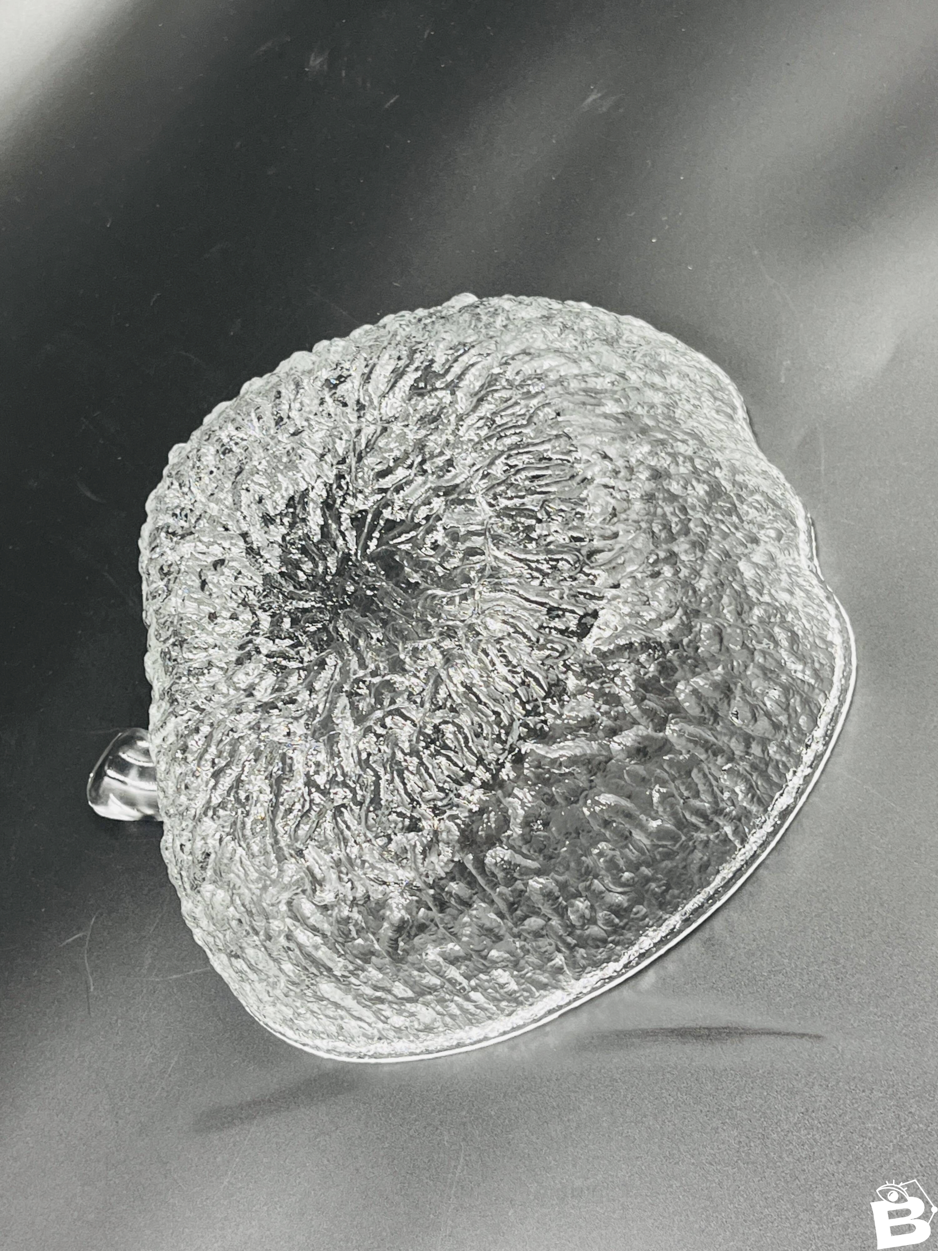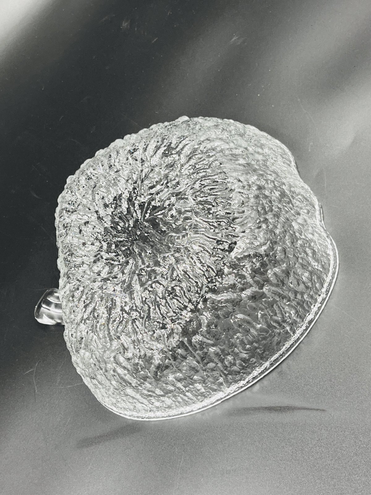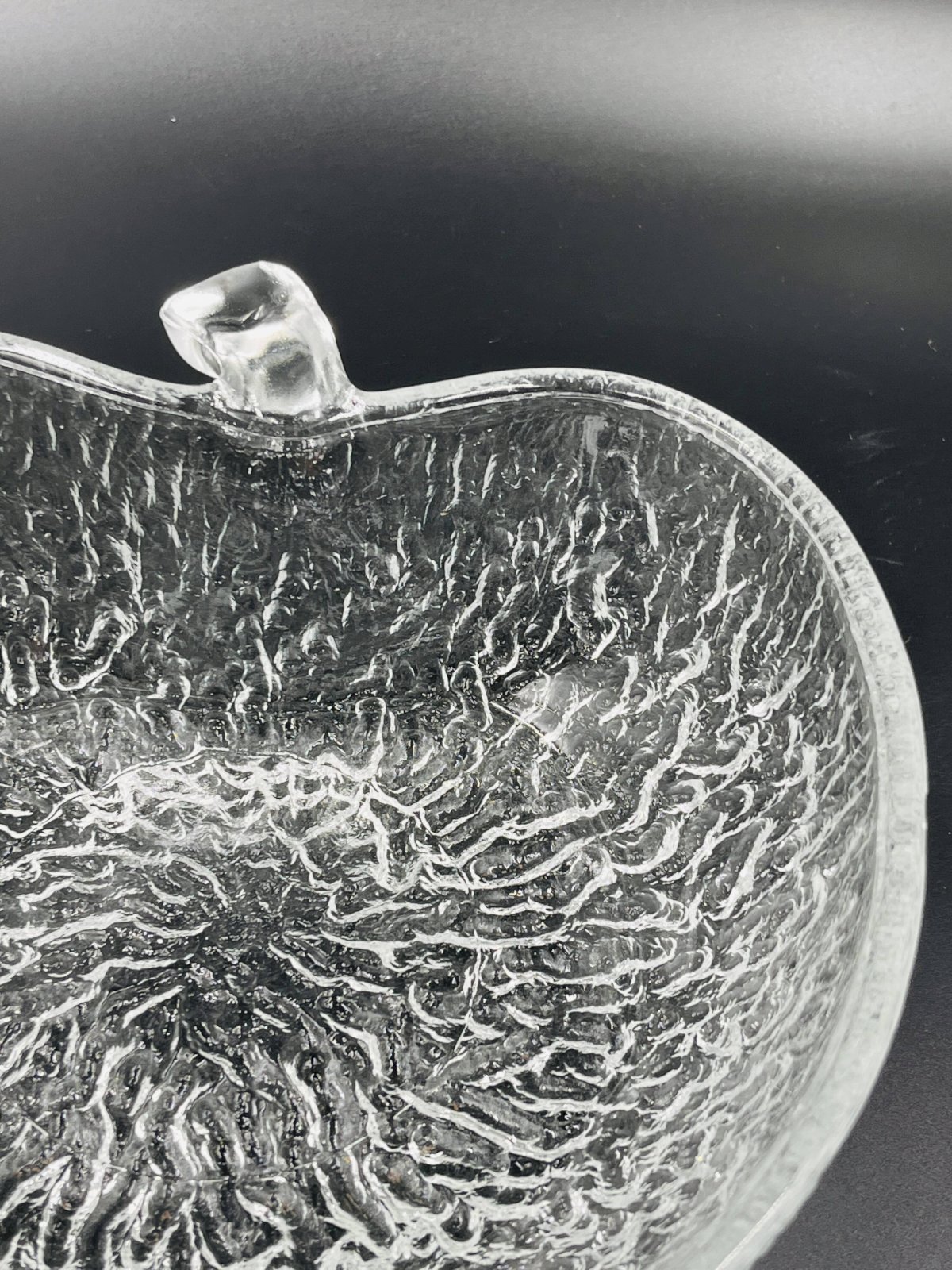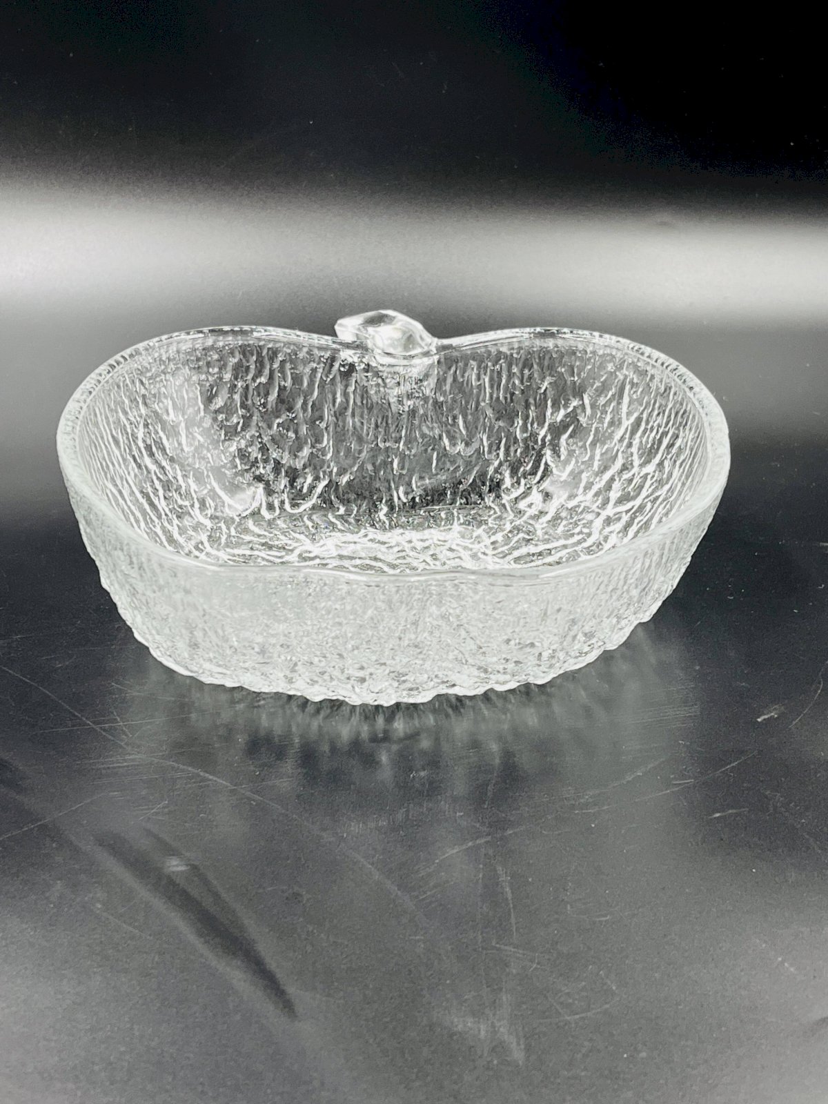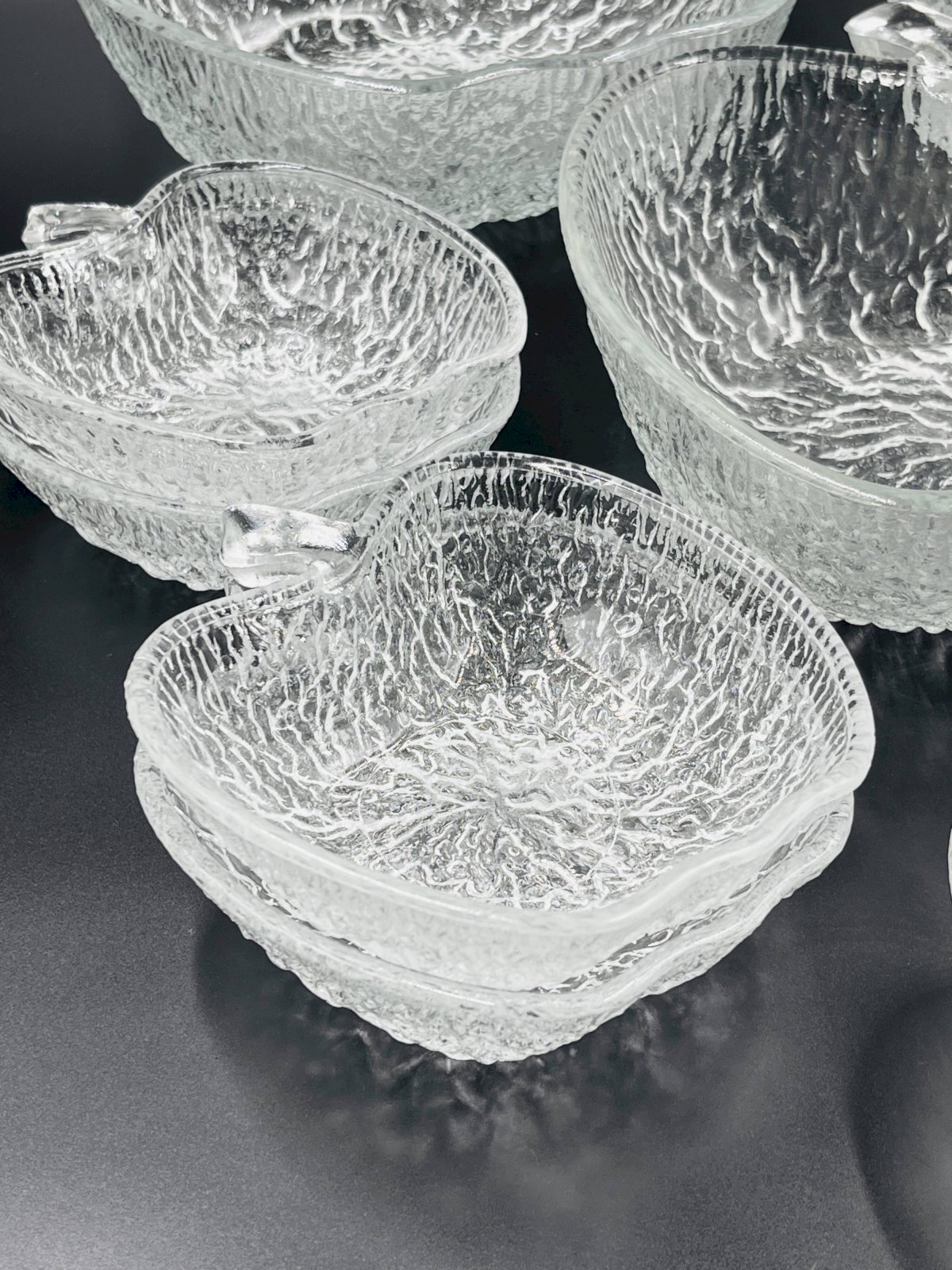 Made of high-quality glass, each piece features a unique textured surface that beautifully captures and reflects light, adding a touch of sophistication to all your meals. This service includes 8 bowls and 3 plates, each shaped like an apple, offering a charming and thematic presentation for your fruit salads. Made from durable glass, these bowls are not only aesthetically pleasing but also practical for everyday use as well as for special occasions. Their clear design allows the vibrant colors of your fruit salads to shine through, enhancing the visual appeal of your table. Elevate your dining experience with this elegant and functional fruit salad service, perfect for those who appreciate refined details. In very good condition. Dimensions: plates: 21 X 23 X H 8 cm. Bowls: 13 X 14 X H 4 cm. L: 21 l: 22 H: 8