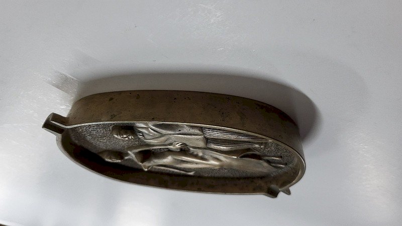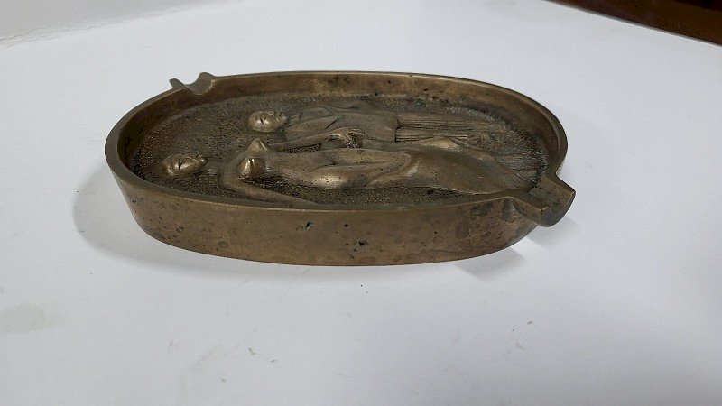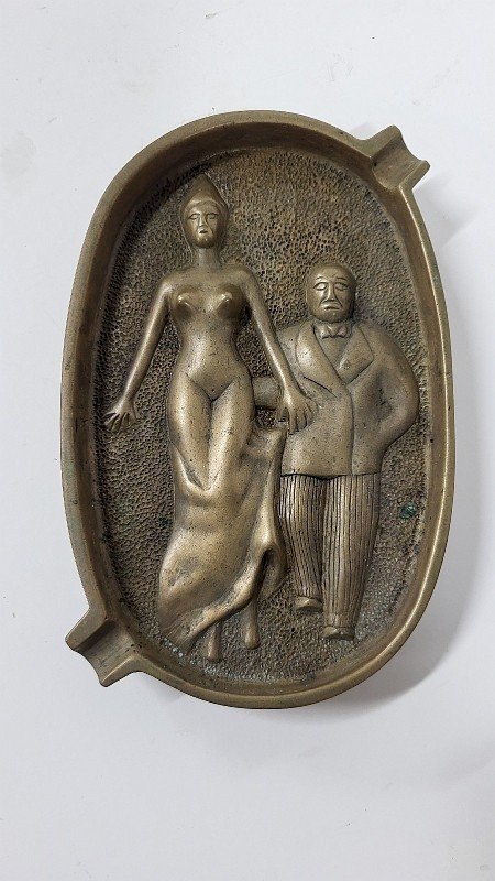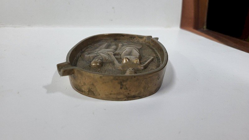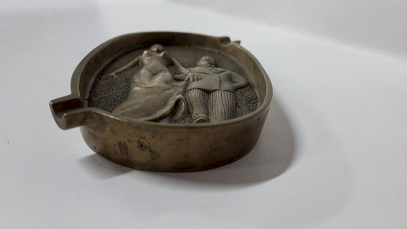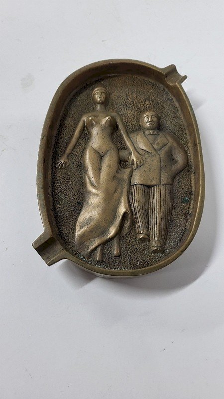 Nice ashtray, very playful; there is one side where we see the two characters facing each other, and the back side where we see them from behind with the man's hand on the lady's backside. Its weight is 630 grams, it measures 9 cm wide, 13.8 cm deep, and 2 cm thick. Country of origin: Metropolitan France. Subtype: Decorative ashtray.