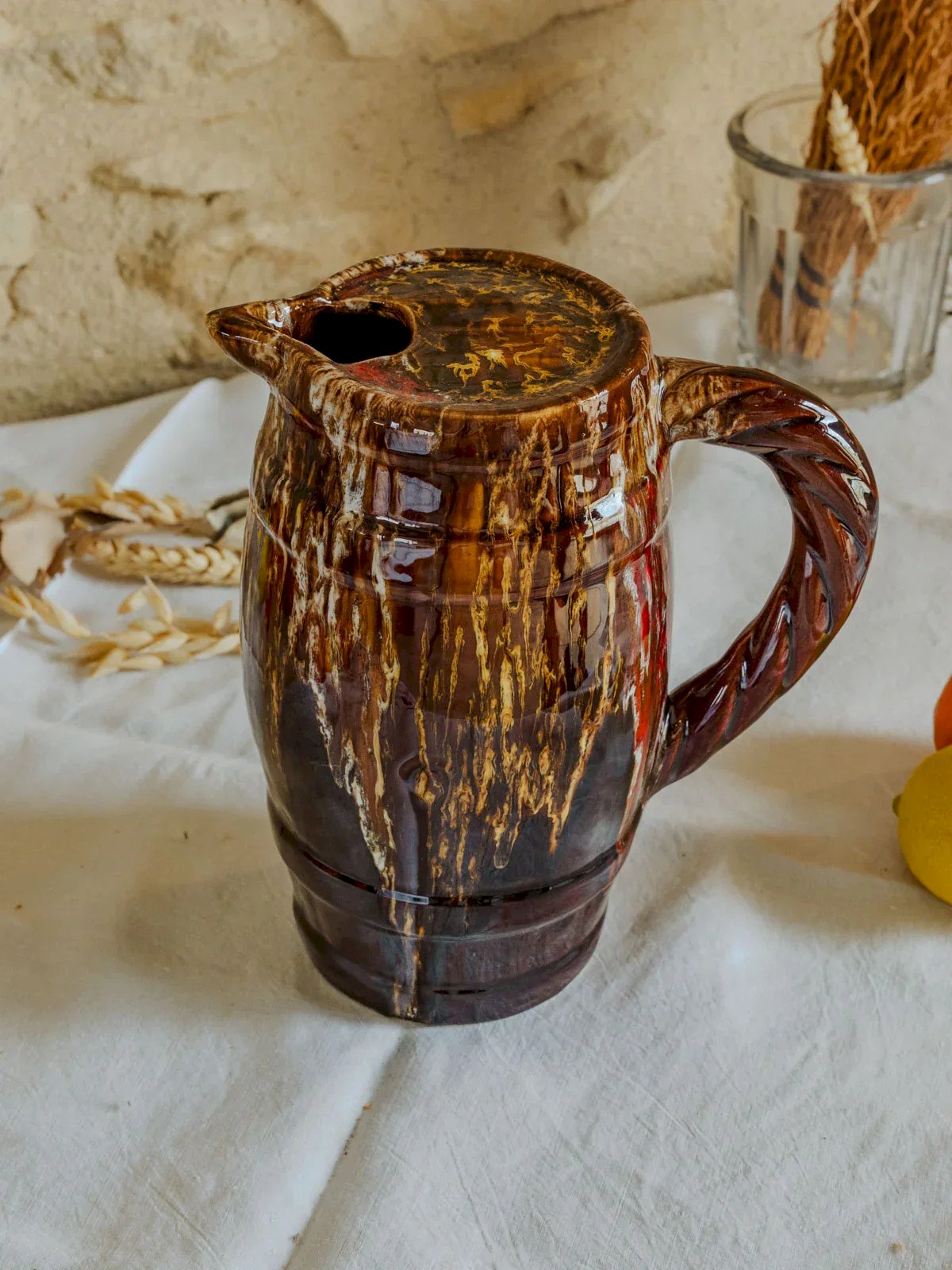 Embrace this 1950s glazed earthenware pitcher with a unique opening that gives it a distinctive personality. With a capacity of approximately one liter, it is perfect for serving water, juice, or wine at the table, while its glaze captures light and reveals subtle color nuances. Placed on an open shelf or at the center of a friendly table, it adds an authentic and warm touch to your interior. Height: 20 cm Diameter: 10 cm Width with handle: 18 cm Condition: Used: An item that has been used. Item showing some signs of superficial wear... Used: An item that has been used. Item showing some signs of superficial wear, fully operational and functioning correctly. It may be a display model or an item returned to the store after a brief period of use. Any imperfections. Brand: Debongout Type: Vintage product Material: Earthenware Style: Country