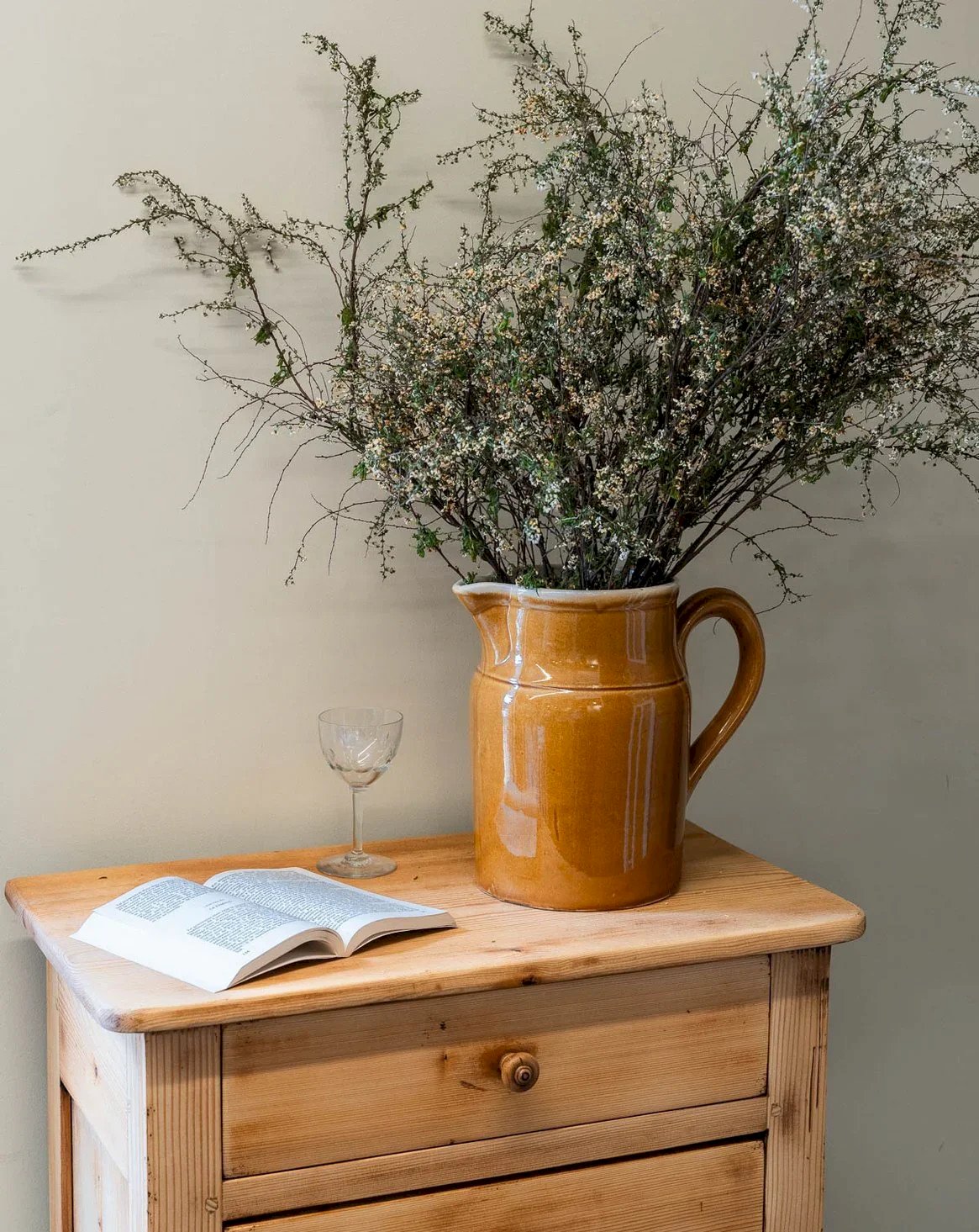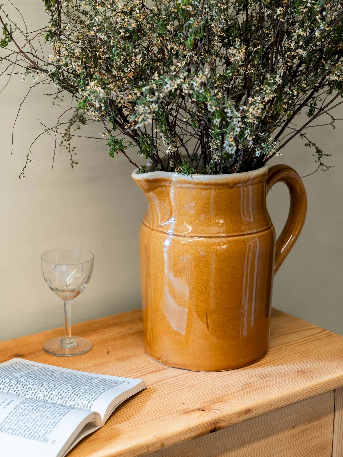 Add a retro touch to your table with this vintage mustard-colored ceramic pitcher. Its warm and bright hue will brighten your meals while adding a charming note to your decor. Meticulously crafted, this pitcher combines functionality and aesthetic appeal, making it ideal for serving your favorite drinks or as a decorative piece. A must-have for vintage style enthusiasts and authenticity lovers. Height: 25 cm Diameter: 16 cm Condition: Used item: Item has been used. Item shows some superficial signs of wear, fully operational and working correctly. It may be a demonstration model or an item returned to the store after a short period of use, with possible imperfections. Brand: Debongout Type: Thrifted product Material: Ceramic Style: Country