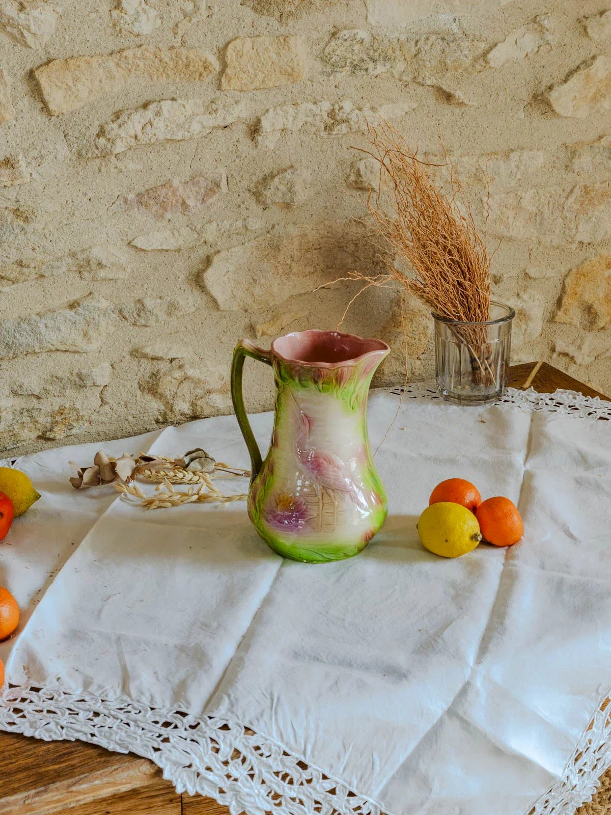 Bring a touch of artisanal elegance with this earthenware pitcher decorated with a heron, made using slip casting by Faïencerie Saint-Clément (model 508/4). Its slender shape and finely molded reliefs provide a delicate presence on a set table or shelf, ideal for serving water, infusion, or holding a small bouquet. The animal motif and ceramic finish establish a soft, country-like atmosphere conducive to warm and careful decoration. Height: 20 cm Diameter: 9.5 cm Width with handle: 14 cm Condition: Used: Item has been used. Item shows some signs of superficial wear... Used: Item has been used. Item shows some signs of superficial wear, fully operational and functioning correctly. It may be a display model or an object returned to the store after a short period of use. Any potential imperfections. Brand: Debongout Type: Vintage product Material: Earthenware