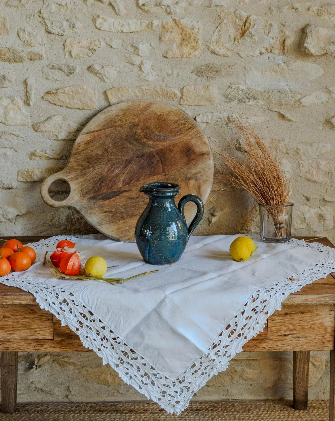 Adopt this deep blue glazed stoneware carafe, signed Bandat, which reveals vintage charm and artisanal craftsmanship. Its one-liter capacity and harmonious silhouette make it ideal for serving water, juice, or infusions at the table, while providing a balanced presence on a buffet or shelf. The shiny glaze highlights the variations of blue and the pottery material gives a warm texture, perfect for instilling a cozy and elegant atmosphere. Height: 19.5 cm Diameter: 10 cm Width with handle: 18 cm Condition: Used item; item showing some superficial signs of wear, fully operational and functioning correctly. It may be a demonstration model or an item returned to the store after a short period of use, including any imperfections. Brand: Debongout Type: Curated product Material: Stoneware Style: Country.
