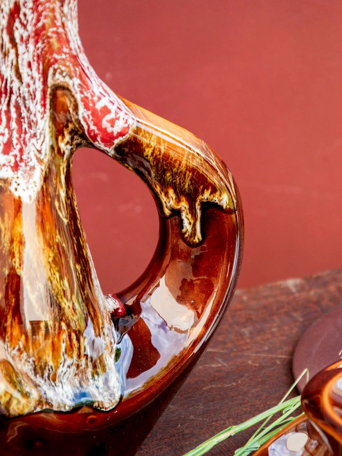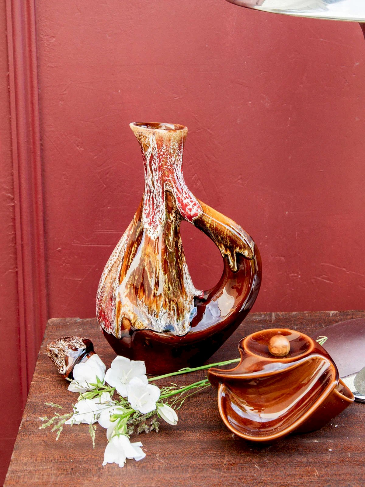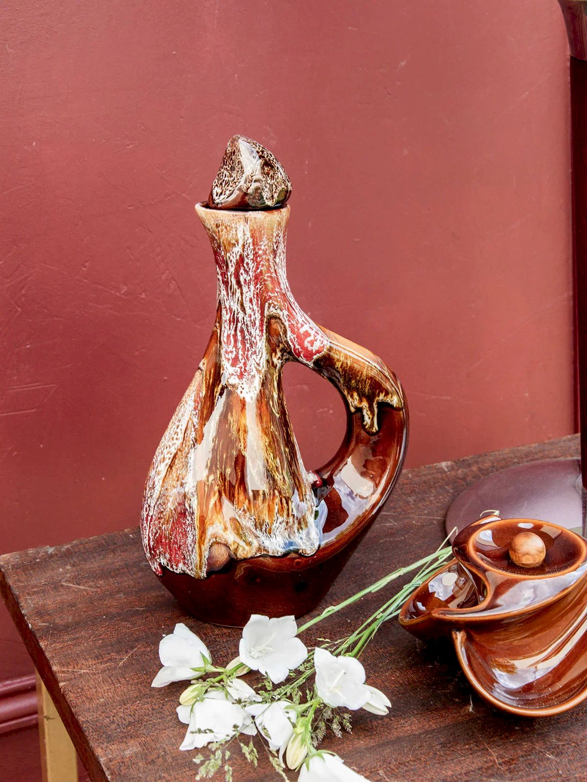 Discover this elegant handcrafted liquor carafe from the 1960s, a true treasure from Vallauris, France. Made of glazed ceramic, it features a beautiful dark brown hue fading to an orange speckled with white, adding a vintage and warm touch to your decor. Perfect for enhancing your table or fitting into a collection, this unique piece will delight lovers of authenticity and craftsmanship. Length: 17 cm Width: 9 cm Height: 30 cm Condition: Used item: Item that has been used. Item showing some superficial signs of wear, fully operational and functioning correctly. It may be a demonstration model or an item returned to the store after a short period of use. Any imperfections. Brand: Debongout Type: Thrifted Product Material: Ceramic Style: Country