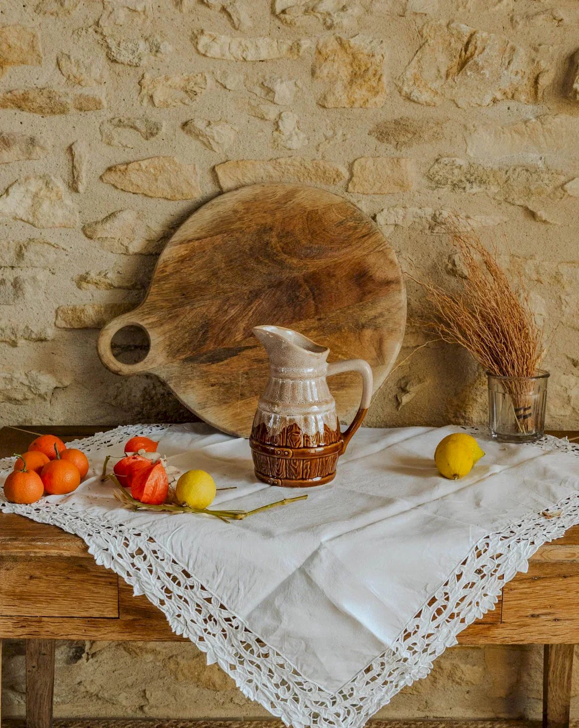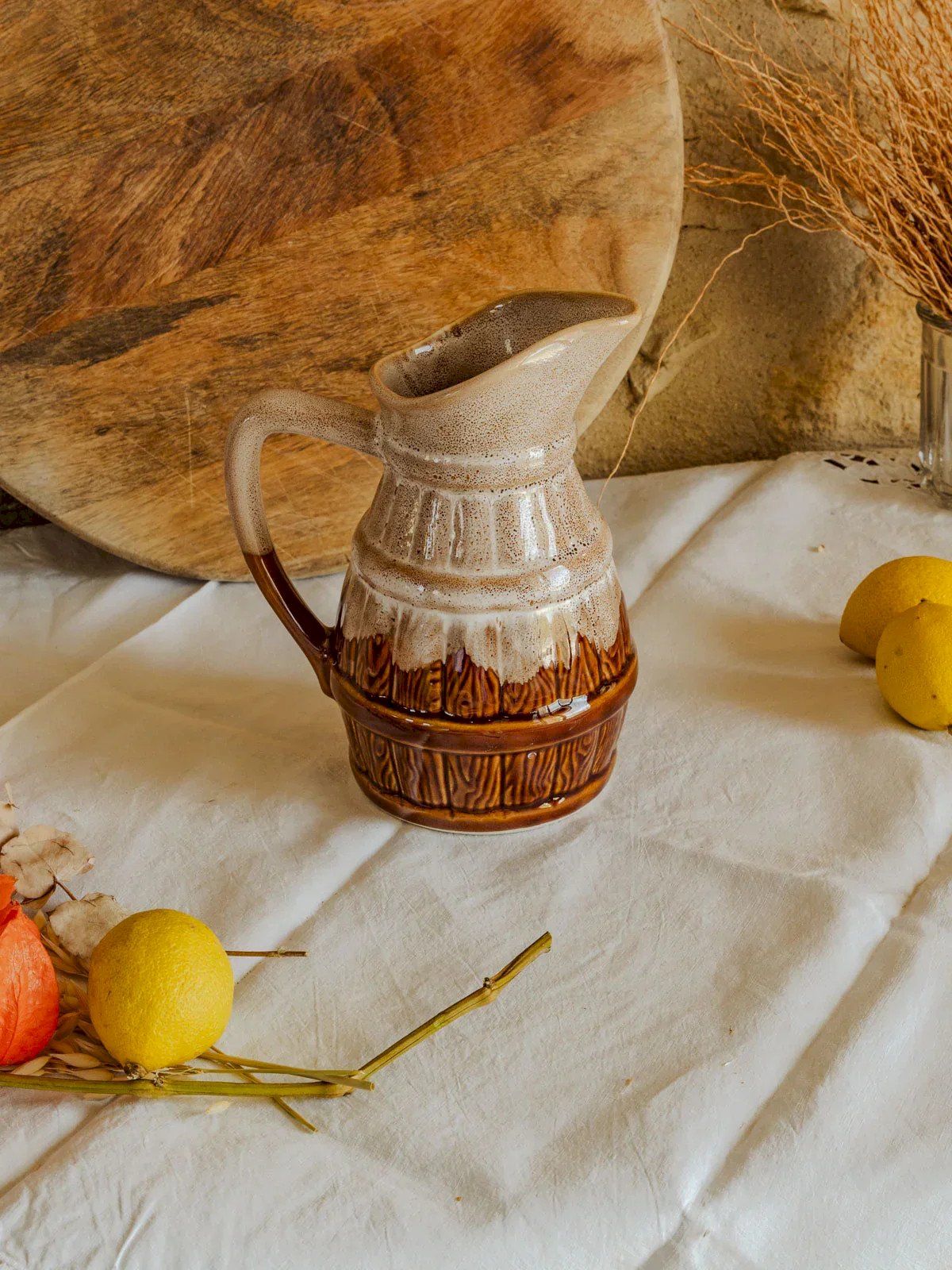 Discover this glazed pottery carafe in shades of brown and beige, evoking the softness and typical style of the 50s. With a capacity of one liter, its balanced silhouette and contained proportions make it perfect for serving at the table or as a centerpiece. The satin glaze highlights the artisanal material and captures light to create a warm and authentic atmosphere. Use it as a vase for small floral arrangements as well. Height: 19 cm Diameter: 11 cm Width with handle: 15 cm Condition: Used: Item has been used. Item shows some superficial signs of wear, ... Used: Item has been used. Item shows some superficial signs of wear, fully operational and functioning correctly. It may be a demonstration model or an item returned to the store after a short period of use. any imperfections. Brand: Debongout Type: Vintage product Material: Earthenware Style: Country