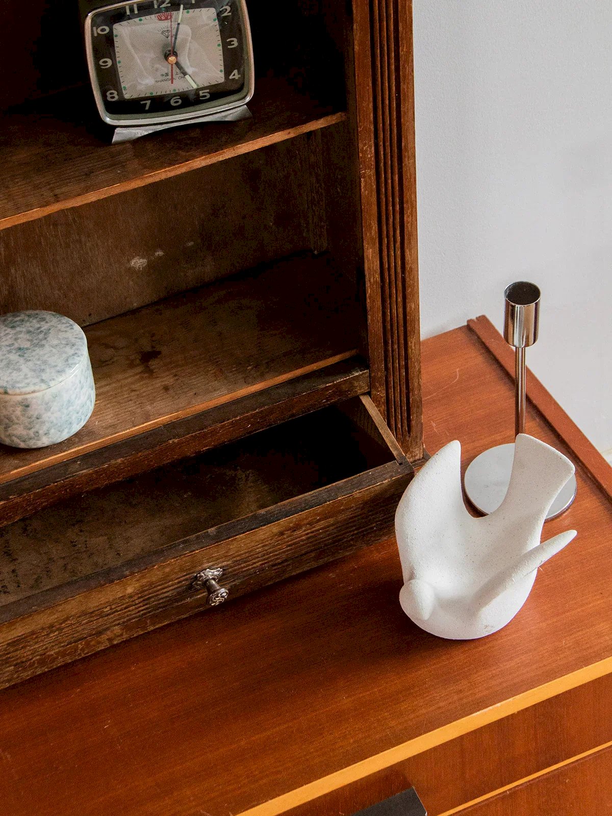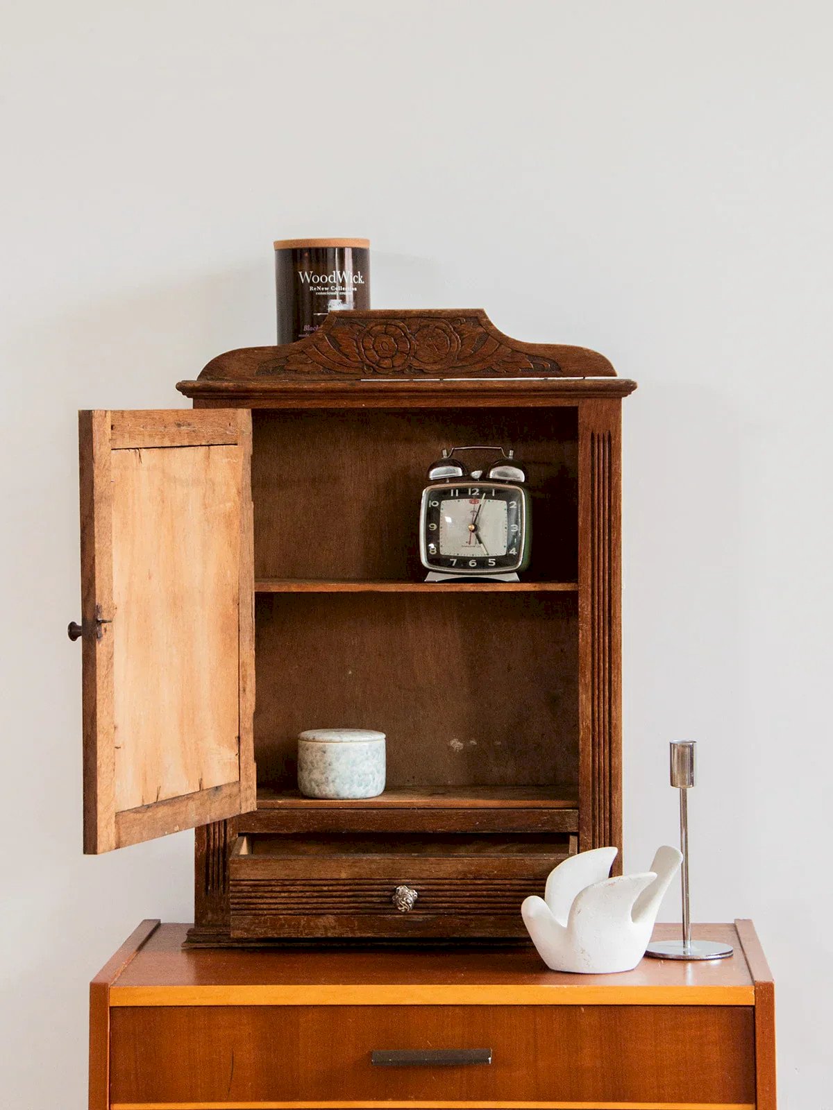 Discover our elegantly adorned wooden medicine cabinet featuring floral details. Practical and aesthetic, it is equipped with a mirror and a drawer for optimal storage of your essentials. Its metal handles add a modern touch, while its design allows it to be hung on the wall for space-saving. Opening to the left, this cabinet combines functionality and charm in the heart of your bathroom or kitchen. Length: 42 cm Width: 14 cm Height: 58 cm Drawer height: 7 cm Condition: Used: Item has been used. Item shows some superficial signs of wear, ...Used: Item has been used. Item shows some superficial signs of wear, fully operational and functioning correctly. It may be a demonstration model or a returned item after a short period of use. potential imperfections. Brand: Debongout Type: Curated product Material: Wood Customized: Shelves Style: Country
