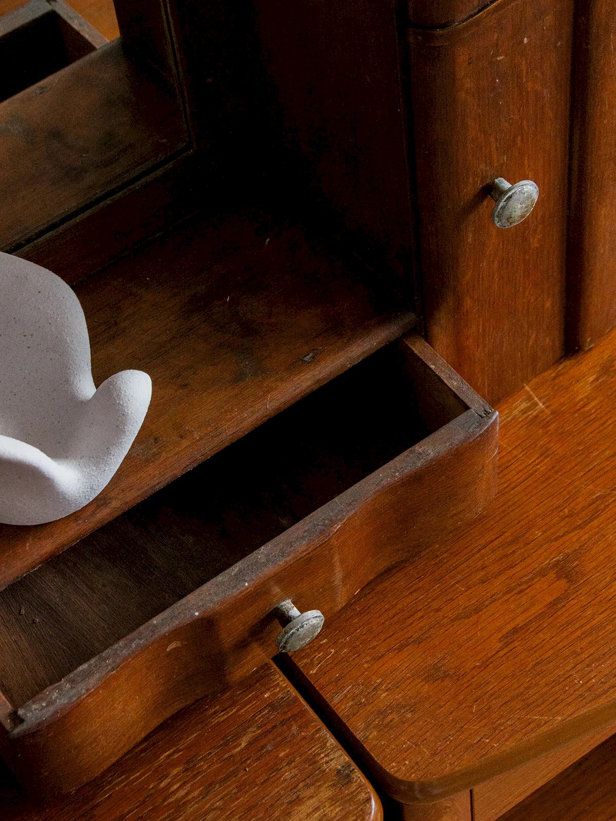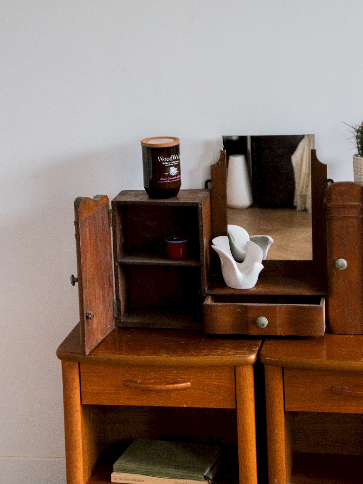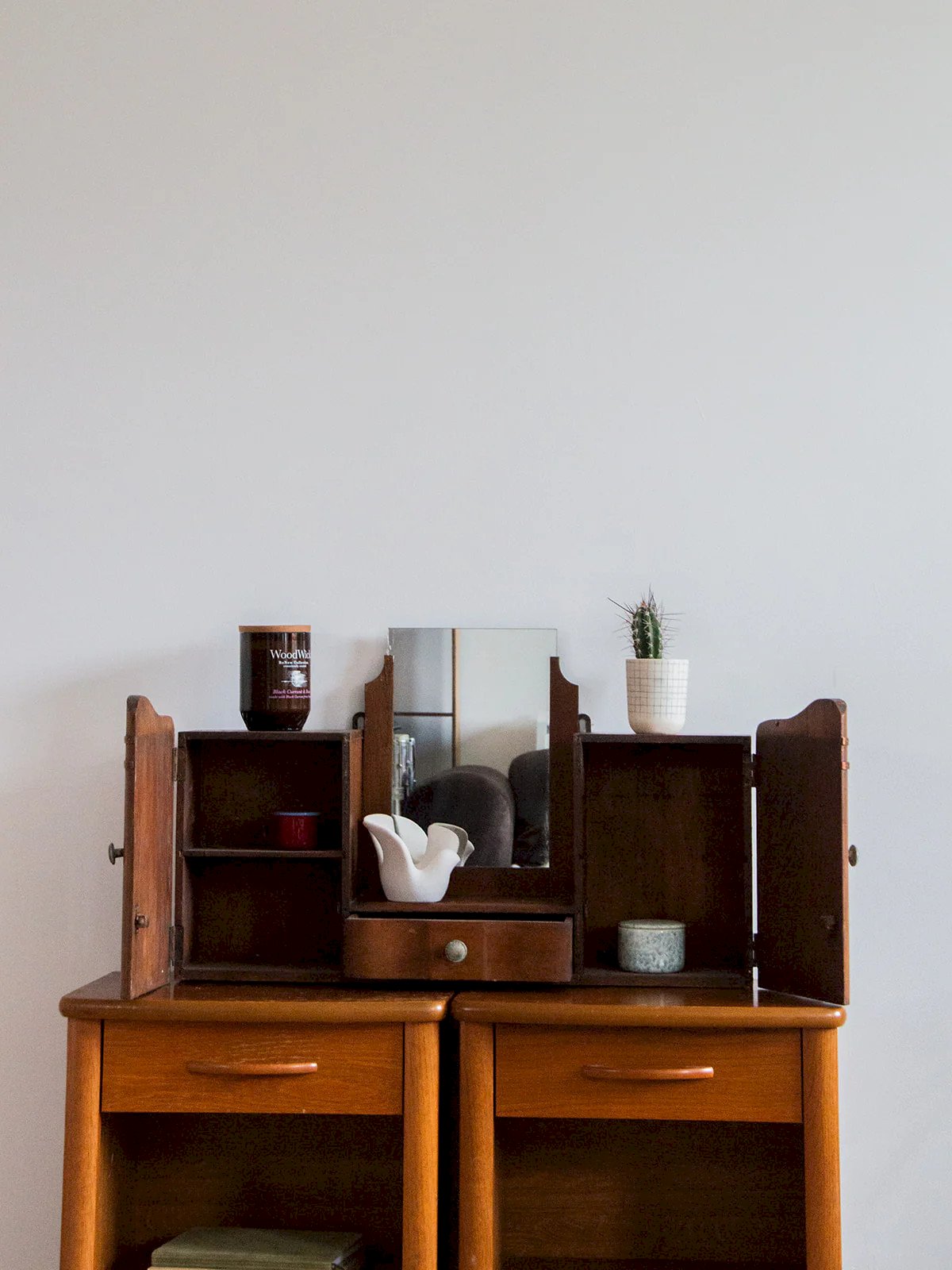 Discover this elegant Art Deco medicine cabinet, adorned with a central rectangular mirror that will add a touch of sophistication to your interior. Made entirely of wood, it perfectly combines aesthetics and functionality. Its two small cabinets and drawer provide practical storage space for all your essentials while preserving a charming vintage look. An ideal choice to enhance your bathroom or kitchen. Length: 70 cm Width: 15 cm Height: 43 cm Drawer height: 6 cm Niche height: 28 cm Condition: Pre-owned: Item has been used. Item showing some superficial signs of wear,... Pre-owned: Item has been used. Item showing some superficial signs of wear, fully operational and functioning properly. It may be a demonstration model or a returned item after a short period of use. possible imperfections. Brand: Debongout Type: Vintage product Material: Wood, Glass Custom: Shelves Style: Country