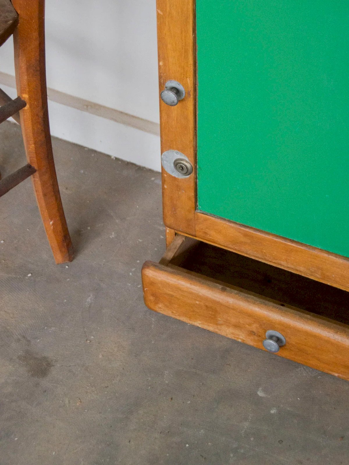 Invite this light wood bathroom cabinet with a discreet charm into your bathroom; its door covered with green plexiglass adds a colorful and contemporary touch while protecting the interior. Compact and thoughtfully proportioned, it offers smart storage for daily care items, bottles, and small accessories. Its bright wood and sleek silhouette create a soft and organized atmosphere, ideal for modern and understated interiors. Length: 40 cm Width: 20 cm Height: 63 cm Drawer height: 5 cm Condition: Used: Item that has been used. Item showing some superficial signs of wear... Used: Item that has been used. Item showing some superficial signs of wear, fully operational and functioning correctly. It may be a demonstration model or an item returned to the store after a short period of use. any potential imperfections. Brand: Debongout Type: Thrifted product Material: Wood Customized: Shelves Style: Country
