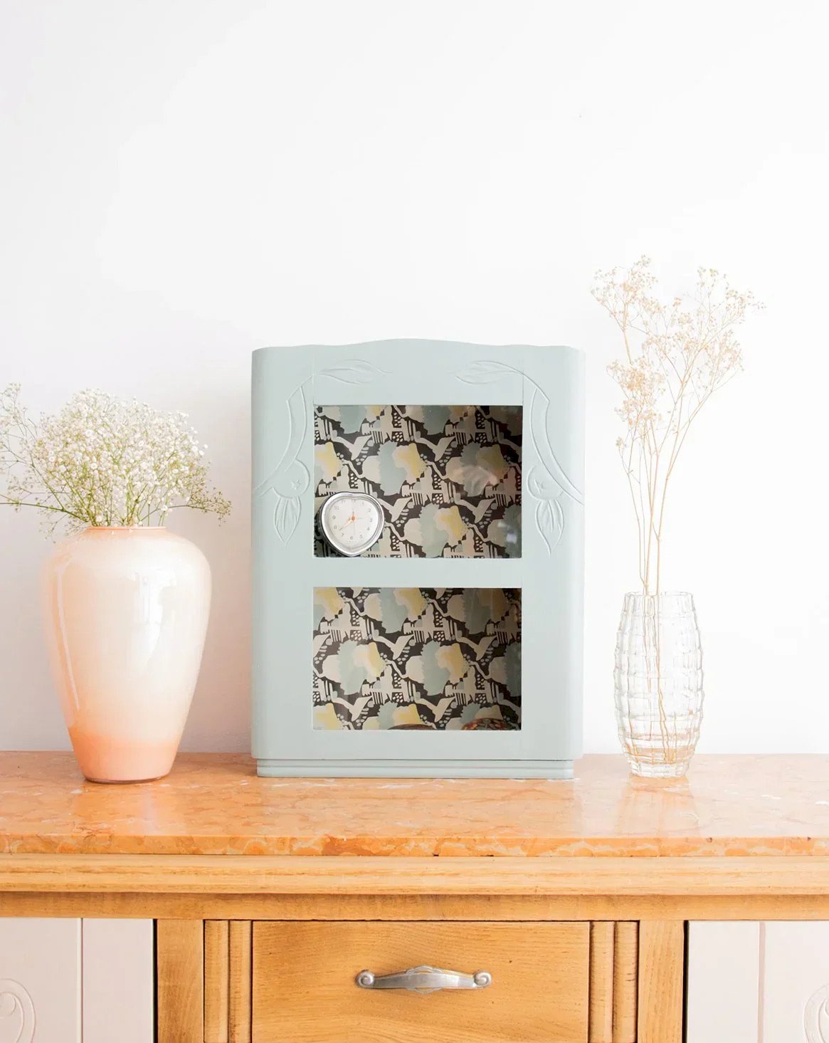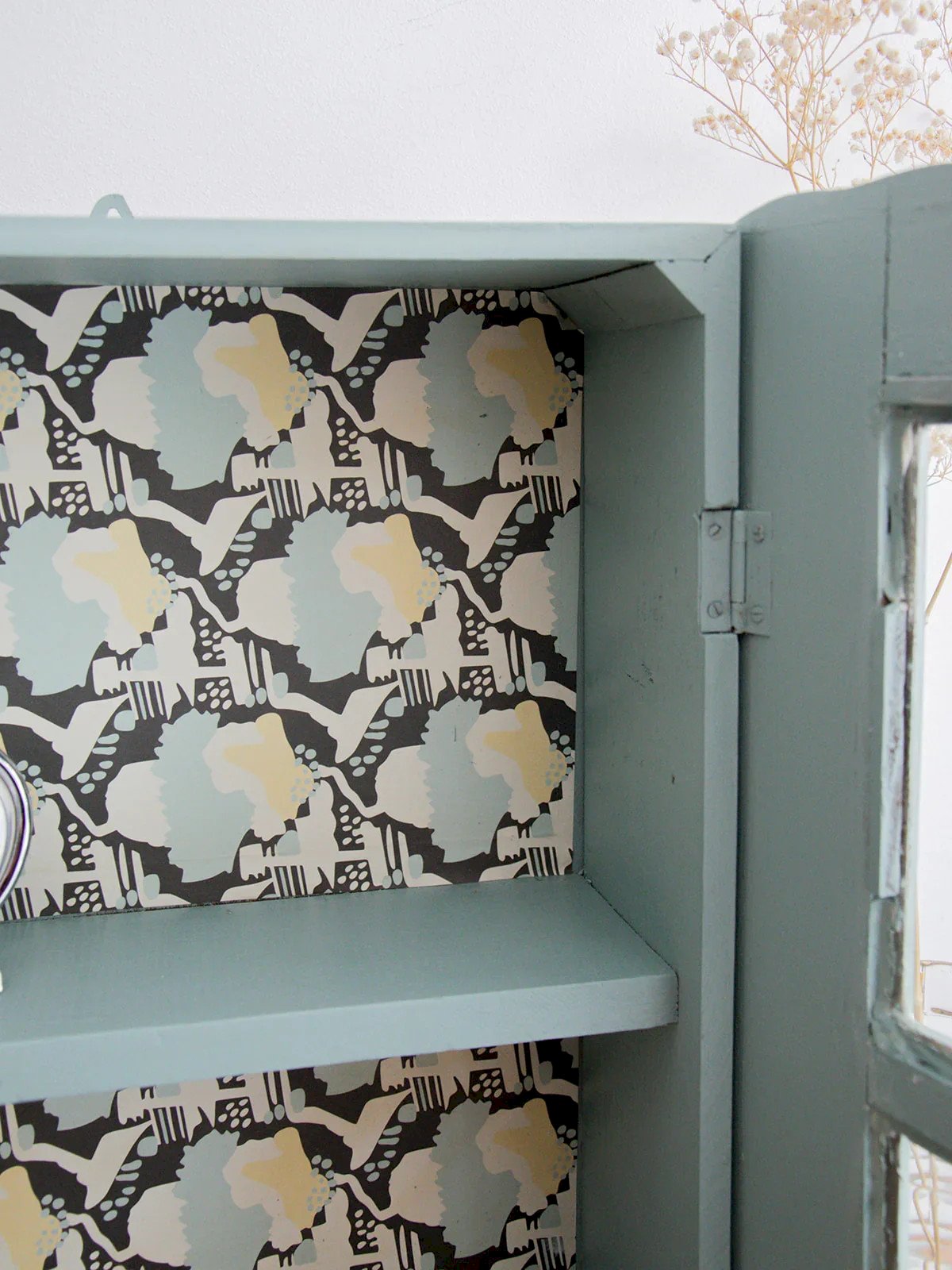 Bring a touch of elegance to your bathroom with this blue Art Deco cabinet. Its wallpaper with delicate patterns and glass door allow you to showcase your accessories in style. Practical and functional, it features a spacious shelf and two hooks on the back for easy wall mounting. Perfect for small spaces, it fits seamlessly into your decor. Width: 41.5 cm Height: 51 cm Depth: 15 cm Condition: Used item. Item shows some superficial signs of wear, fully operational and functioning correctly. It may be a display model or a return item after a short period of use. Any imperfections. Brand: Debongout Type: Vintage product Material: Wood Custom: Shelves Style: Country.