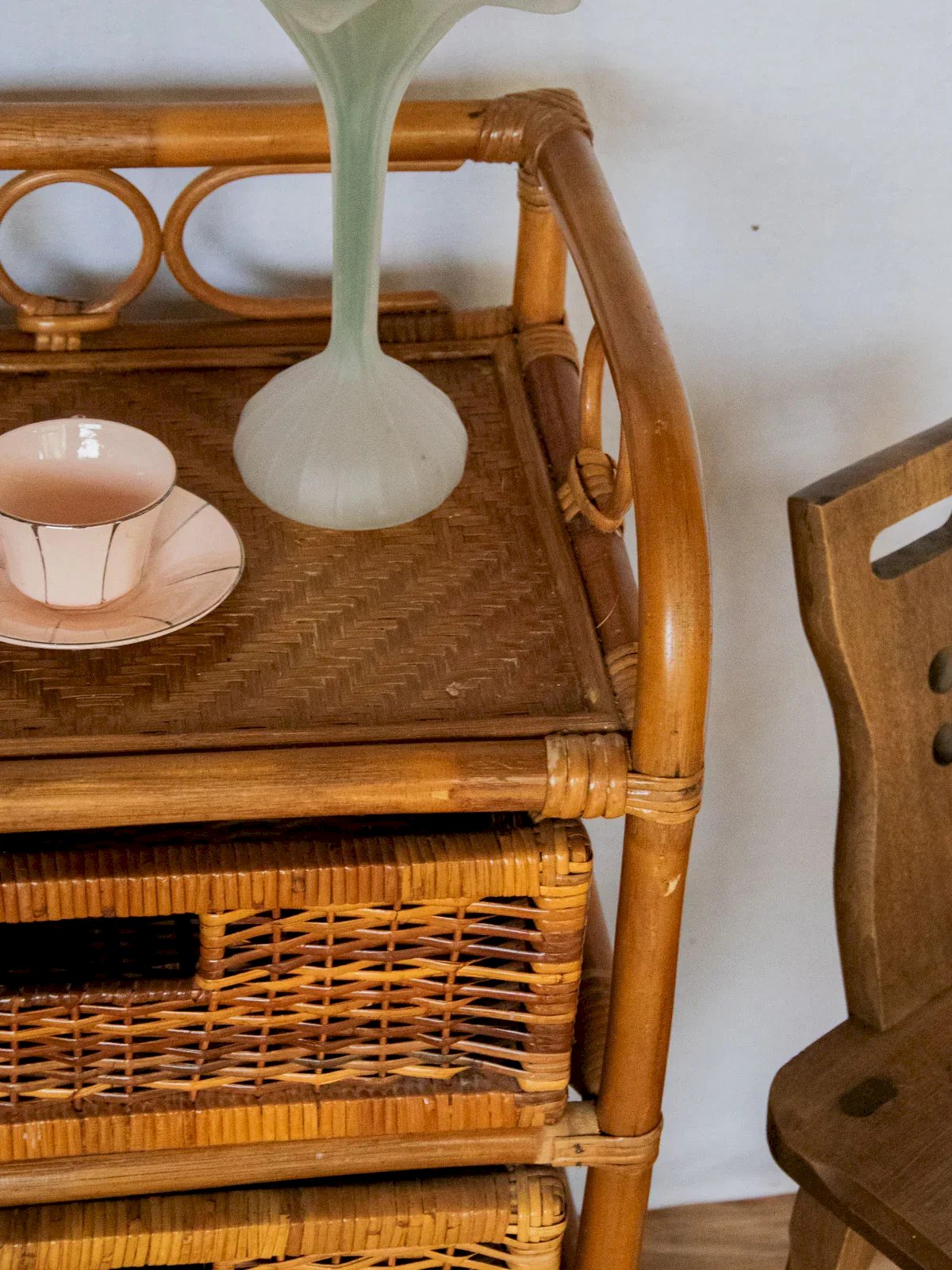 Invite this rattan shelf into your home to bring a natural and light touch: its open architecture combines an open shelf and three practical drawers for organizing papers, small items, or textiles. The woven rattan highlights a chic and bright bohemian style, suitable as an accent piece in an entryway, living room, or bedroom where it creates a soft and welcoming atmosphere. Light signs of wear are present. Length: 46 cm Width: 35 cm Height: 65 cm Drawer height: 11 cm Condition: Used: An item that has been utilized. Item showing some superficial wear marks, fully operational and functioning correctly. It may be a demonstration model or an item returned to the store after a short period of use. Any potential imperfections. Brand: Debongout Type: Curated product Material: Rattan Style: Country Custom: Shelves
