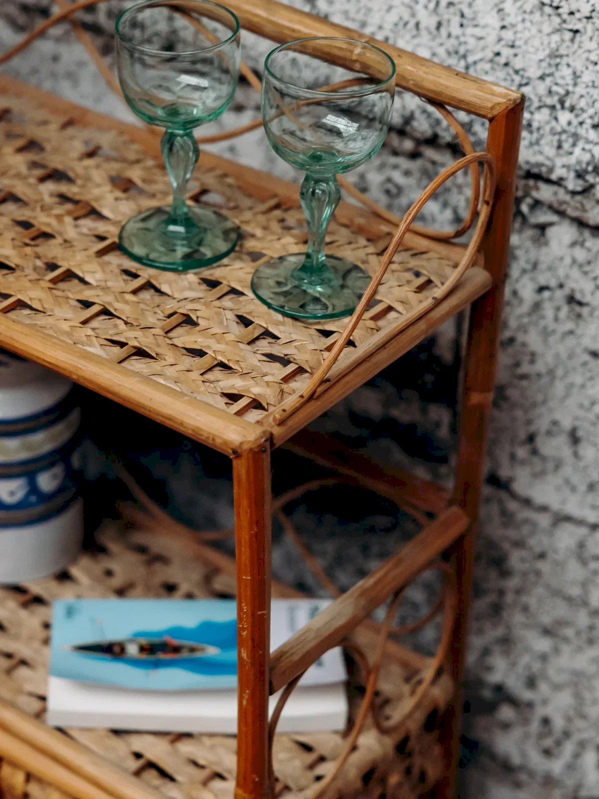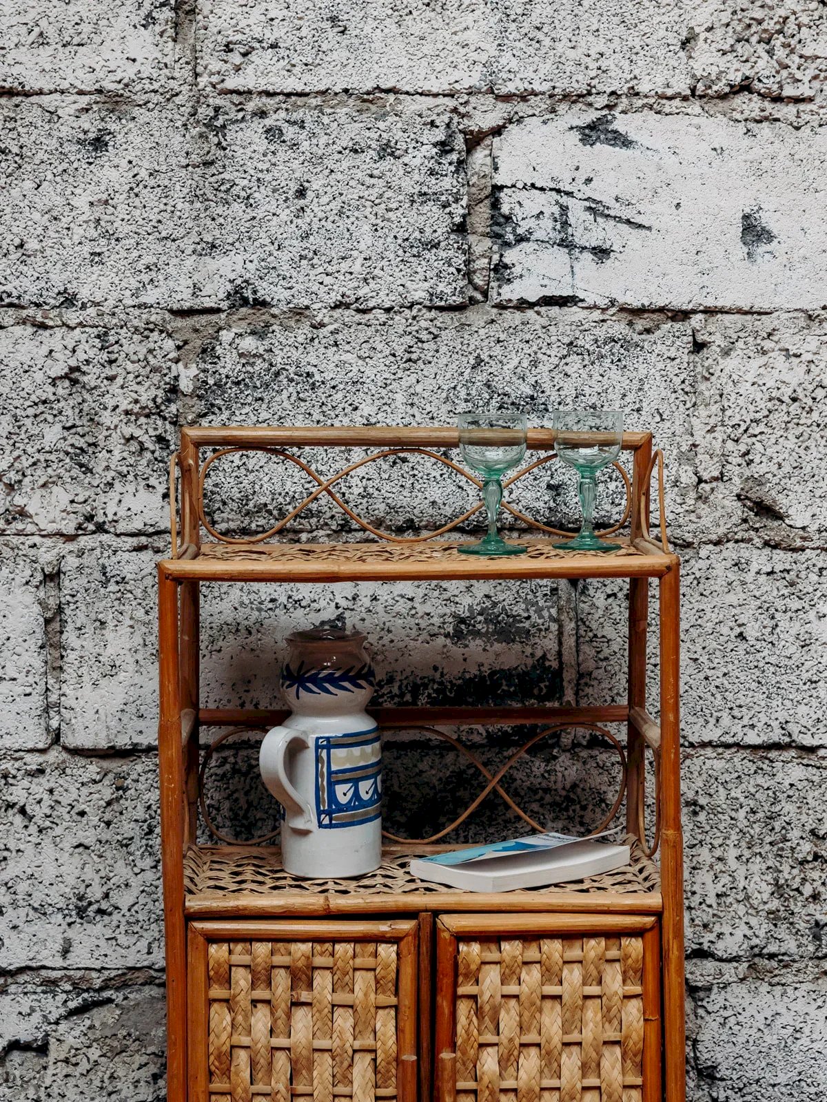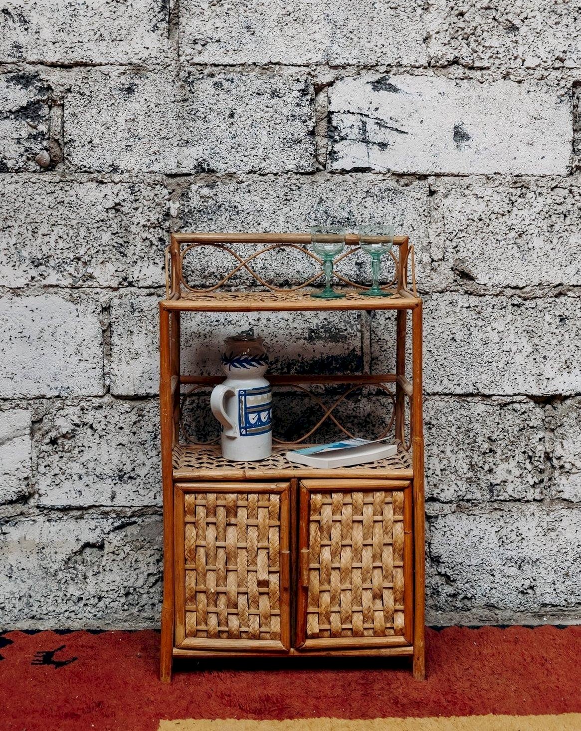 Add a natural and bohemian touch to your interior with this rattan storage unit. Featuring two doors, it combines charm and practicality to organize your items while enhancing your decor. Ideal for a warm and authentic atmosphere. Length: 45 cm Height: 77 cm Depth: 22 cm Door height: 29 cm Condition: Used: Item has been used. Item shows some superficial wear marks, ... Used: Item has been used. Item shows some superficial wear marks, fully operational and functioning properly. It may be a demonstration model or an item returned to the store after a short period of use, with possible imperfections. Brand: Debongout Type: Vintage Product Material: Rattan Style: Country Customized: Shelves