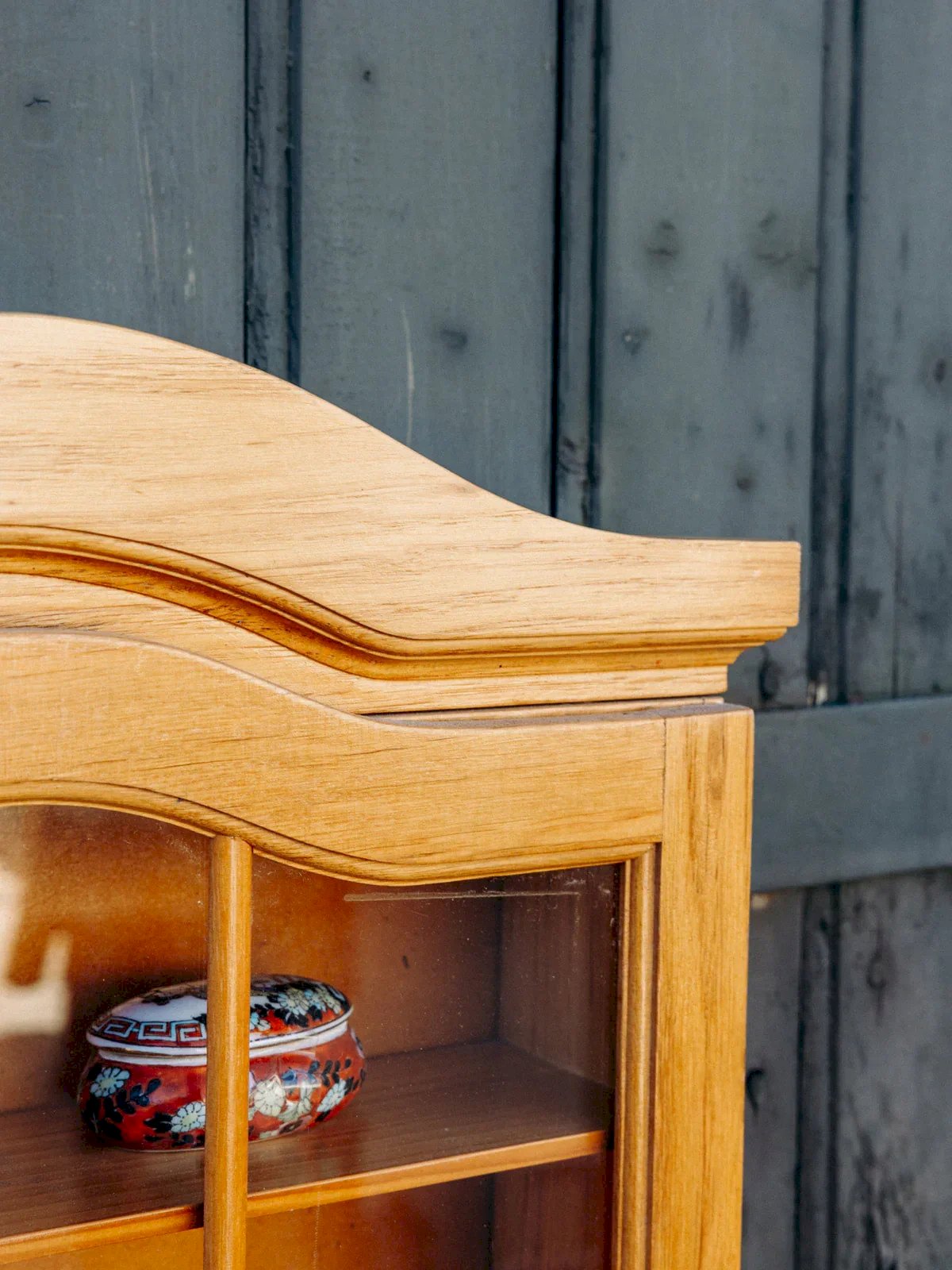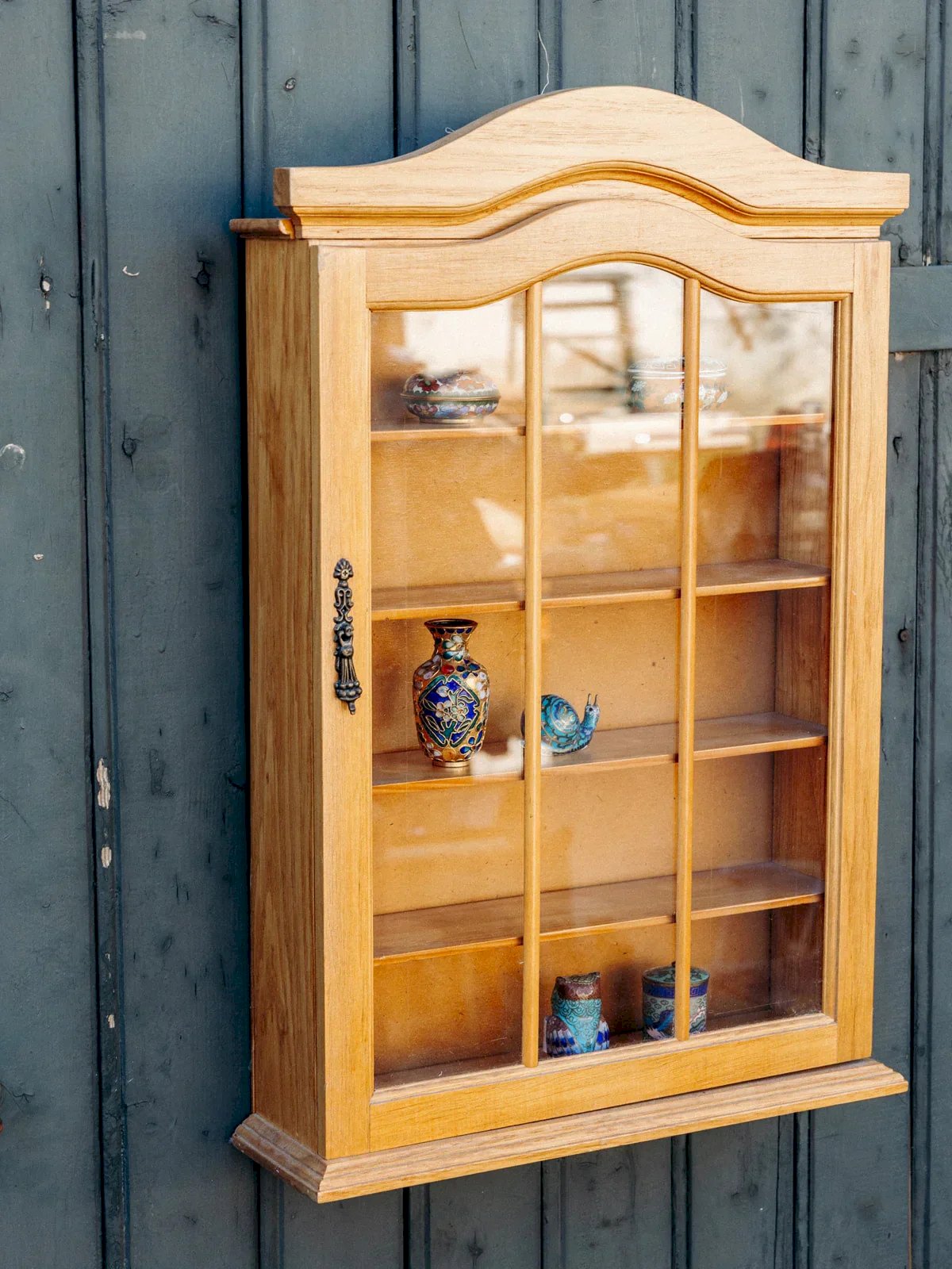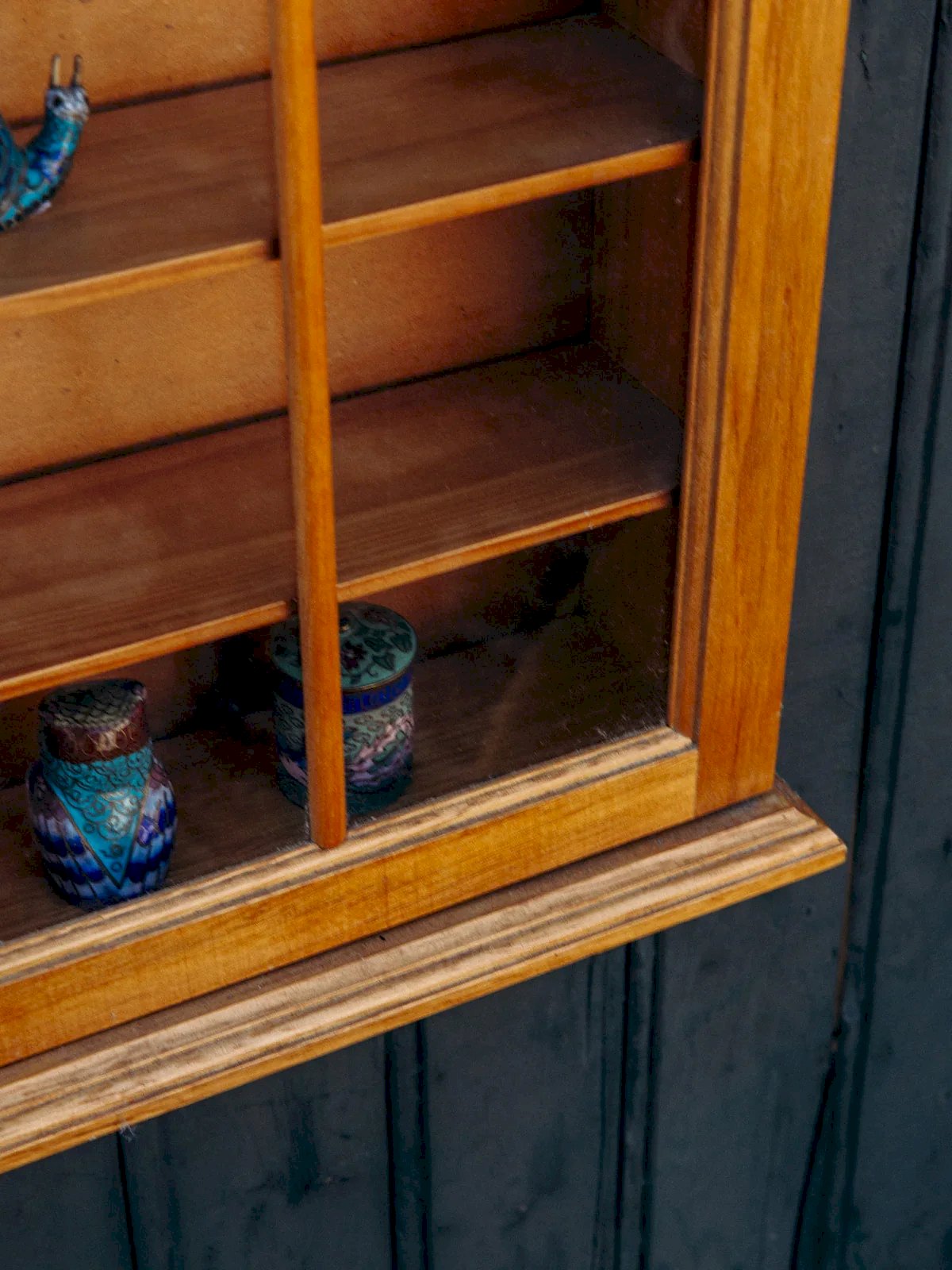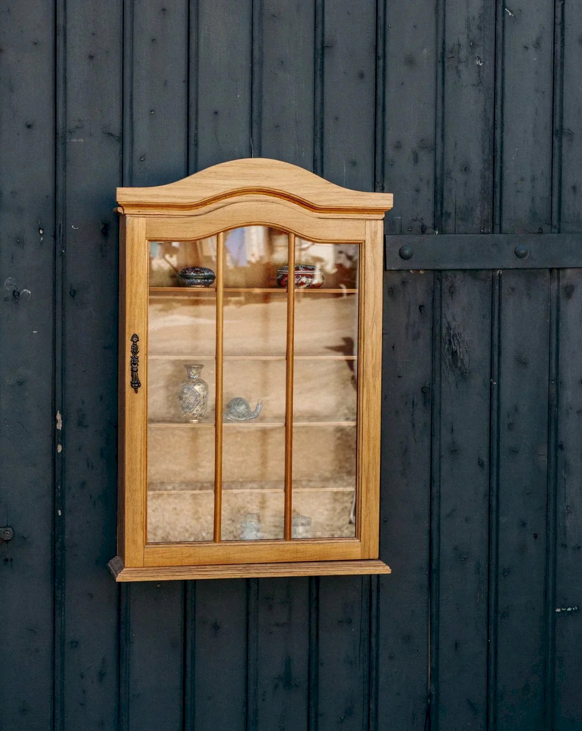 Discover our light wood hanging showcase, perfect for highlighting your favorite objects. Its four shelves provide elegant storage while adding a vintage touch to your decor. The intricately designed black metal handle and the rounded wood embellishments on top add a unique charm to this functional piece of furniture. A perfect choice for a chic and practical style. Width: 35 cm Height: 57 cm Depth: 9 cm Niche height: 9 cm Condition: Used: Item has been used. Item shows some superficial signs of wear, fully operational and working correctly. It may be a demonstration model or a store return after a short period of use. Any imperfections. Brand: Debongout Type: Thrifted product Material: Wood, Glass Style: Country Customized: Shelves