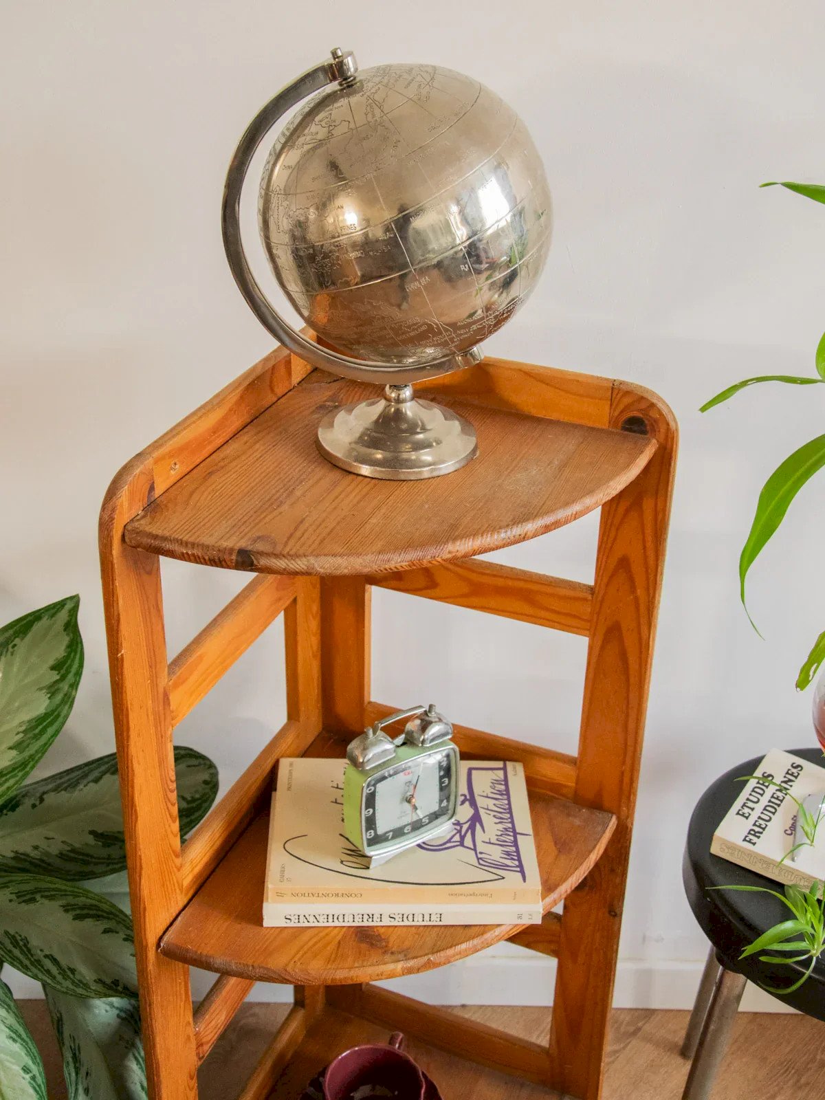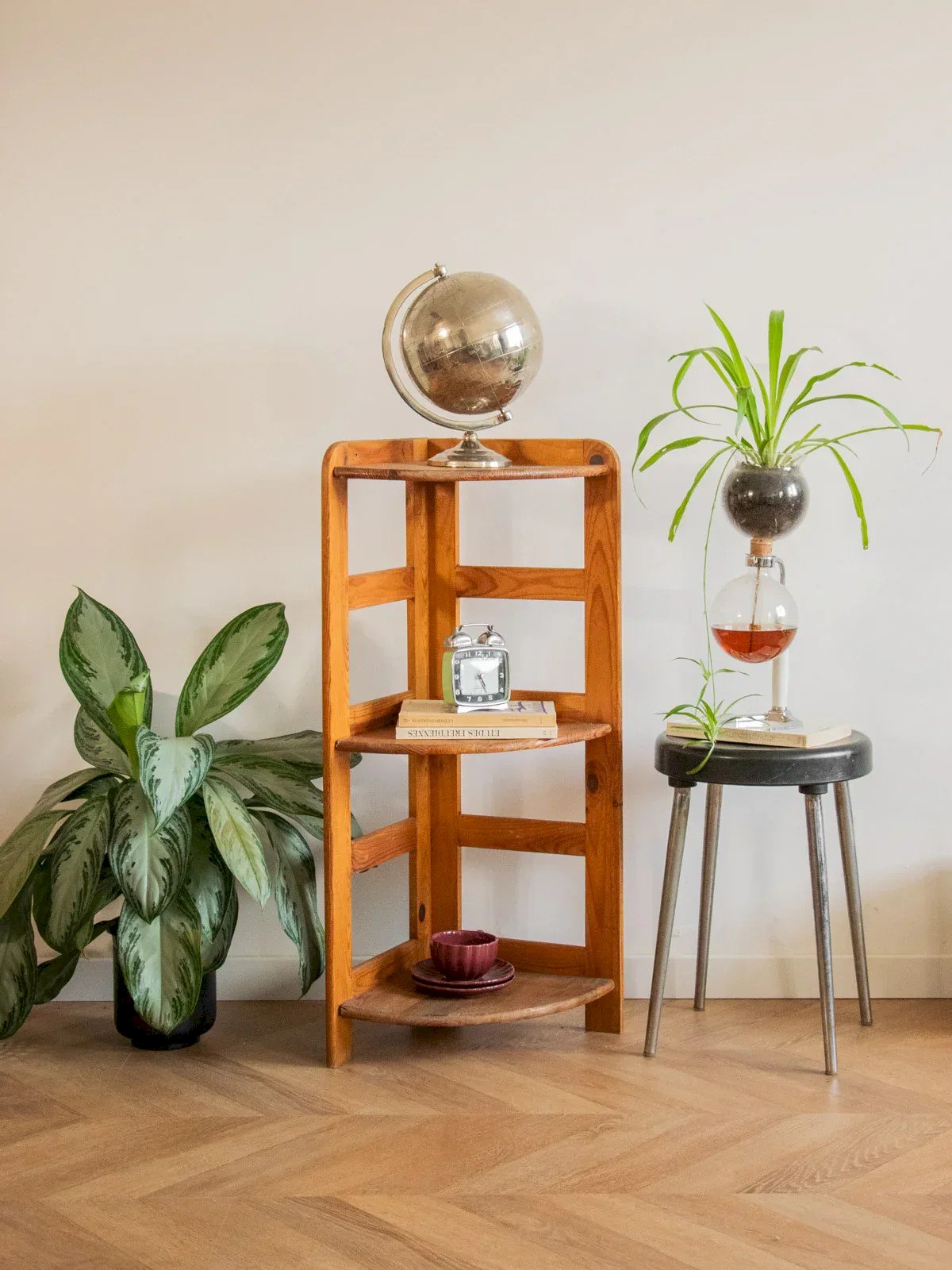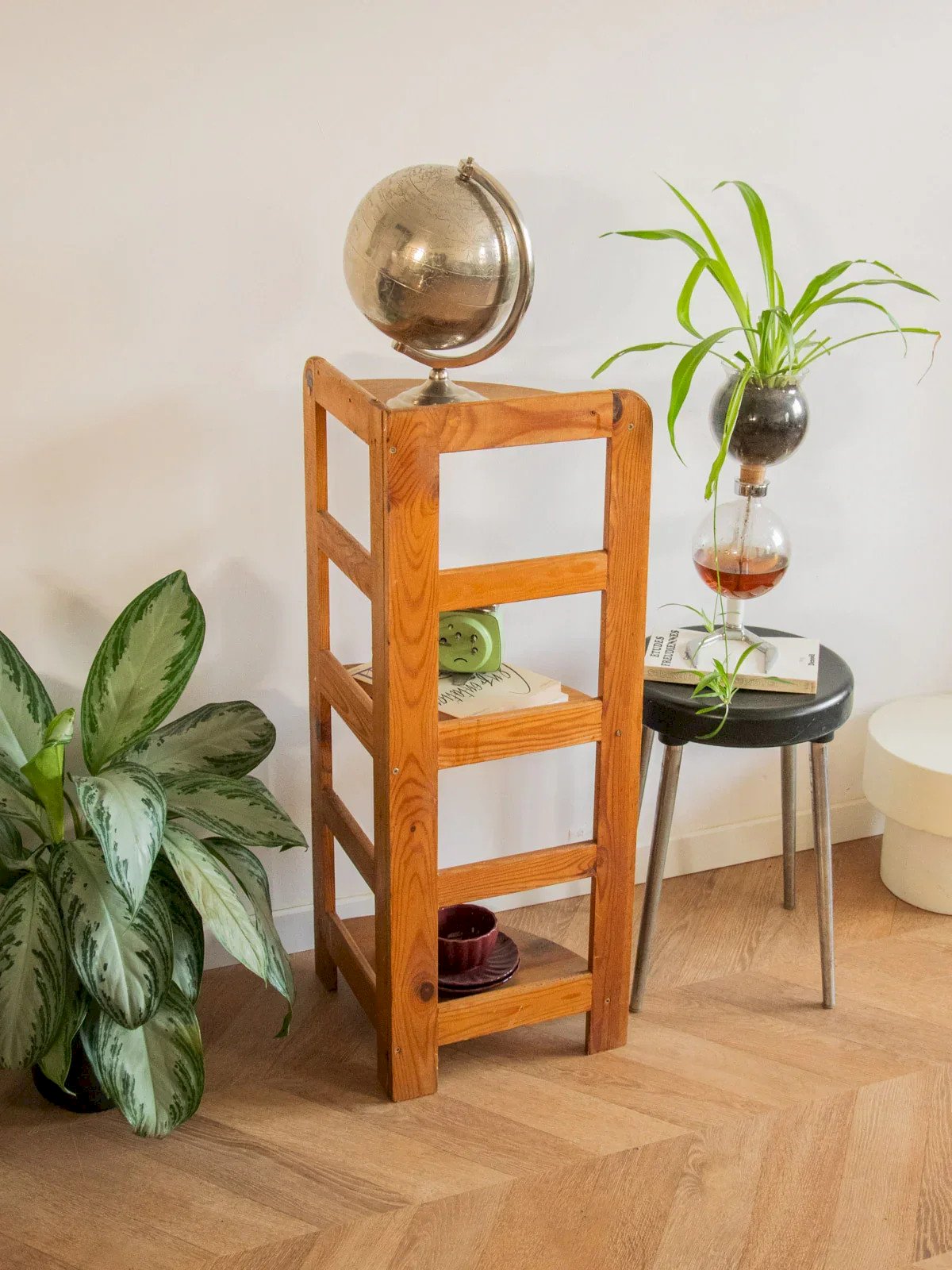 Discover the understated elegance of the dark wood corner shelf, a piece of furniture ideal for optimizing space while adding a warm touch to your interior. Its clever design allows it to fit perfectly into corners, providing practical storage for your books, plants, or decorative items. Made from quality wood, this shelf combines sturdiness and aesthetics, making every corner of your room a functional and harmonious space. Add character to your decor with this refined and contemporary piece. Signs of wear present. Length: 46 cm Width: 33 cm Height: 89 cm Height of the upper niche: 37.5 cm Height of the lower niche: 37 cm Condition: Used: Item has been used. Item shows some superficial wear marks...Used: Item has been used. Item shows some superficial wear marks, fully operational and functioning correctly. It may be a display model or a product returned to the store after a short period of use. Any imperfections. Brand: Debongout Type: Vintage product Material: Wood Style: Country Customized: Shelves