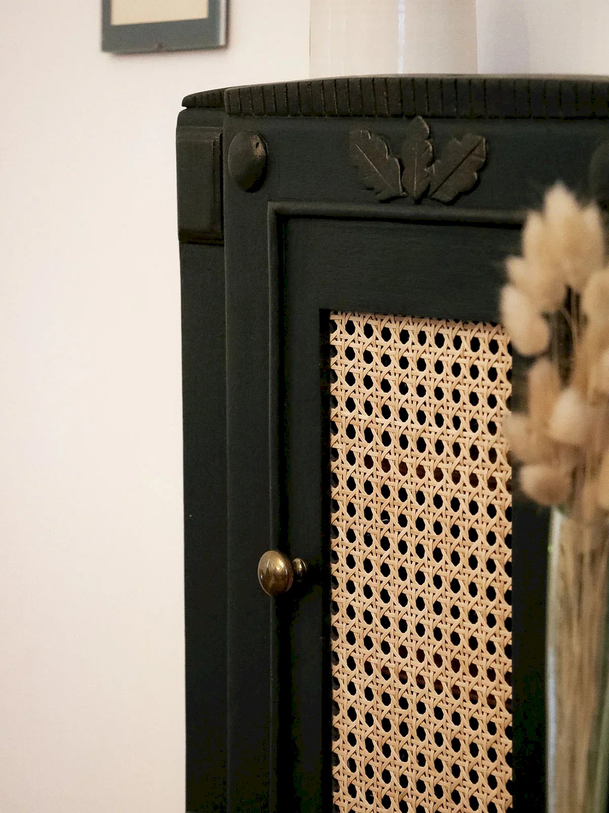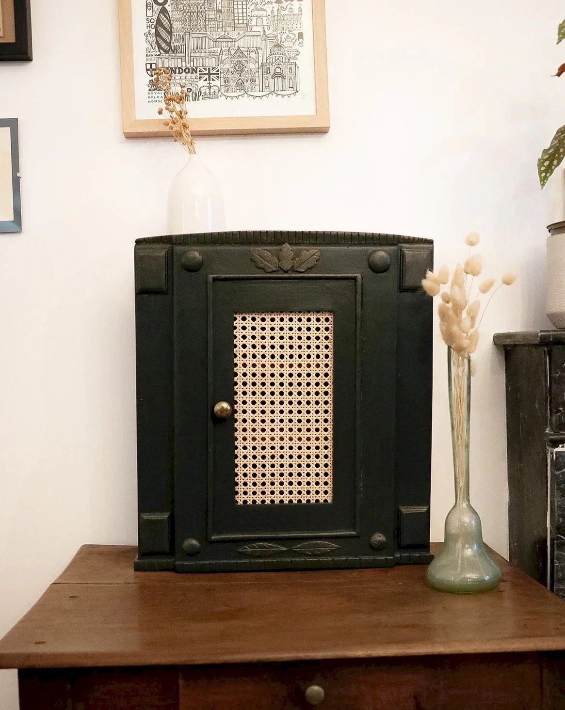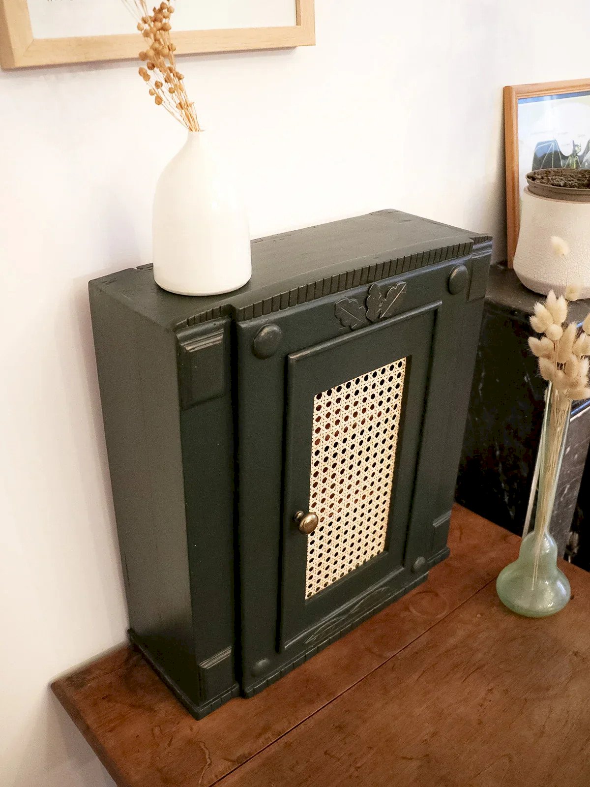 Discover this 1960s solid wood medicine cabinet, adorned with engraved patterns and a cane door that gives it a discreet retro charm. Its vintage brass handle and compact proportions make it an ideal piece to place in a sink corner or an entrance, offering several practical compartments thanks to its interior shelves for organizing bottles and small accessories. Its warm and understated style creates a refined and welcoming ambiance. Length: 42 cm Width: 16.5 cm Height: 48 cm Shelf heights: 14 / 10 / 15 cm Condition: Used: Item that has been used. Item shows some superficial signs of wear,...Used: Item that has been used. Item shows some superficial signs of wear, fully operational and functioning correctly. It may be a display model or an item returned to the store after a short period of use. Any potential imperfections. Brand: Debongout Type: Vintage product Material: Wood Custom: Shelves Style: Country