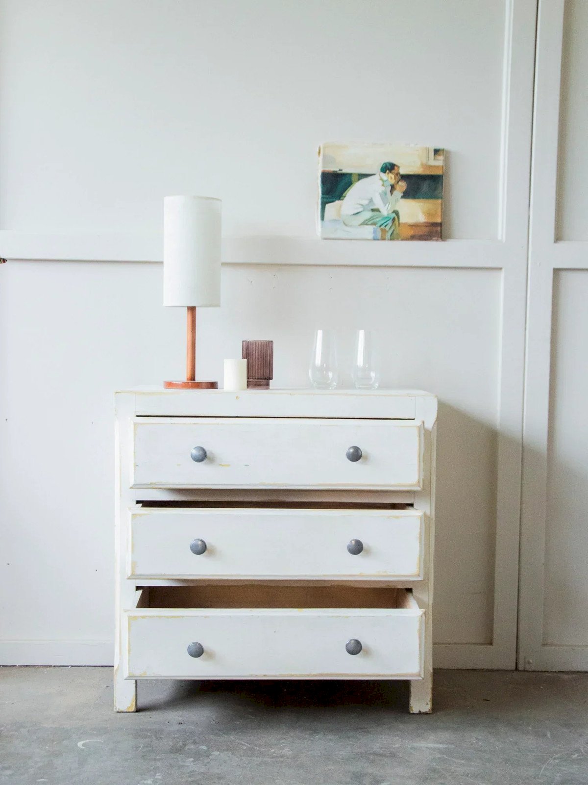 Discover this 1960s wooden chest of drawers, delicately sanded to reveal a lovely white patina where an old layer of yellow paint is still visible, giving it a unique personality. Its single drawer offers generous storage, suitable for a bedroom or an entryway, and its balanced proportions fit well in both contemporary and vintage interiors. The original metal handles add a touch of authenticity. There are some signs of use that contribute to its authenticity. Length: 80 cm Width: 40 cm Height: 80 cm Drawer height: 14 cm Condition: Used: Item has been used. Item shows some signs of superficial wear, fully operational and functioning correctly. It may be a display model or an item returned to the store after a short period of use, with possible imperfections. Brand: Debongout Type: Vintage Product Material: Wood, Metal Style: Rustic Customizable: Dressers