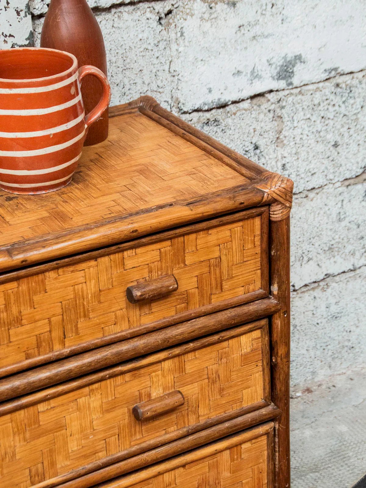 Discover this charming rattan and wood dresser, featuring three spacious drawers for practical and aesthetic storage. Although its top shows some black wear marks, this adds a vintage character to this unique piece of furniture. Its elegant lines and natural design will fit perfectly into your interior, bringing a bohemian touch to your decor. Ideal for a bedroom or living room, it brilliantly combines functionality and style. Length: 80 cm Width: 46 cm Height: 74 cm Drawer height: 11 cm Condition: Used: An item that has been used. Item showing some signs of superficial wear, fully operational and functioning correctly. It may be a demonstration model or an item returned to the store after a short period of use. Possible imperfections. Brand: Debongout Type: Vintage product Material: Rattan Style: Country Customized: Dressers