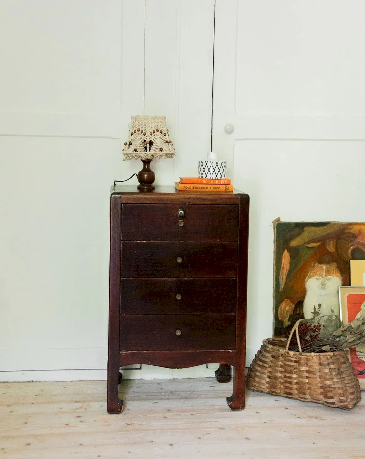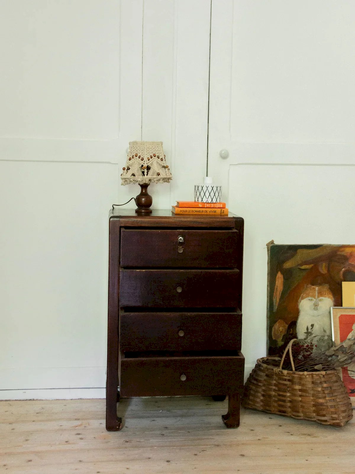 Add a touch of timeless vintage elegance to your interior with this refined wooden piece, perfect for optimizing your storage space. Featuring four drawers with round handles and small inward-turned legs, it combines practicality with aesthetics. Its subtle design easily blends into any room of the house, bringing both style and functionality. An essential choice for a practical and elegant arrangement. Length: 50 cm Width: 35 cm Height: 80 cm Drawer height: 9 to 11 cm Condition: Used: Item that has been used. Item showing some superficial signs of wear... Used: Item that has been used. Item showing some superficial signs of wear, fully operational and functioning correctly. It may be a demonstration model or a returned item after a short period of use, including any imperfections. Brand: Debongout Type: Thrifted product Material: Wood Style: Country Personalized: Dressers