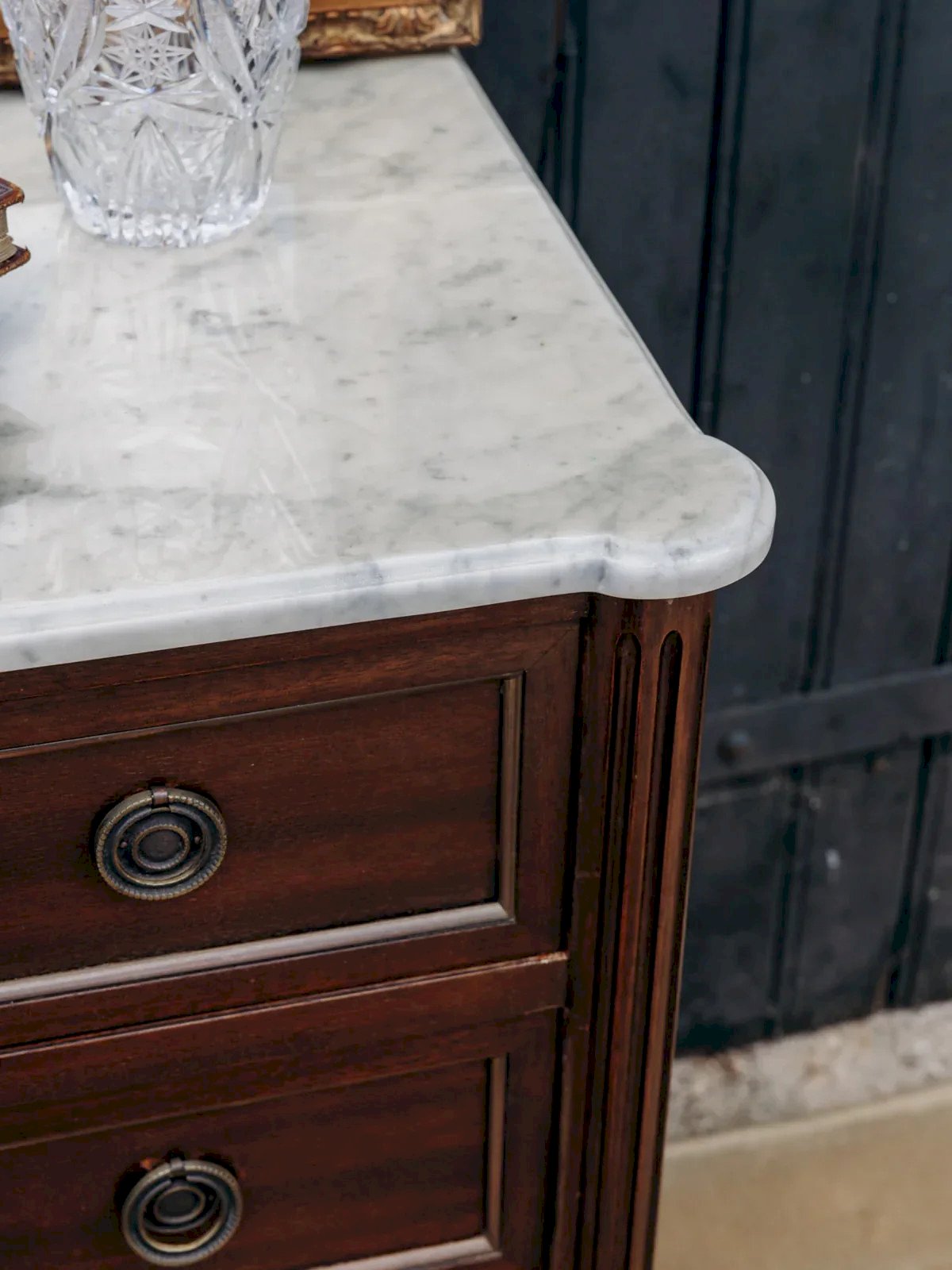 With its dark wood and pretty white marble, this Louis XVI chest of drawers has everything to please. Its three drawers with locks and keys make it a piece of furniture that is both practical and full of character. A classic piece that easily fits into all interiors. Length: 100 cm Height: 80 cm Drawer height: 13.5 cm Depth: 41.5 cm Condition: Used: Item has been used. Item showing some superficial wear marks, fully operational and functioning correctly. It may be a demonstration model or an item returned to the store after a short period of use. Possible imperfections. Brand: Debongout Type: Vintage product Material: Wood, Marble Style: Country Customized: Dressers