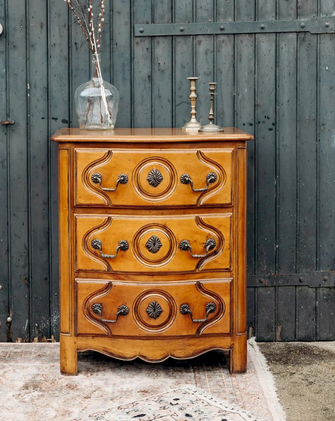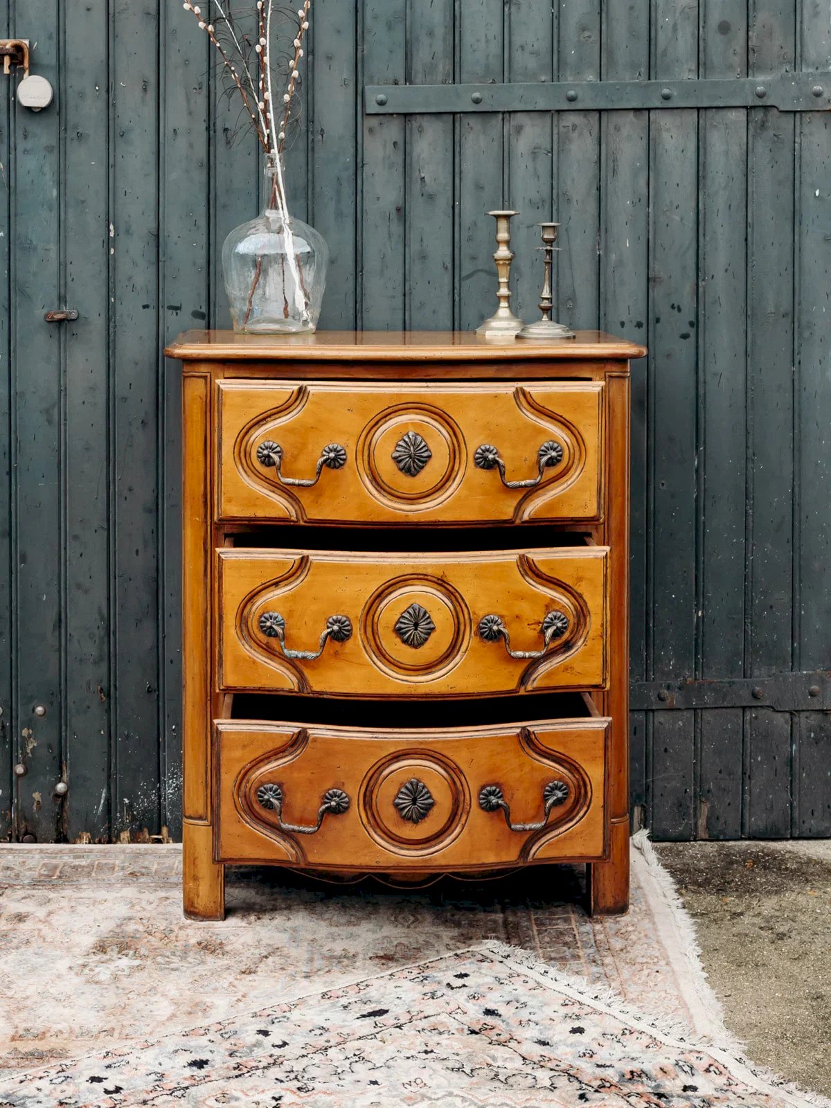 Discover this elegant and functional wooden dresser that combines style and practicality. Its three carefully crafted drawers cannot be removed from the structure, ensuring optimal storage. A piece that integrates harmoniously into any interior, combining modern design and everyday utility. Width: 79.5 cm Height: 56 cm Drawer height: 19 cm Depth: 56 cm Condition: Used: Item that has been used. Item showing some superficial wear marks, fully operational and functioning properly. It may be a demonstration model or an item returned to the store after a short period of use, with possible imperfections. Brand: Debongout Type: Curated product Material: Wood Style: Country Customizable: Dressers
