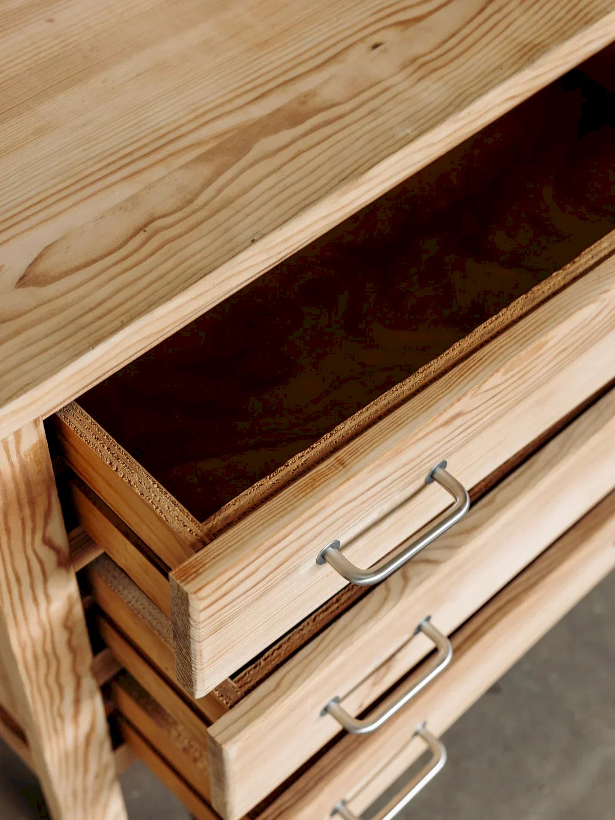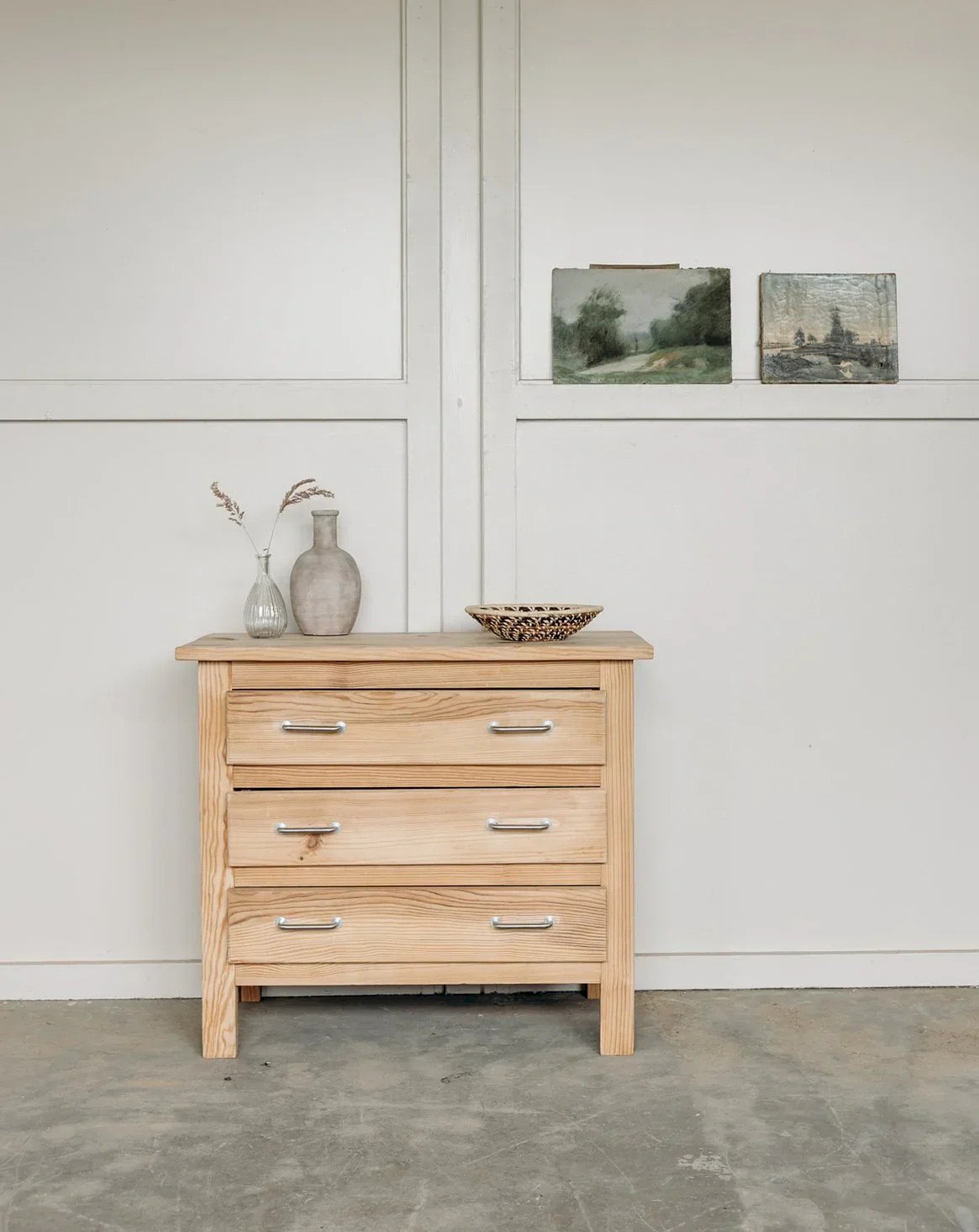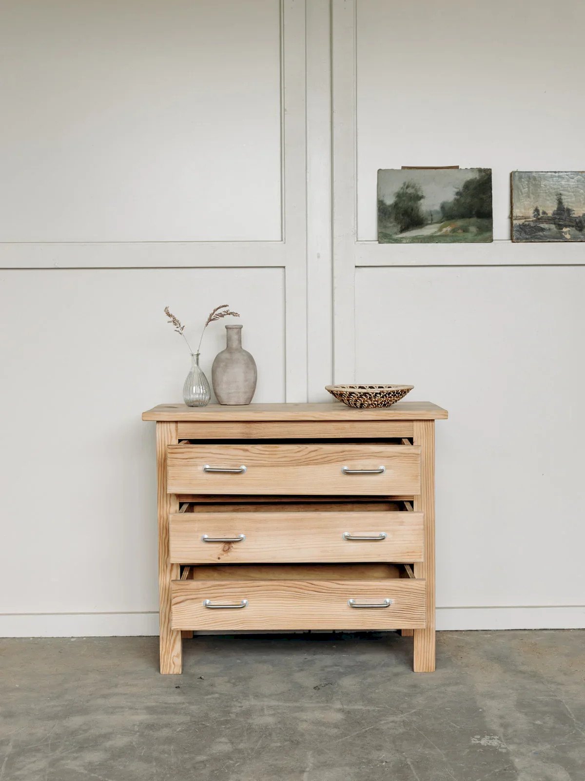 Discover this three-drawer chest with a sleek and elegant look, perfect for adding character to your interior. Its wood has been fully sanded to reveal a warm natural hue. The long metal handles highlight its clean lines with an industrial touch. Functional and aesthetic, it offers a nice storage space. A must-have for a decor that is both practical and refined. Length: 83 cm Height: 73 cm Drawer height: 10 cm Depth: 43 cm Condition: Used: Item that has been used. Item showing some superficial signs of wear,... Used: Item that has been used. Item showing some superficial signs of wear, fully operational and working properly. It may be a demonstration model or an item returned to the store after a short period of use. Any imperfections. Brand: Debongout Type: Vintage product Material: Wood, Metal Style: Country Custom: Dressers