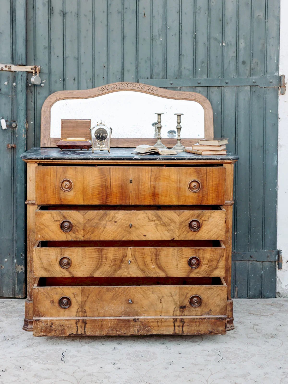 Enhance your interior with this secretary chest of drawers featuring a mix of dark and light wood, accented by round handles and delicate curves, topped with a black grey marble top that adds elegance and sobriety. Four drawers organize the storage, with the first concealing small inner drawers for sorting papers and supplies, offering generous capacity without overwhelming the space. Ideal for an office or an entrance with contemporary and timeless accents. Length: 118 cm Width: 58 cm Height: 96 cm Height under the top: 72 cm Height of drawers: 16 / 14 / 14 / 22 cm Condition: Used: Item has been used. Item shows some superficial signs of wear... Used: Item has been used. Item shows some superficial signs of wear, fully operational and functioning correctly. It may be a demonstration model or a returned item after a short period of use. any possible imperfections. Brand: Debongout Type: Vintage product Material: Wood, Marble Style: Country Custom: Dressers
