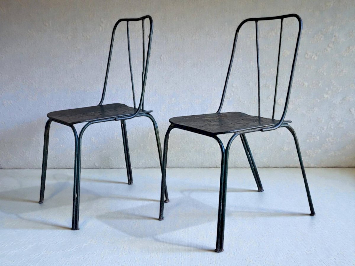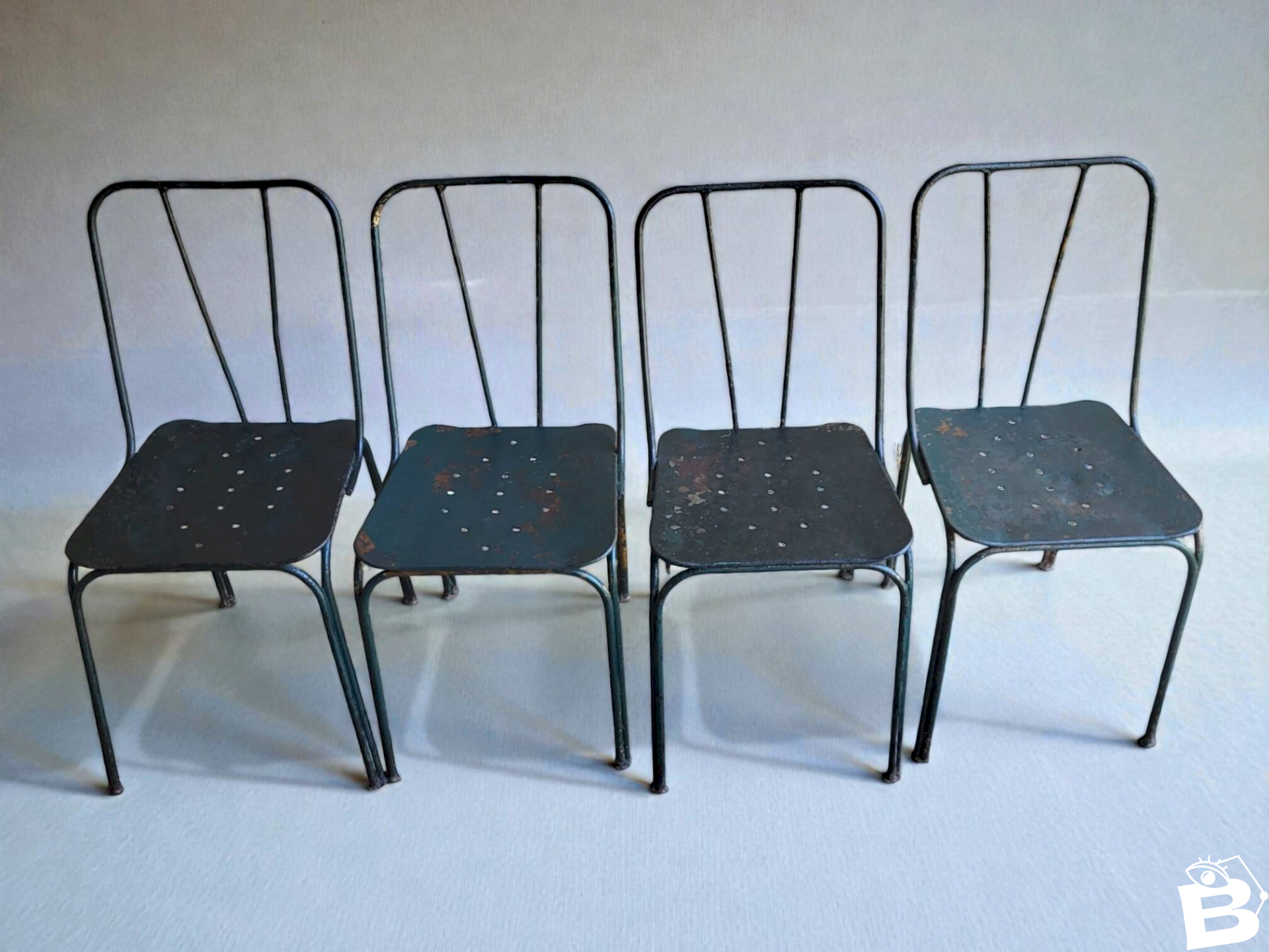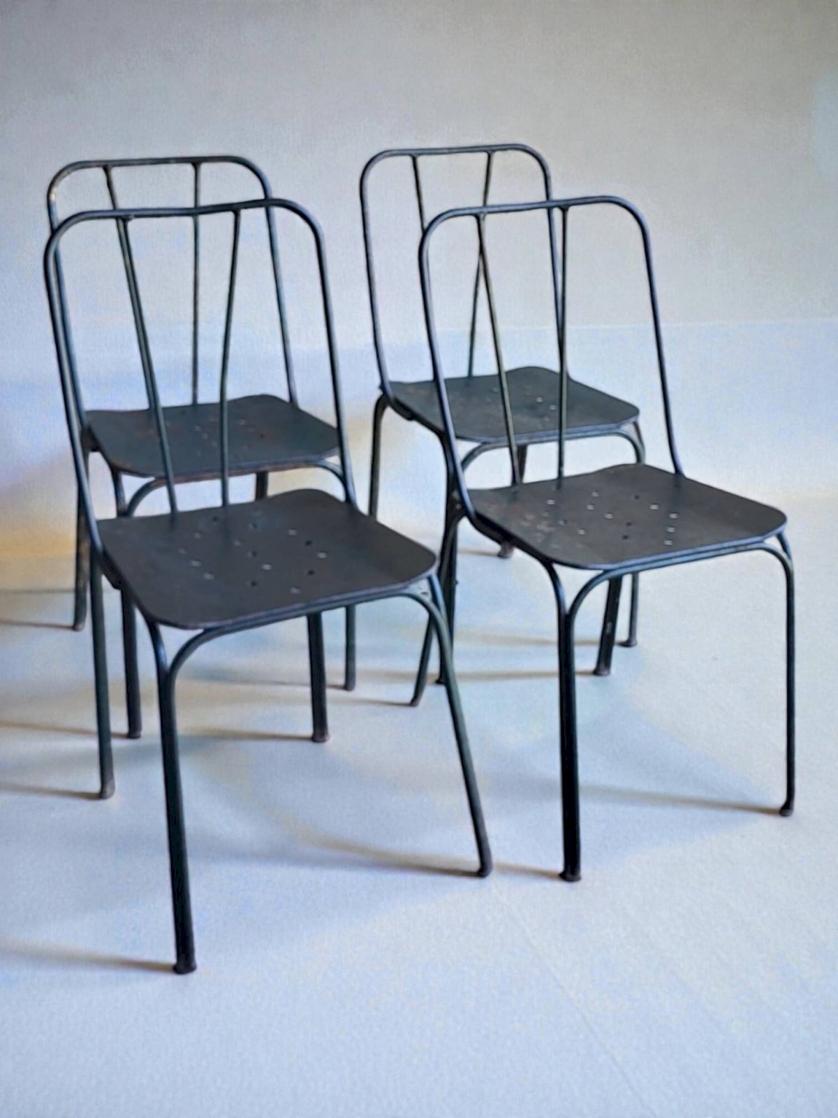 4 garden chairs from Parc et Jardin de Paris, 1950s. Made of wrought iron / Seat in sheet metal. Height 82 cm. Seat height 41 cm. Width 37 cm. Depth 37.5 cm. Signs of use and age / Rust. Possibility to add 2 more to reach 6 chairs. L: 37 W: 37 H: 82