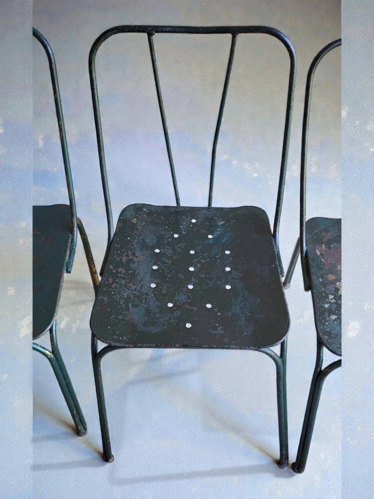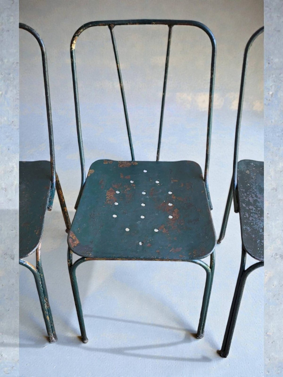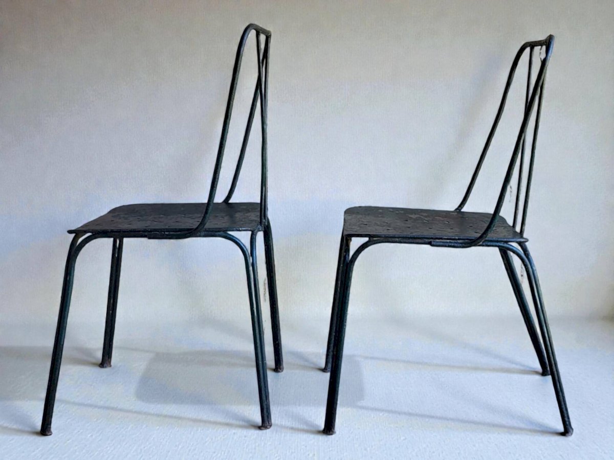 4 garden chairs from Parc et Jardin de Paris, 1950s. Made of wrought iron / Seat in sheet metal. Height 82 cm. Seat height 41 cm. Width 37 cm. Depth 37.5 cm. Signs of use and age / Rust. Possibility to add 2 more to reach 6 chairs. L: 37 W: 37 H: 82