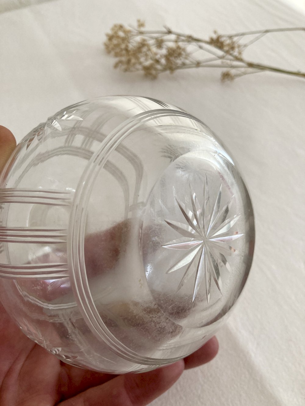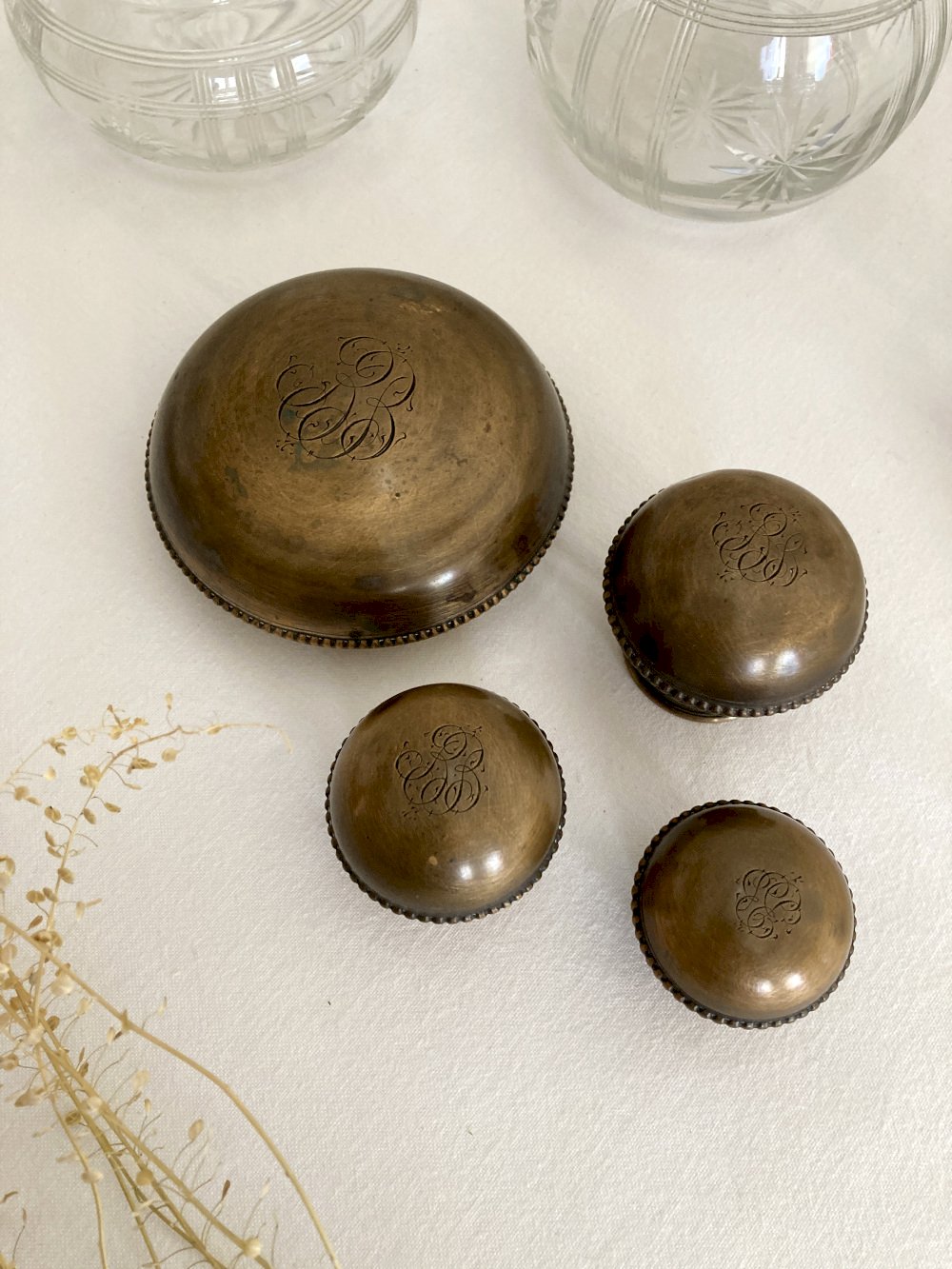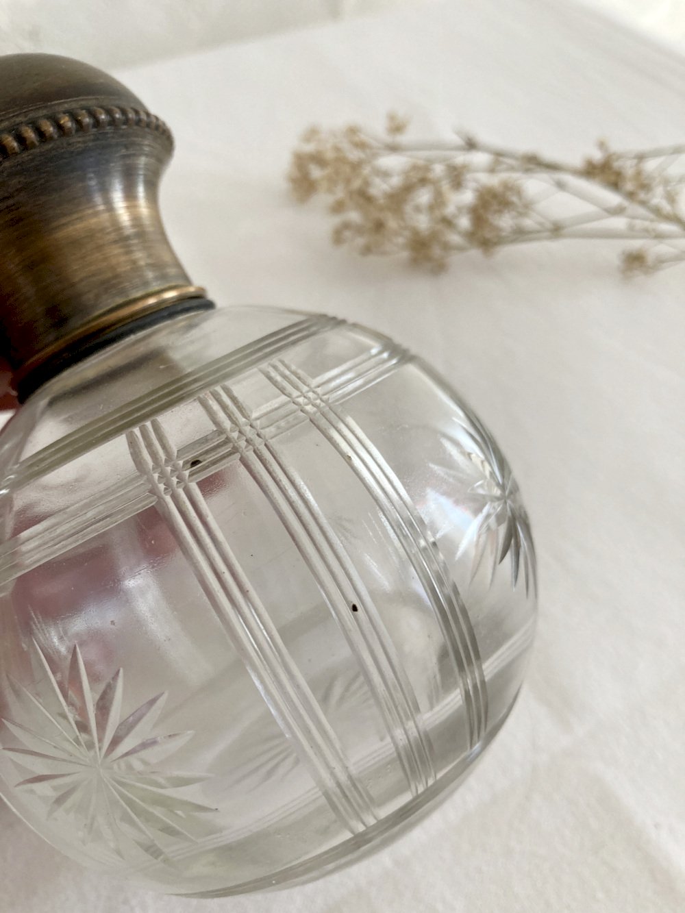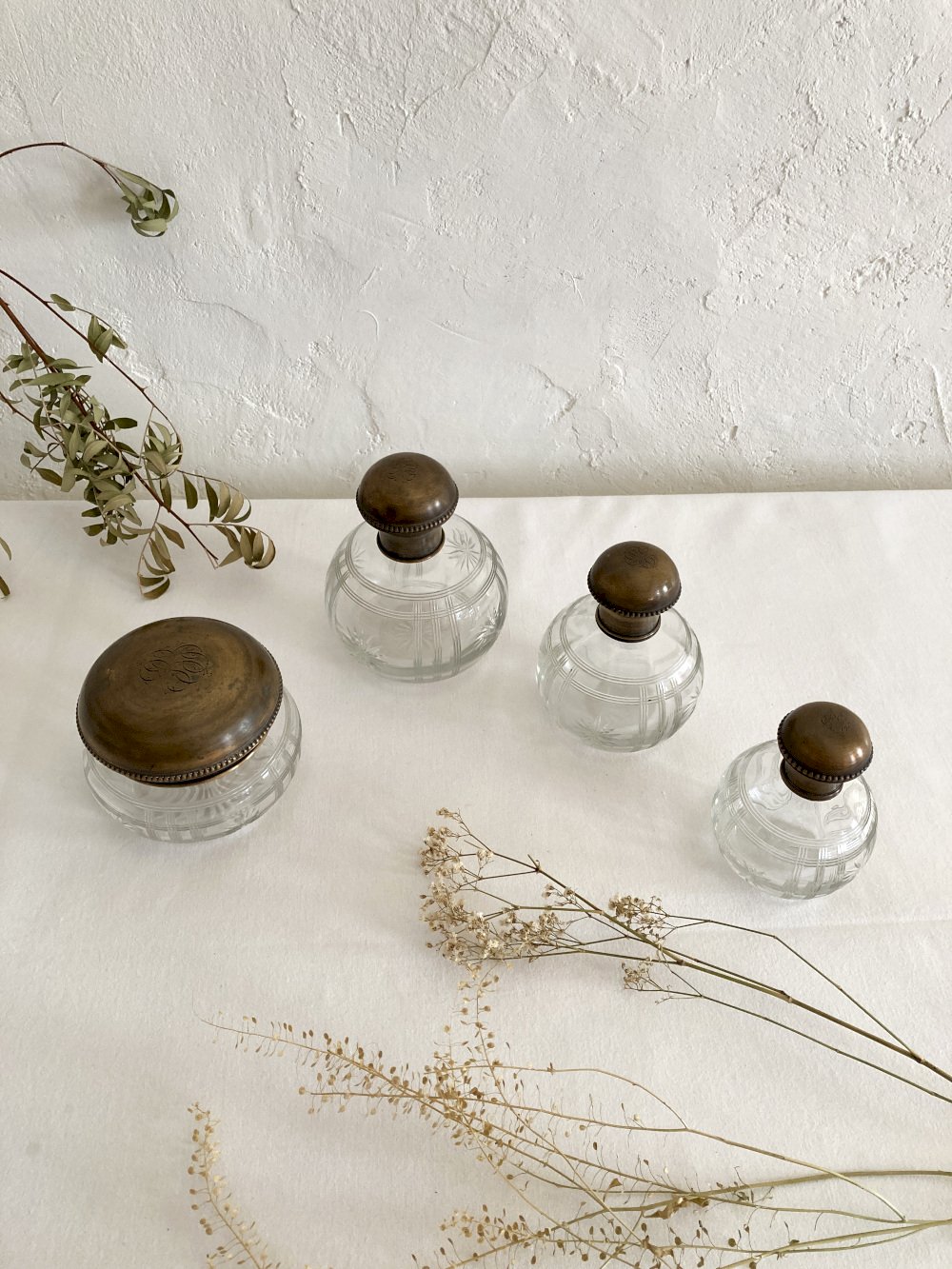 Old and delicate toiletry set in cut crystal alternating star patterns and a checkered weave. 1920s. It consists of a powder compact and three bottles for perfume and eau de toilette. They are equipped with bronze-colored metal caps. They are monogrammed BB. Some elements are missing from the necks of the bottles, including a silver ring and two crystal stoppers for applying perfume to the skin. Two or three small dents on the caps, insignificant, and some small residual traces on the bottom of the large bottle. The crystal and the entire set are in excellent condition. No chips in the crystal.