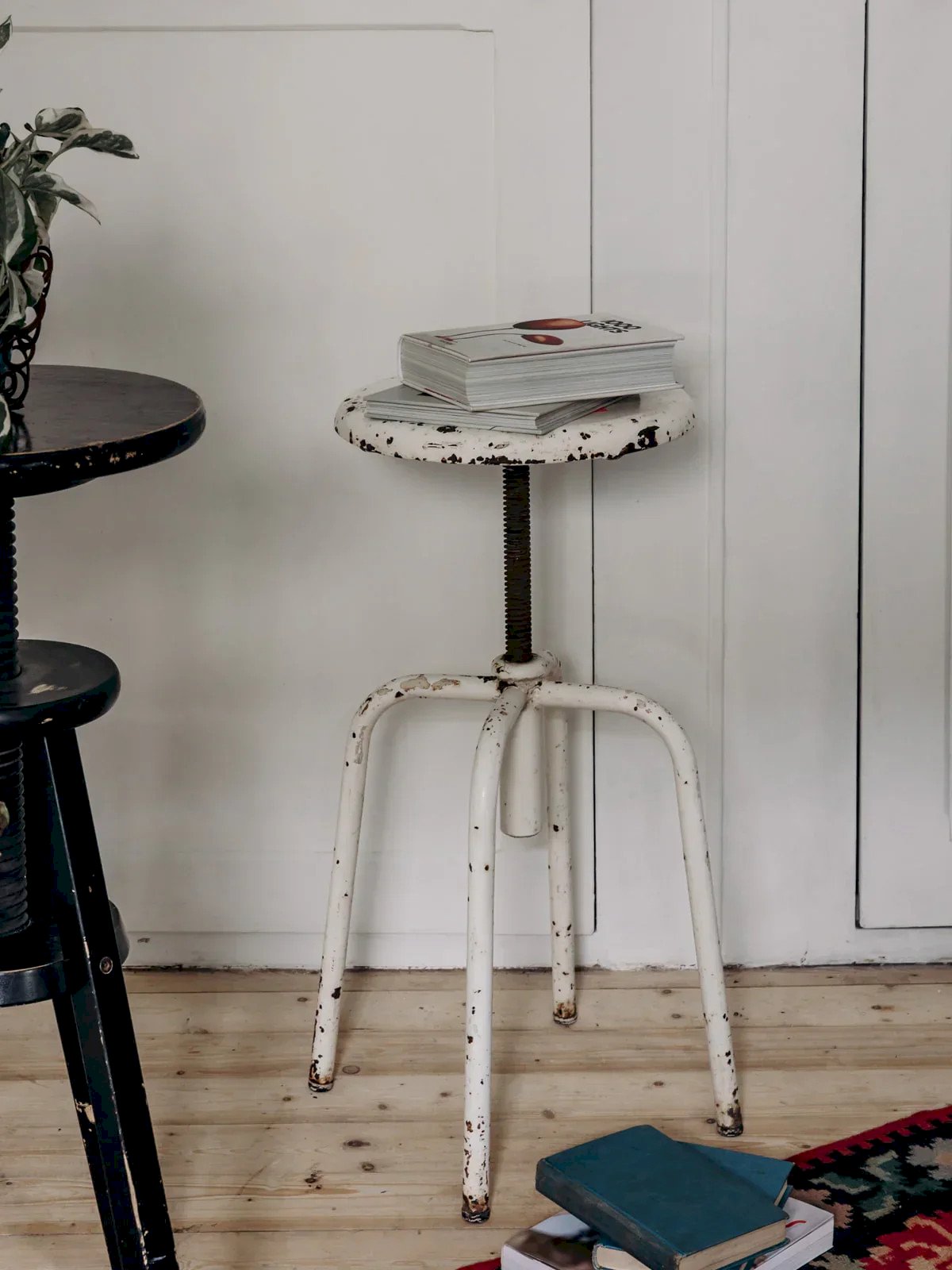 Fall for this workshop stool made of painted white metal with a rusty patina. Its industrial design and practical height make it a functional piece full of character. Ideal for adding a vintage and authentic touch to your interior. Height: 68 cm Seat diameter: 32 cm Base diameter: 35.5 cm Condition: Used: Item that has been used. Item showing some superficial signs of wear, ... Used: Item that has been used. Item showing some superficial signs of wear, fully operational and functioning correctly. It may be a display model or an item returned to the store after a short period of use. The possible imperfections. Color: Multicolor Height: Country Style Width: Metal Length: Bar stools Brand: Debongout Type: Vintage product Material: Metal Style: Country Assembly required: No Assembly level: Fully assembled.