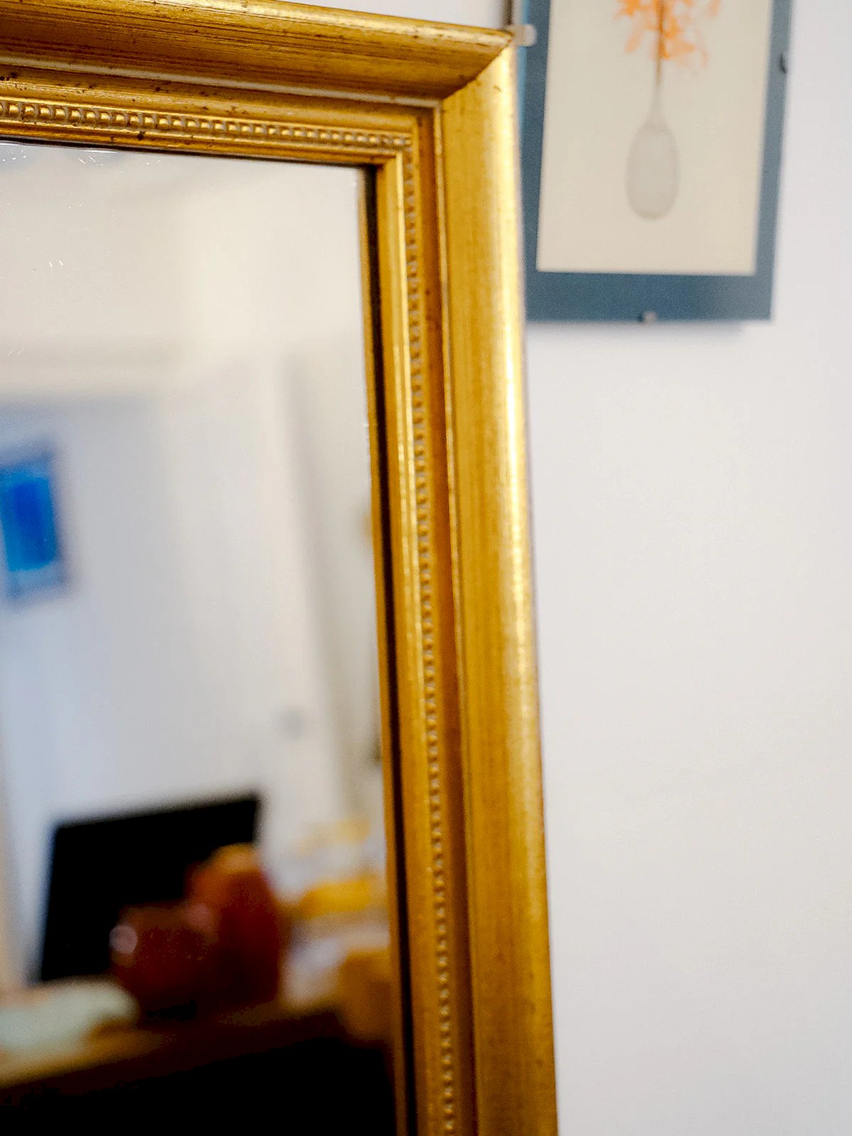 Enhance your interior with this elongated golden mirror with wooden moldings, which brings a subtle elegance and a warm reflection. Its vertical proportions make it an ideal piece to adorn a hallway or an entrance, while visually enlarging the space. The original veneer back confirms its authenticity and careful finish. This mirror radiates a bright and refined atmosphere, perfect for highlighting classic or contemporary decor. Width: 37 cm Height: 128 cm Depth: 3 cm Condition: Second hand: Item that has been used. Item showing some superficial signs of wear. Fully operational and functioning correctly. It may be a demonstration model or an item returned to the store after a brief period of use. Any imperfections. Brand: Debongout Type: Vintage product Material: Wood, Glass Style: Country