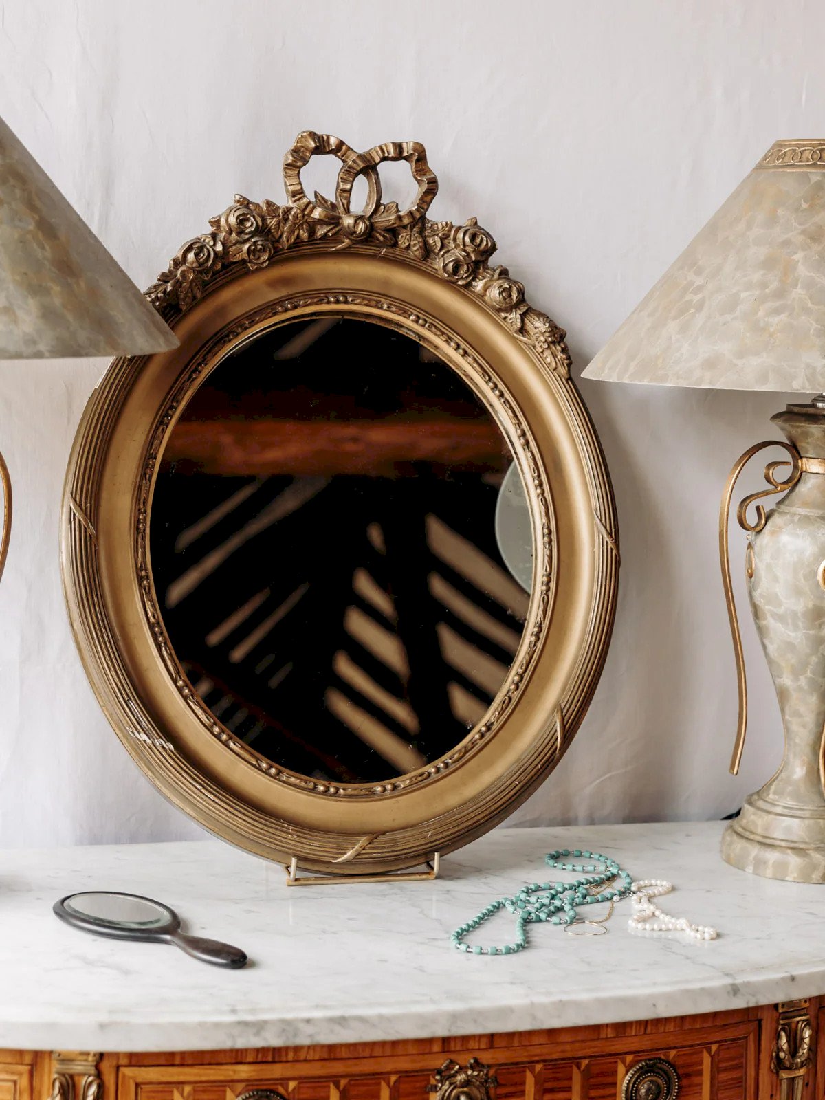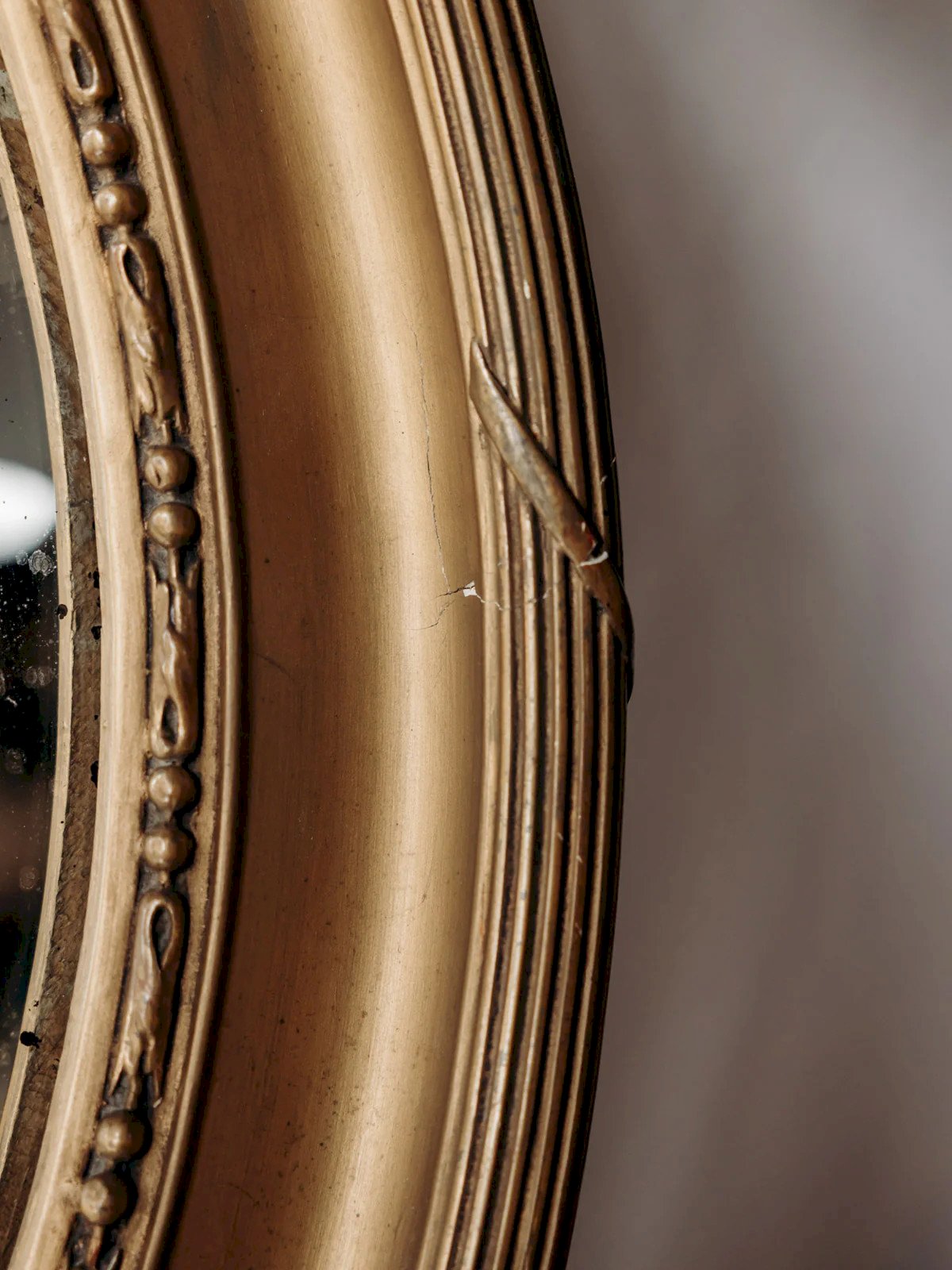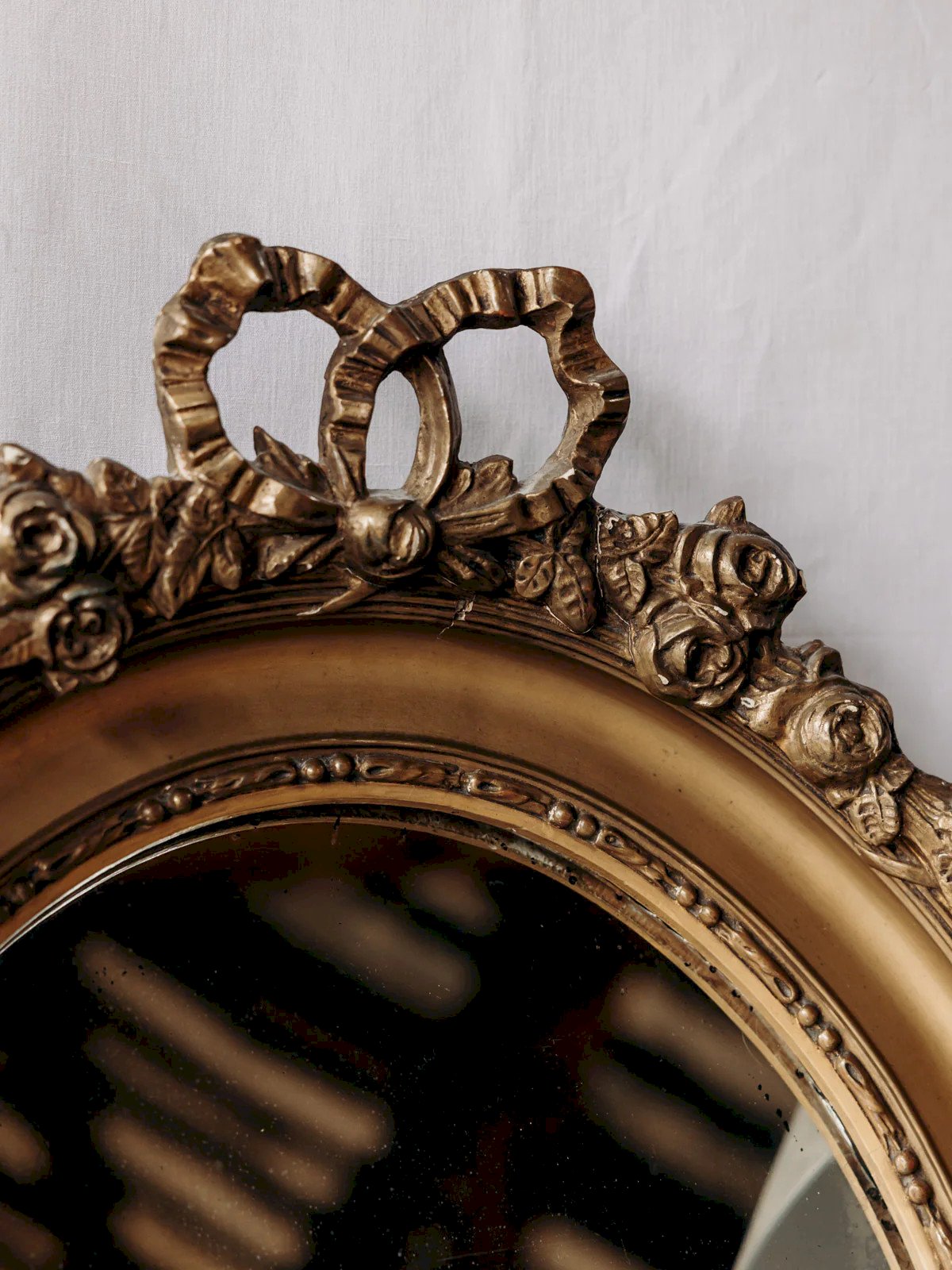 Enhance your interior with this golden wood medallion mirror featuring an oval shape, adorned with a carved bow that gives it a classic and delicate look. Its large size brings light and depth, making it ideal for dressing an entrance, a fireplace, or a dresser while asserting a discreet elegance. The warm patina of the wood and the soft reflection of the glass create a refined and welcoming atmosphere. Light cracks are present. Length: 54 cm Width: 6 cm Height: 72 cm Condition: Used item. Item showing some superficial signs of wear, fully operational and functioning correctly. It may be a demo model or an item returned to the store after a short period of use. Possible imperfections. Brand: Debongout Type: Curated product Material: Wood, Glass Style: Country