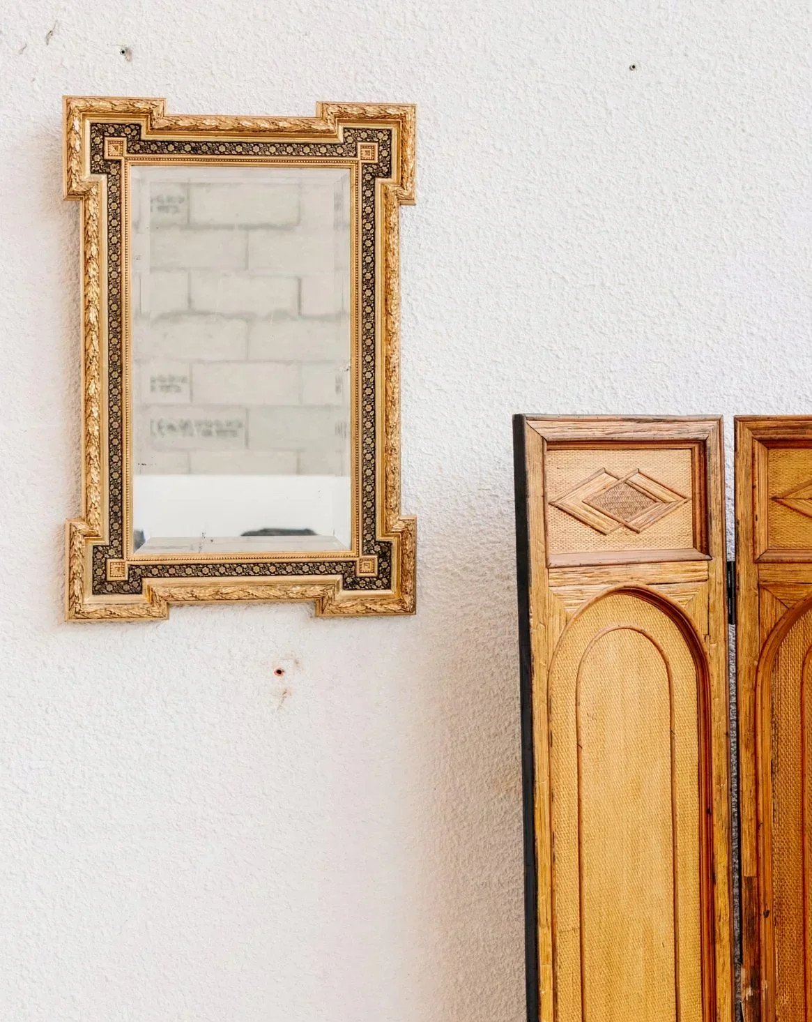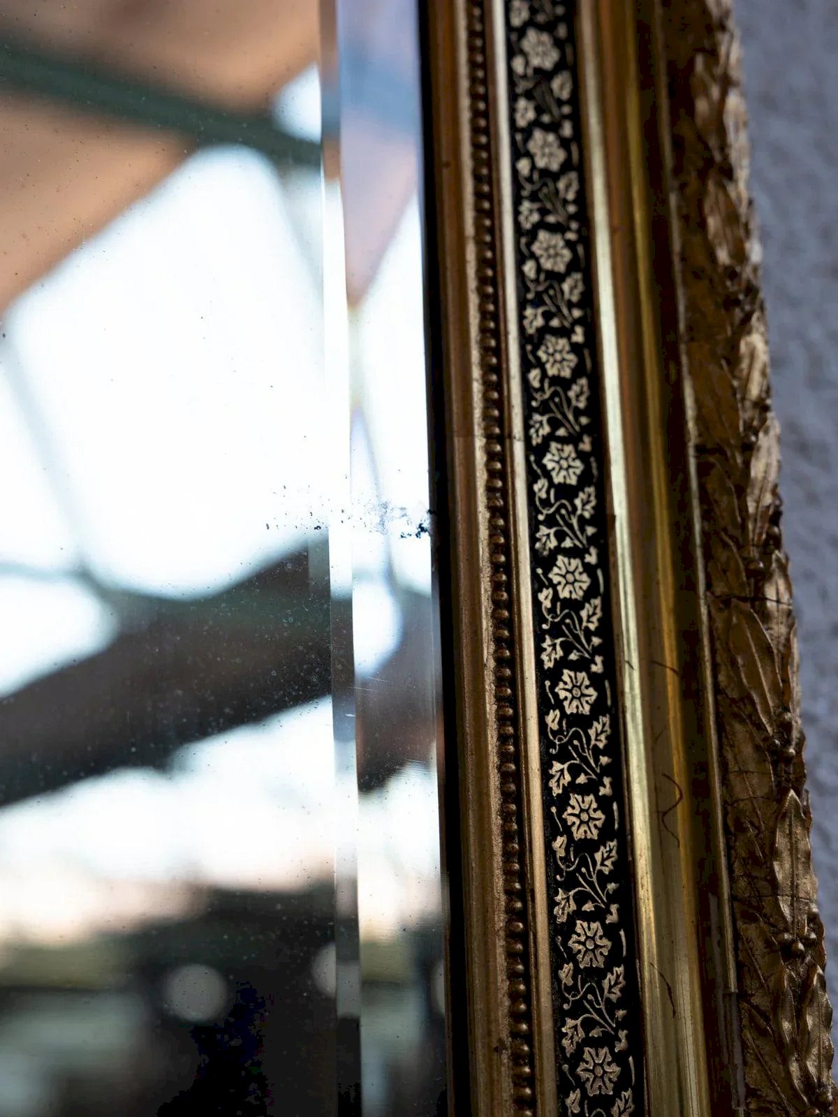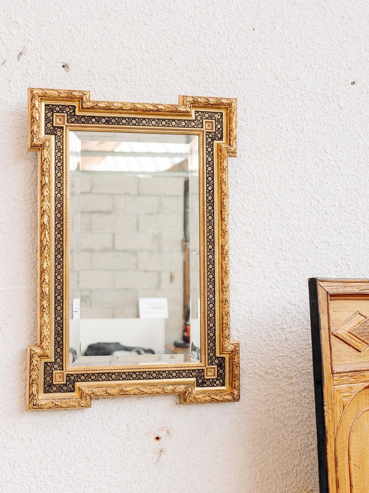 Discover Georges, this antique gilded mirror dating from the late 19th century, adorned with small black and gold flowers. Its frame, delicately decorated with original gilding, perfectly illustrates the elegance of the era. Its beveled mercury glass adds charm and depth to the whole. This mirror harmoniously fits into a bedroom, an entryway, or a living room, regardless of your interior style! Width: 56 cm Depth: 5 cm Height: 81 cm Condition: Second hand: Item that has been used. Item showing some superficial signs of wear, fully operational and functioning correctly. It may be a display model or an item returned to the store after a short period of use. Any imperfections. Brand: Debongout Type: Vintage product Material: Wood, Glass Style: Country