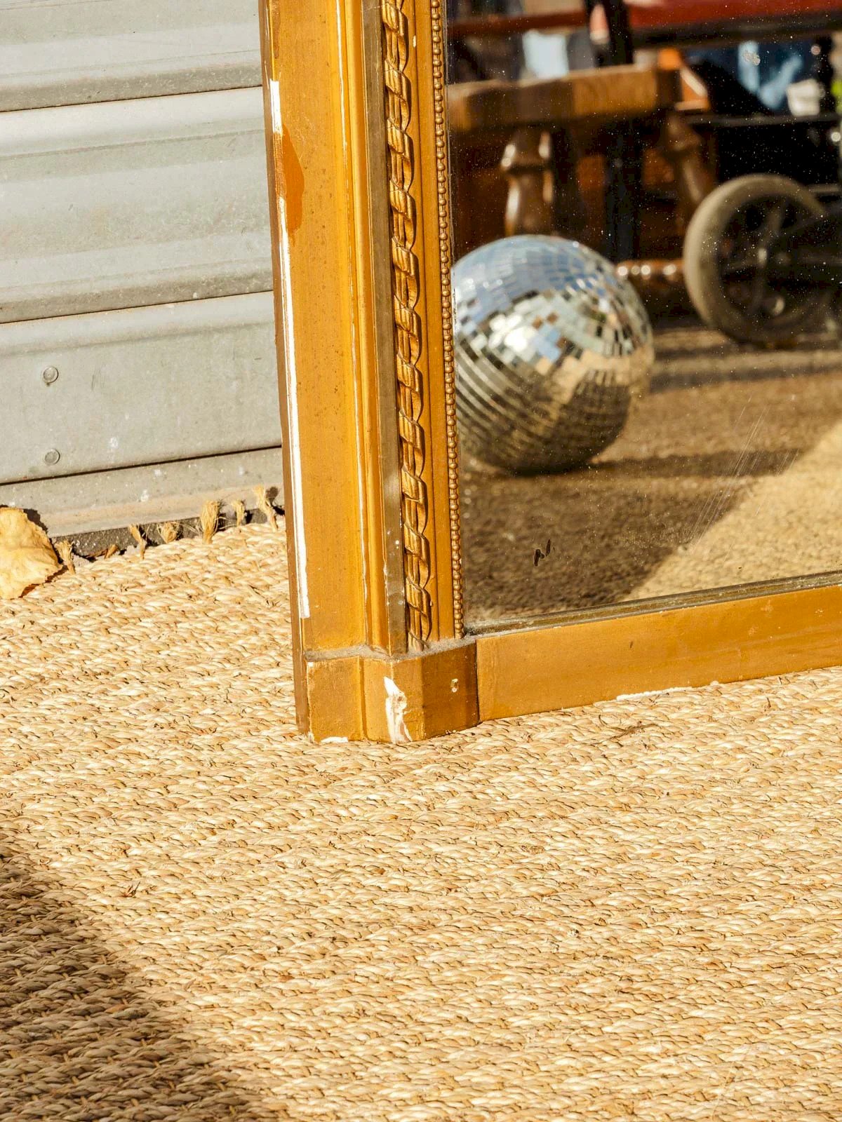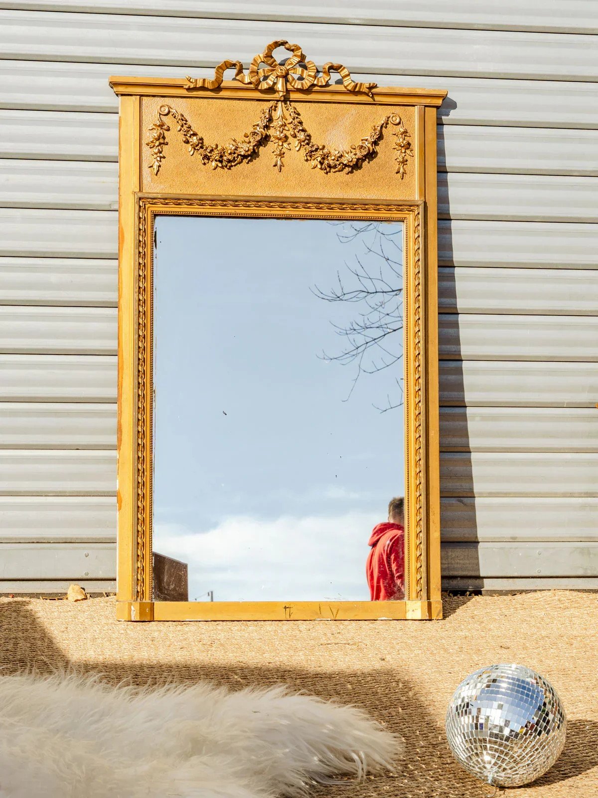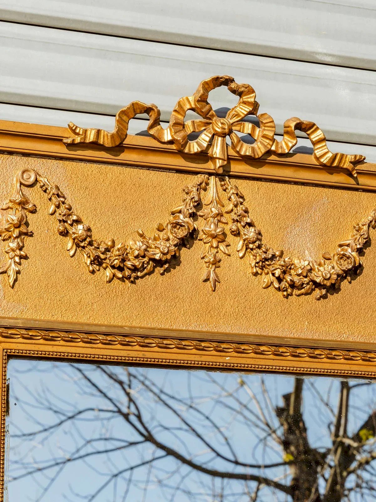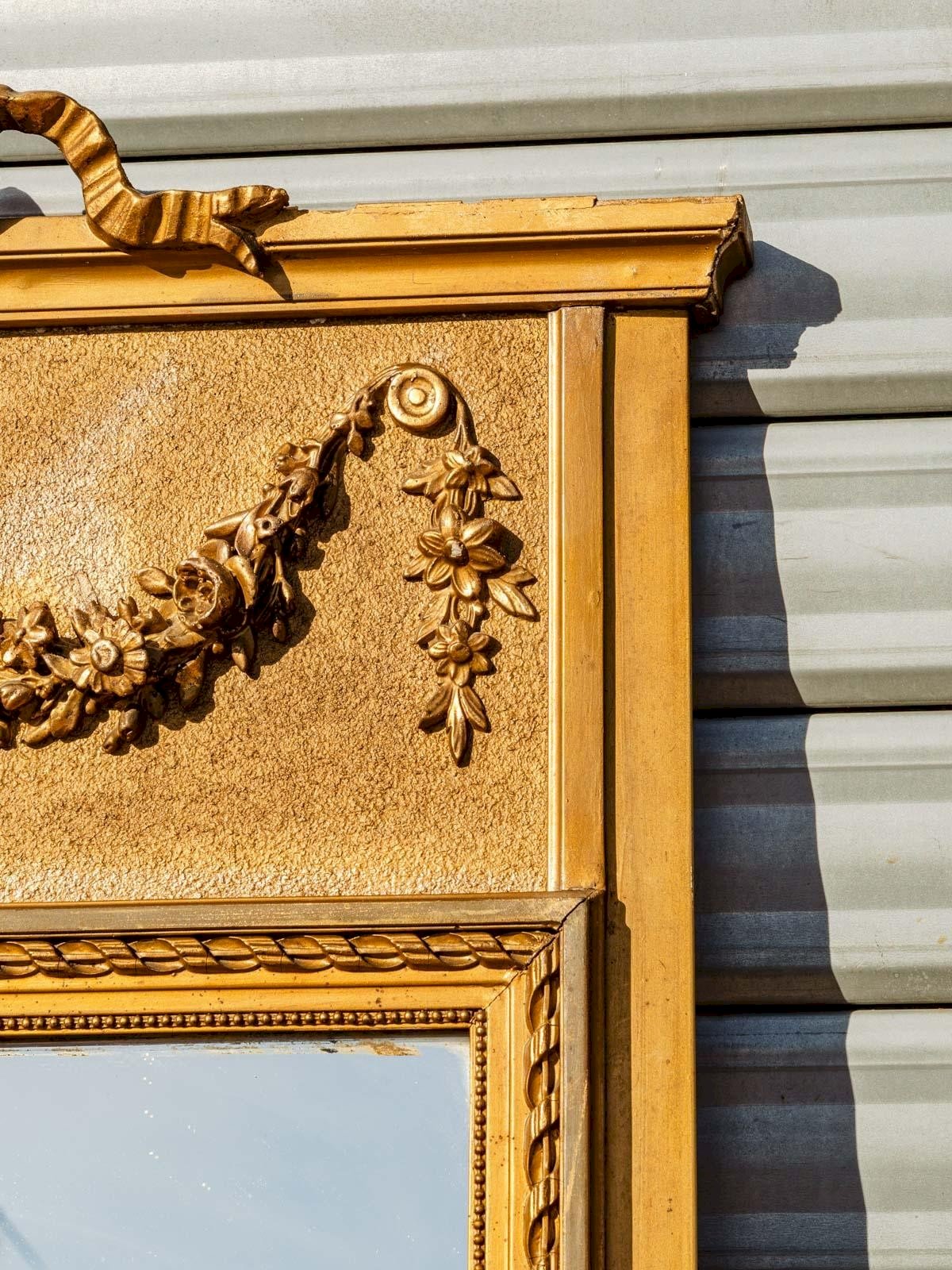 Antique gold mirror in vertical format, its finely worked moulding frame and sculpted floral crown at the top give it an elegant presence in both contemporary and classic interiors. The paneled back reveals careful workmanship and a nice wall hold, making it a piece that is as decorative as it is functional. Slight signs of wear contribute to its charm. Length: 79 cm Width: 4.5 cm Height: 133 cm Condition: Used: Item that has been used. Item showing some superficial signs of wear, fully operational and functioning correctly. It may be a demonstration model or an item returned to the store after a short period of use. Possible imperfections. Brand: Debongout Type: Vintage product Material: Plaster Style: Country.