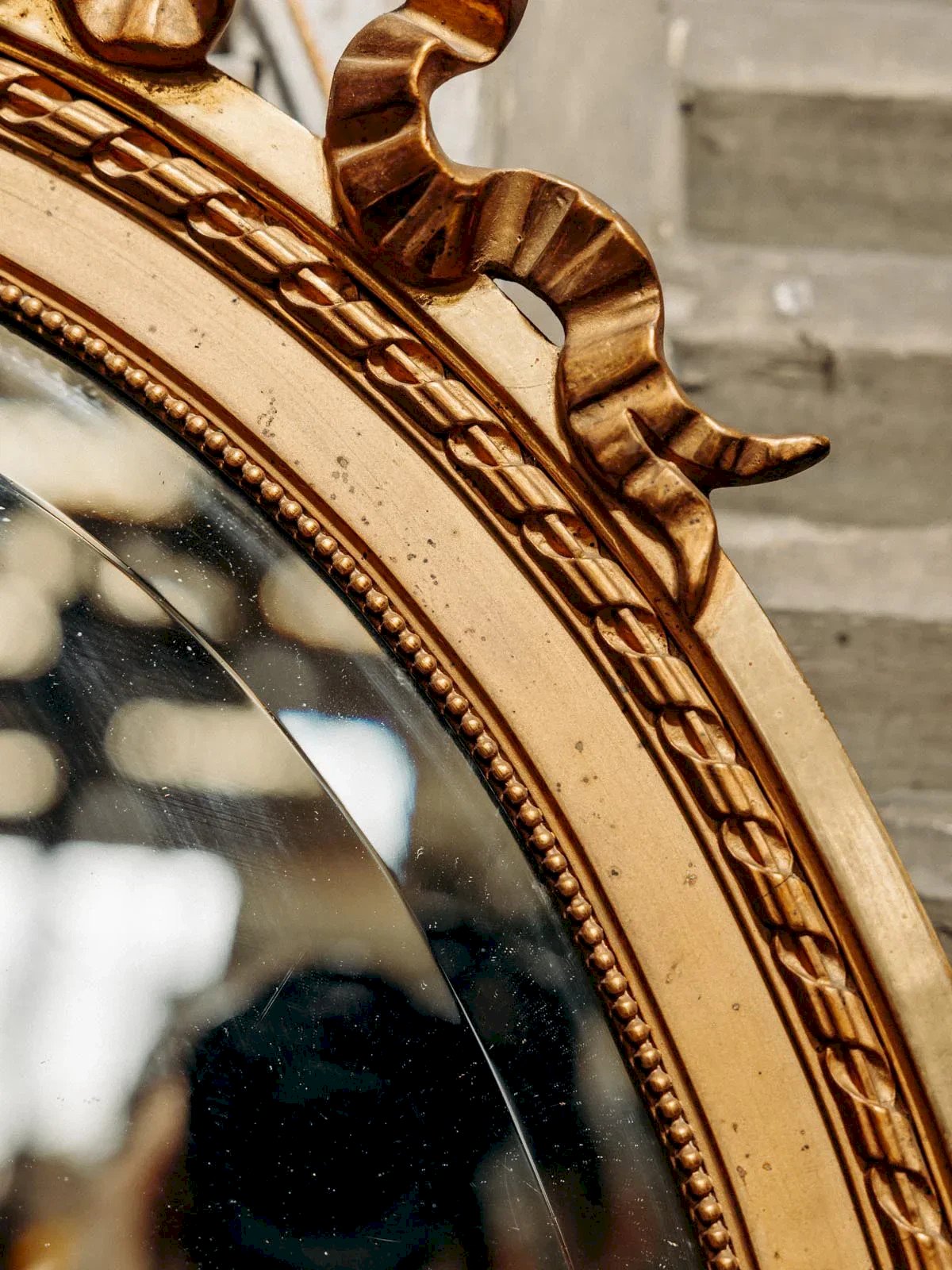 Add a touch of elegance to your interior with our gold oval mirror, adorned with a refined wooden bow. This superb decorative accessory features lovely decorations, adding a note of sophistication to any room. Ideal for dressing a wall or creating a focal point in your space, this mirror brilliantly combines utility and aesthetics. A must-have for lovers of chic and timeless design. Length: 60 cm Width: 4 cm Height: 96 cm Condition: Used: Item that has been utilized. Item showing some superficial wear marks, fully operational and functioning correctly. It may be a display model or an item returned to the store after a short period of use. Possible imperfections. Brand: Debongout Type: Vintage Product Material: Wood, Glass Style: Country
