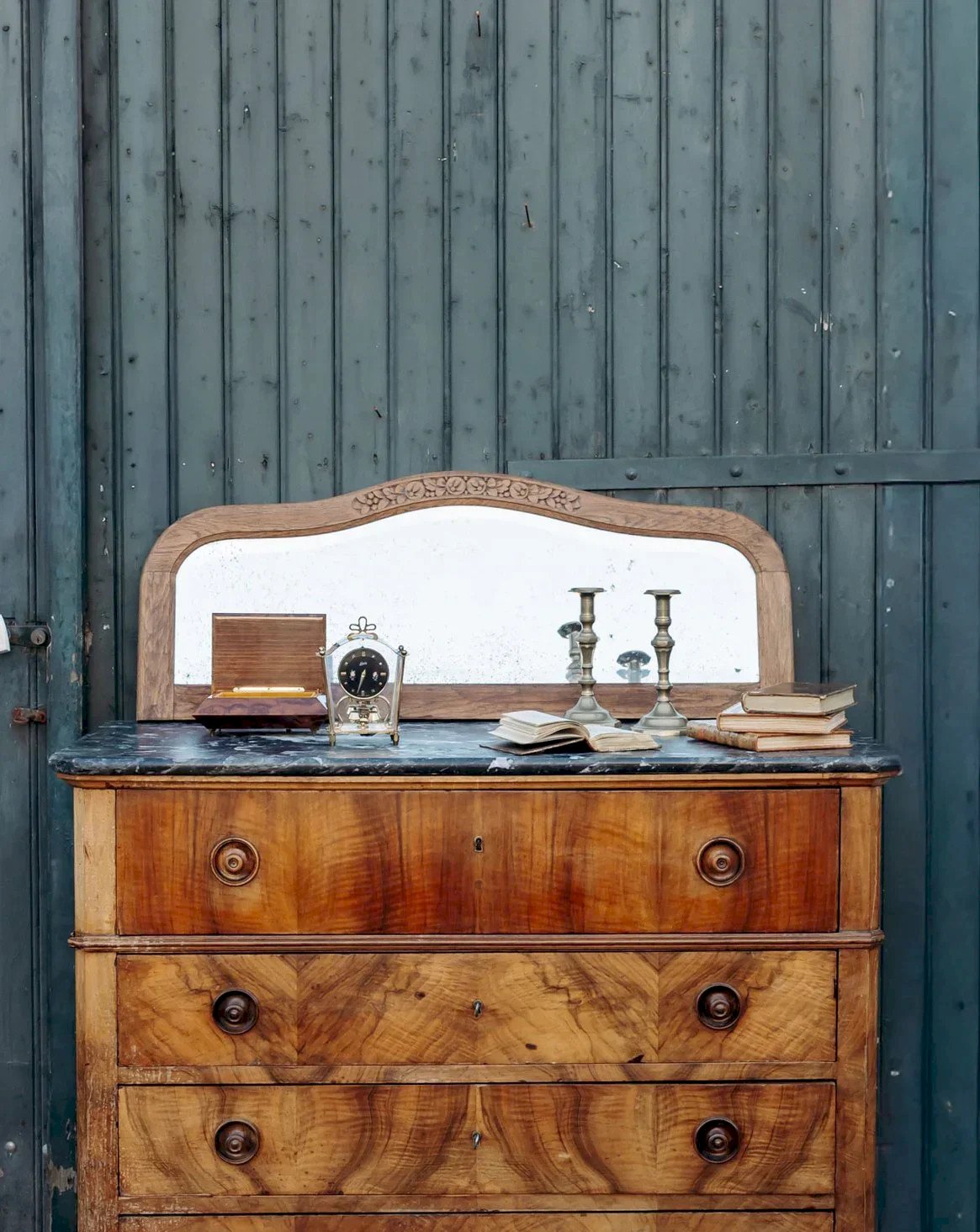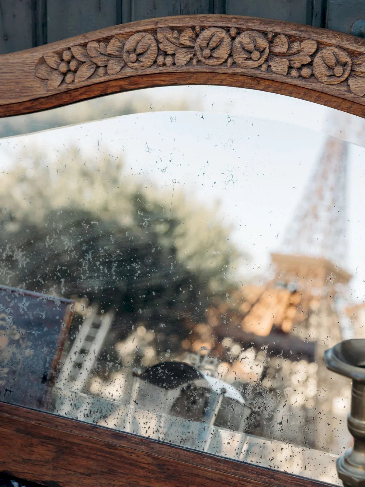 Elevate your interior with this rounded top wooden mirror, embellished with flowers sculpted directly into the material. Its generous width and slim profile allow it to be installed above a dresser or console to open up an entryway or illuminate a bedroom, while the wood adds a warm and natural touch. The subtle floral decor lends a narrative elegance, balancing sobriety and antique charm. Light signs of wear present. Length: 106 cm Width: 3 cm Height: 43 cm Condition: Used: Item that has been used. Item showing some superficial signs of wear, ...Used: Item that has been used. Item showing some superficial signs of wear, fully operational and functioning correctly. It may be a demonstration model or an item returned to the store after a short period of use. the possible imperfections. Brand: Debongout Type: Thrifted Product Material: Wood, Glass Style: Country