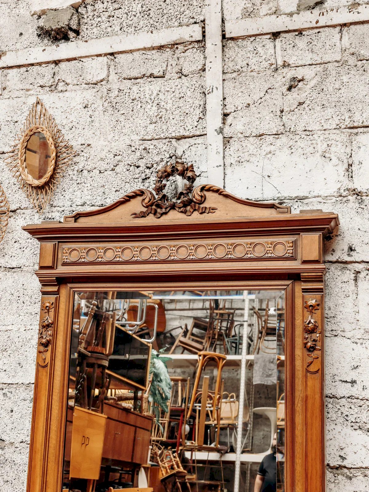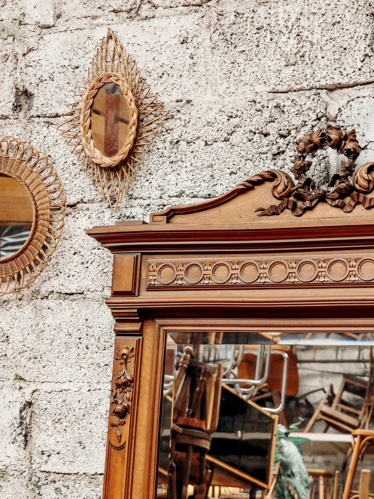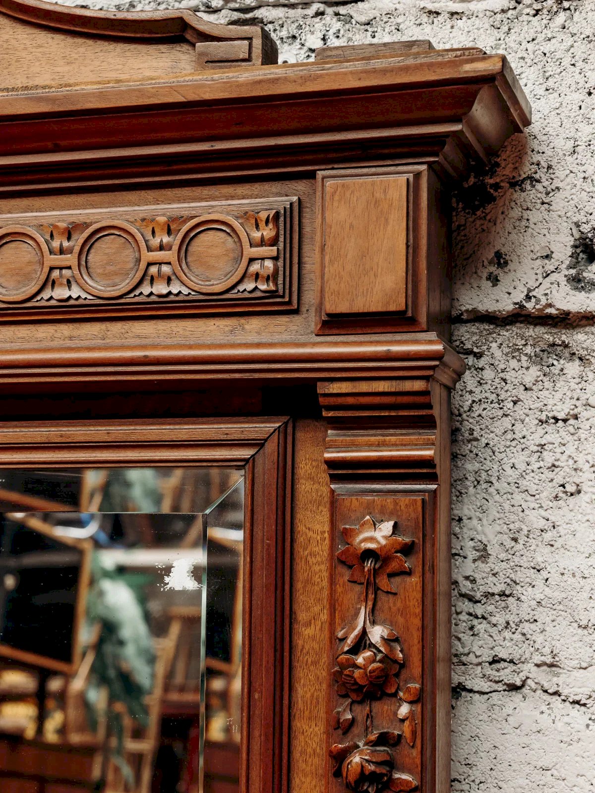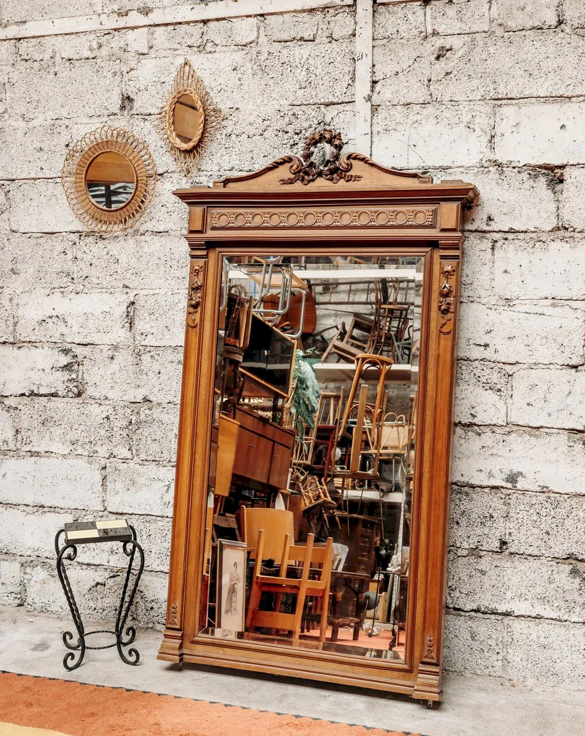 Discover this very large dark wood trumeau mirror, an impressive piece that adds character to any interior. Its carved and engraved frame showcases meticulous craftsmanship, ideal for a classic ambiance. It can be hung on the wall thanks to the strong hooks located at the back. Perfect above a fireplace or in an entryway, it visually enlarges the space. A mirror as decorative as it is functional, with timeless charm. Length: 109 cm Width: 12 cm Height: 196 cm Condition: Used: Item has been used. Item shows some signs of superficial wear... Used: Item has been used. Item shows some signs of superficial wear, fully operational and functioning correctly. It may be a display model or an item returned to the store after a short period of use, including any imperfections. Brand: Debongout Type: Vintage product Material: Glass, Wood Style: Country