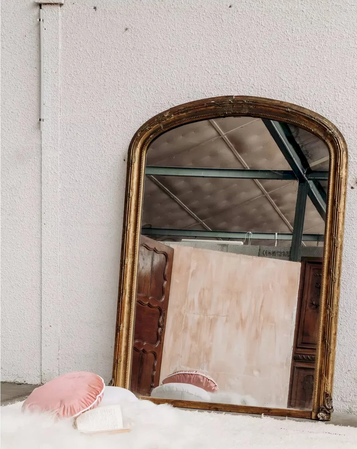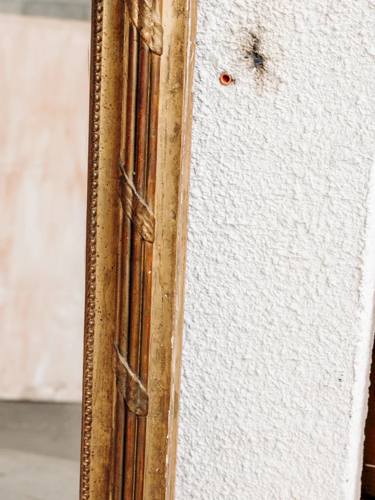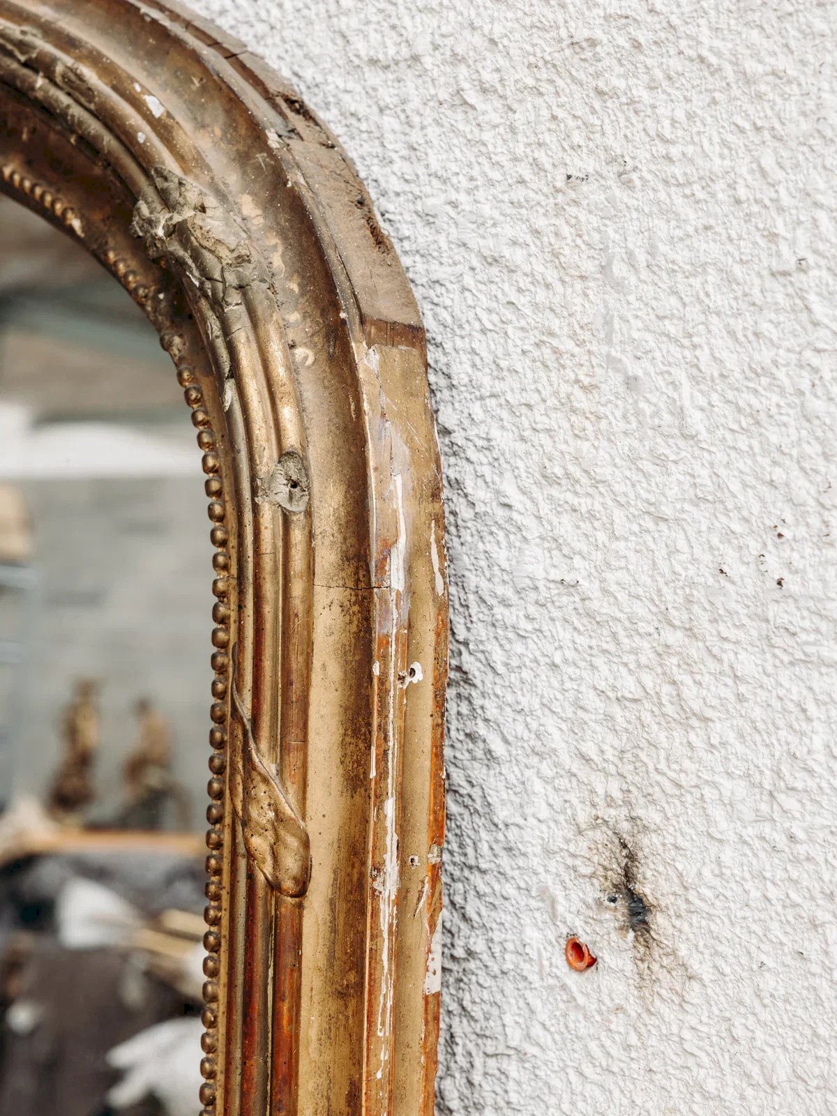 Add a vintage and elegant touch to your interior with this large gold mirror in the Louis Philippe style. Its rectangular shape, rounded at the top, draws the eye, while its richly decorated frame reflects the style of its era. Ideal for visually expanding your space, this mirror is perfect for furnishing a bedroom, living room, or entrance. Please note that the frame shows signs of wear from its past life. Length: 176 cm Width: 129 cm Depth: 5 cm A Brief History of the Louis Philippe Mirror At that time, the mirrors of great monarchs were recognizable by their cornices laden with decorations. However, during the reign of Louis-Philippe, a more bourgeois style developed, less concerned with originality than with comfort. The Louis-Philippe mirrors aimed to be more sober and streamlined. Unlike mirrors from earlier periods, the wood is no longer carved but instead molded and coated with a glue primer. The top of the mirror's frame is rounded, resembling a gendarme's hat. For decoration, pearls or acanthus leaves accentuate the cornice at the bottom with a golden gilded effect that illuminates the entire piece. Large mirrors placed over fireplaces bring clarity and perspective to living spaces. Condition: Used: An item that has been used. The item shows some superficial signs of wear... Used: An item that has been used. The item shows some superficial signs of wear, fully operational and functioning correctly. It may be a demonstration model or an item returned to the store after a short period of use, with any possible imperfections. Brand: Debongout Type: Curated product Material: Glass Style: Country