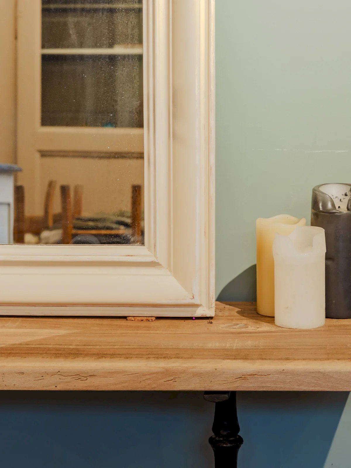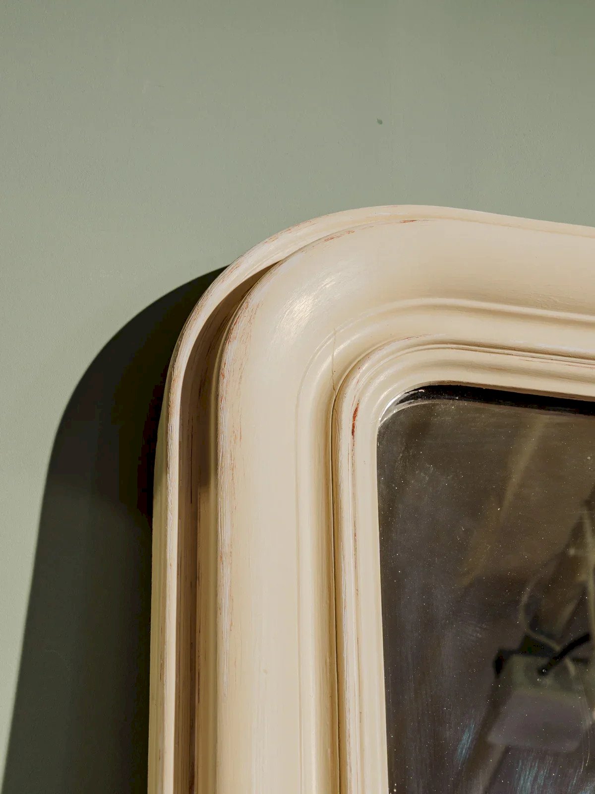 Discover this Louis-Philippe mirror with a rounded cream-painted wooden frame that adds an elegant and soft silhouette to an entryway or bedroom. Sanded to reveal an antique burgundy, it subtly plays on the patina and contrast of the paint layers, offering a warm presence and a refined retro touch. The glass brightens the space without overwhelming it, ideal for dressing a wall with character. Some traces of mercury and slight signs of wear. Length: 90 cm Width: 3 cm Height: 139 cm A brief history of the Louis Philippe mirror At the time, mirrors of the great monarchs were recognizable by their cornices laden with decorations. However, during the reign of Louis-Philippe, a bourgeois style developed, less concerned with originality than with comfort. Louis-Philippe mirrors aimed to be more sober and streamlined. Unlike mirrors from previous eras, the wood is no longer sculpted but molded and coated with a glue primer. The top of the mirror's frame is rounded, resembling a gendarme's hat. For decoration, beads or acanthus leaves at the bottom highlight the cornice with a gilded effect that illuminates the whole. Large mirrors placed above fireplaces bring clarity and perspective to living spaces. Condition: Used: An item that has been used. Item showing some superficial signs of wear, ...Used: An item that has been used. Item showing some superficial signs of wear, fully operational and functioning correctly. It may be a display model or an item returned to the store after a short period of use. Any possible imperfections. Brand: Debongout Type: Vintage product Material: Wood Style: Country