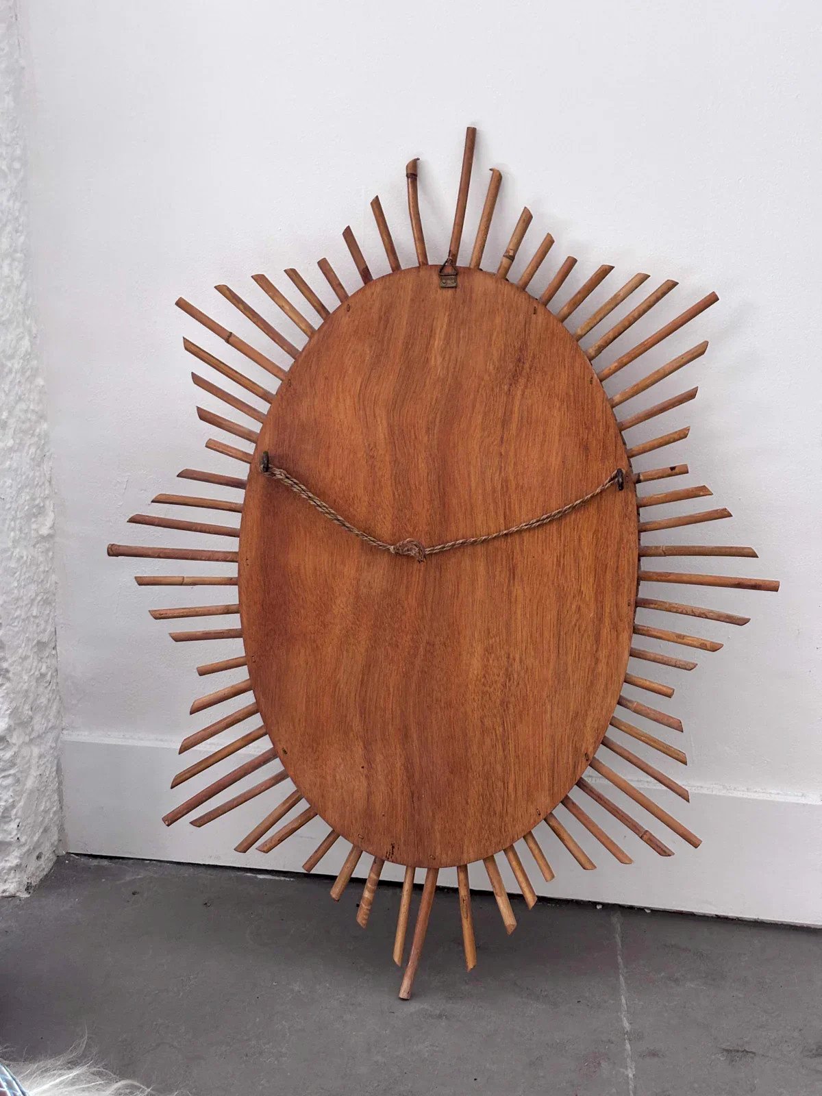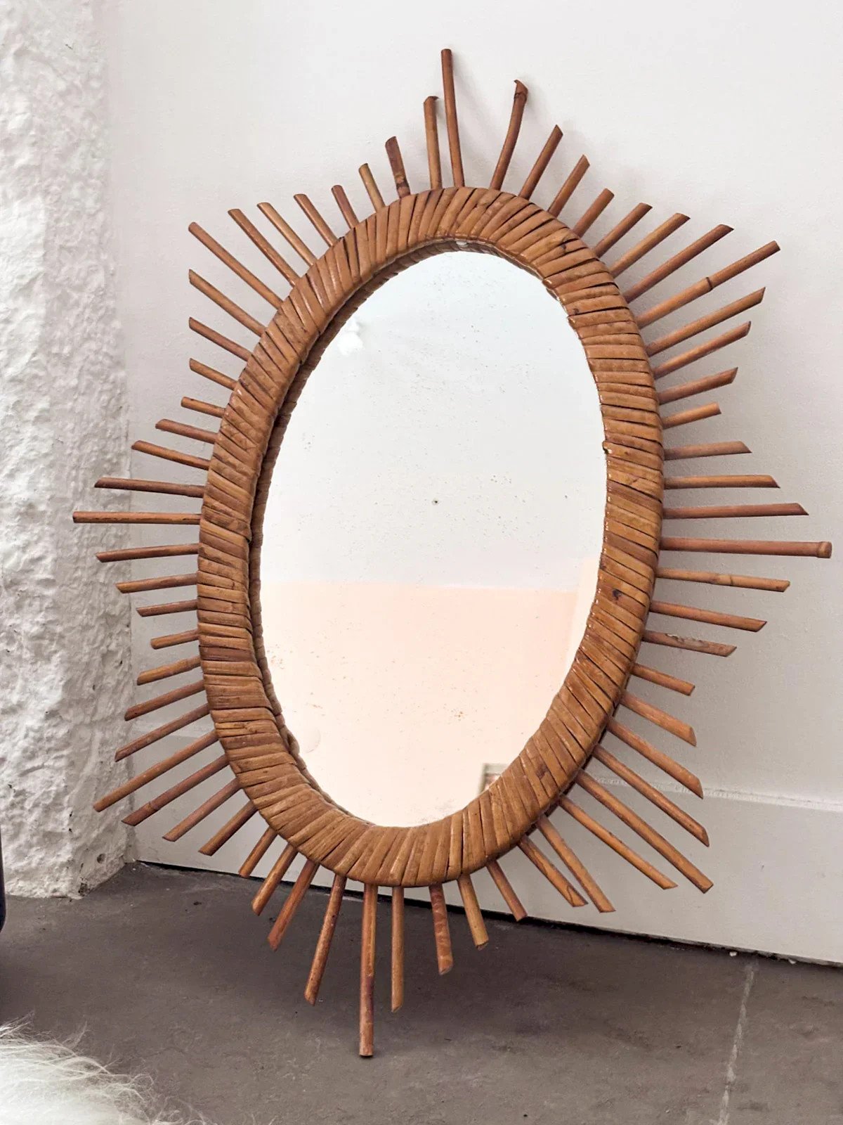 Add a touch of vintage charm to your interior with this oval rattan mirror. With a refined design, it combines the natural elegance of woven rattan with a delicate shape that will attract all eyes. Perfect for dressing a bare wall or enhancing an entryway, it brings a warm and welcoming ambiance to your décor. This mirror is the ideal element to enhance your space while reflecting light and creating an illusion of grandeur. Frame Width: 48 cm Height: 62 cm Mirror Width: 22 cm Height: 36 cm Condition: Used: Item that has been used. Item showing some superficial wear marks, fully operational and functioning correctly. It may be a demonstration model or a returned item after a short period of use, including any potential imperfections. Brand: Debongout Type: Vintage product Material: Rattan Style: Country