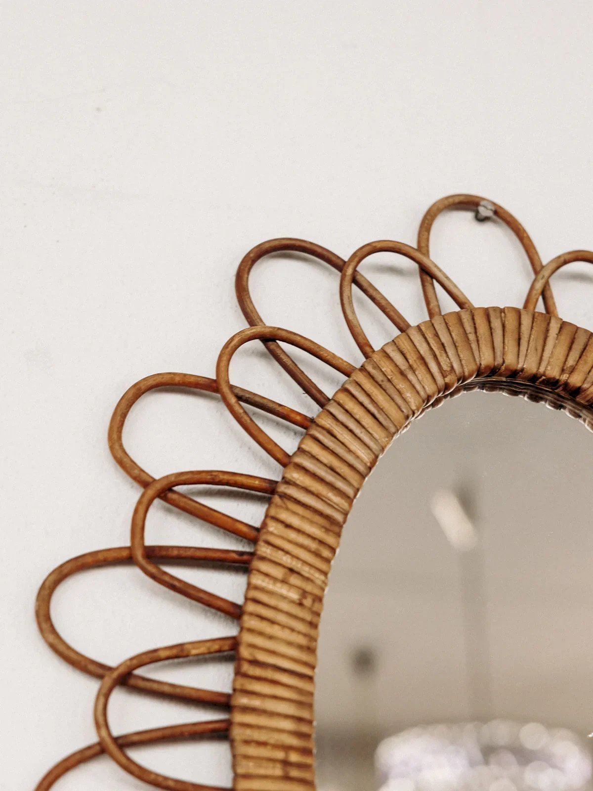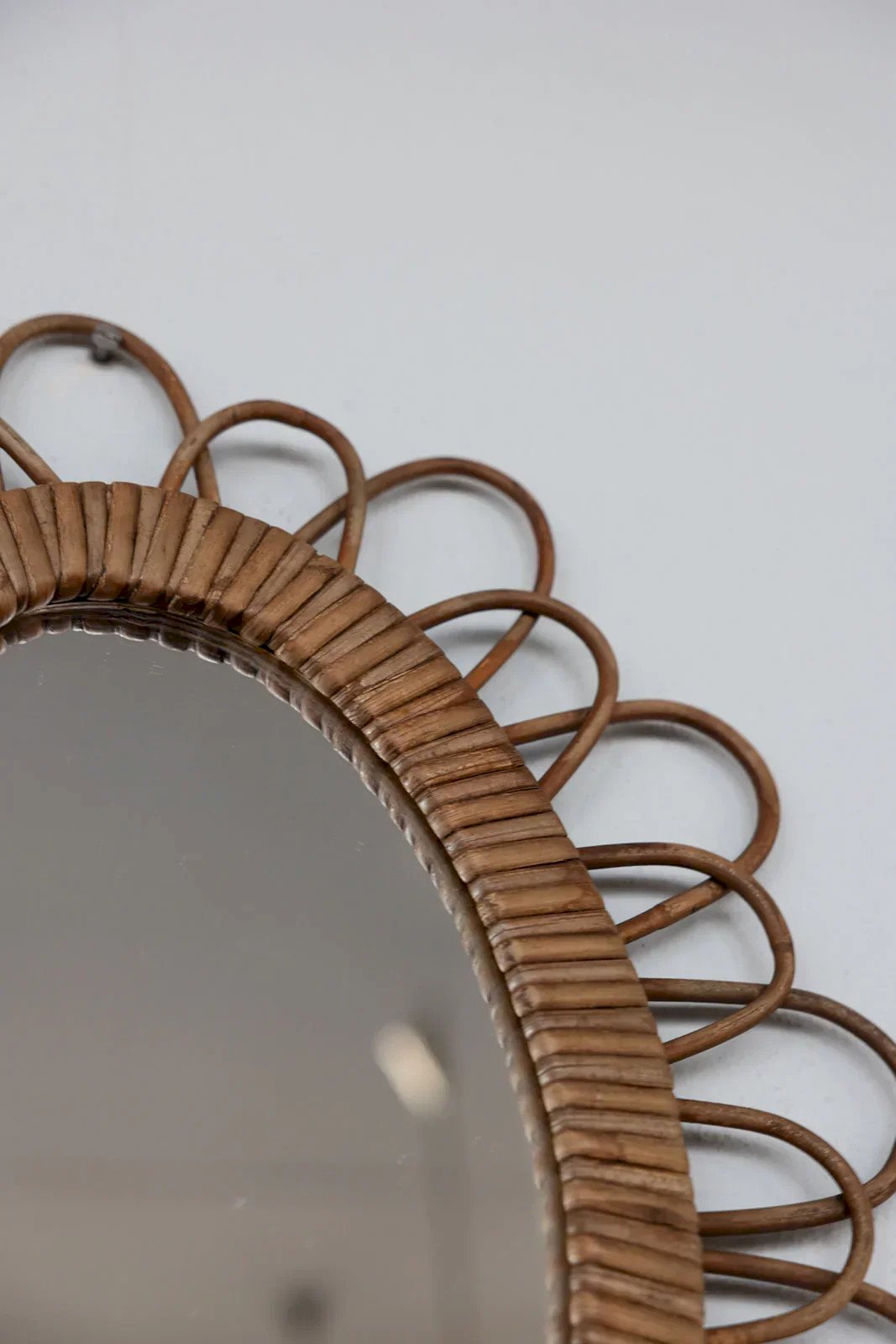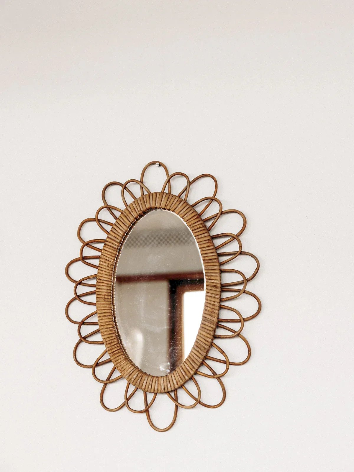 This oval rattan mirror adds a bohemian and natural touch to your interior. Its delicately woven rattan frame creates a warm and authentic atmosphere. Perfect for adding light and texture to any room, it easily fits into all decor styles, bringing a note of charm and simplicity. Length: 42 cm Height: 55 cm Condition: Used: Item that has been used. Item showing some signs of superficial wear, fully operational and functioning properly. It may be a display model or an item returned to the store after a short period of use. Any imperfections. Brand: Debongout Type: Thrifted product Material: Rattan, Glass Style: Country