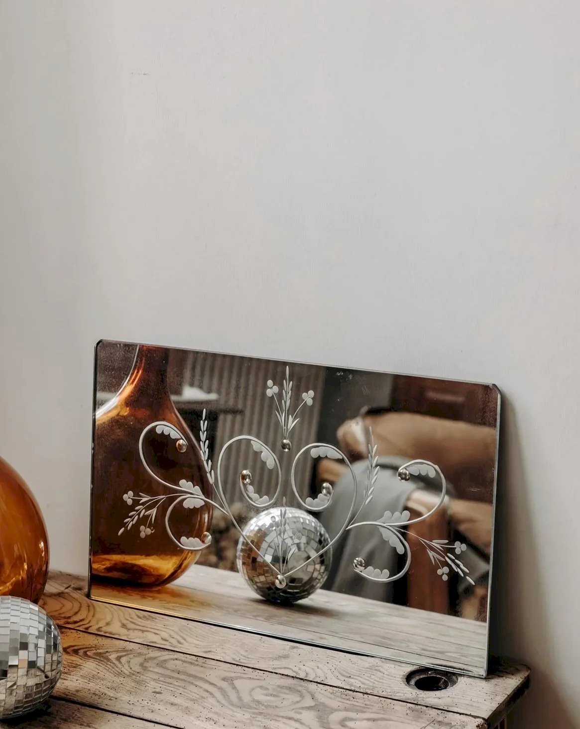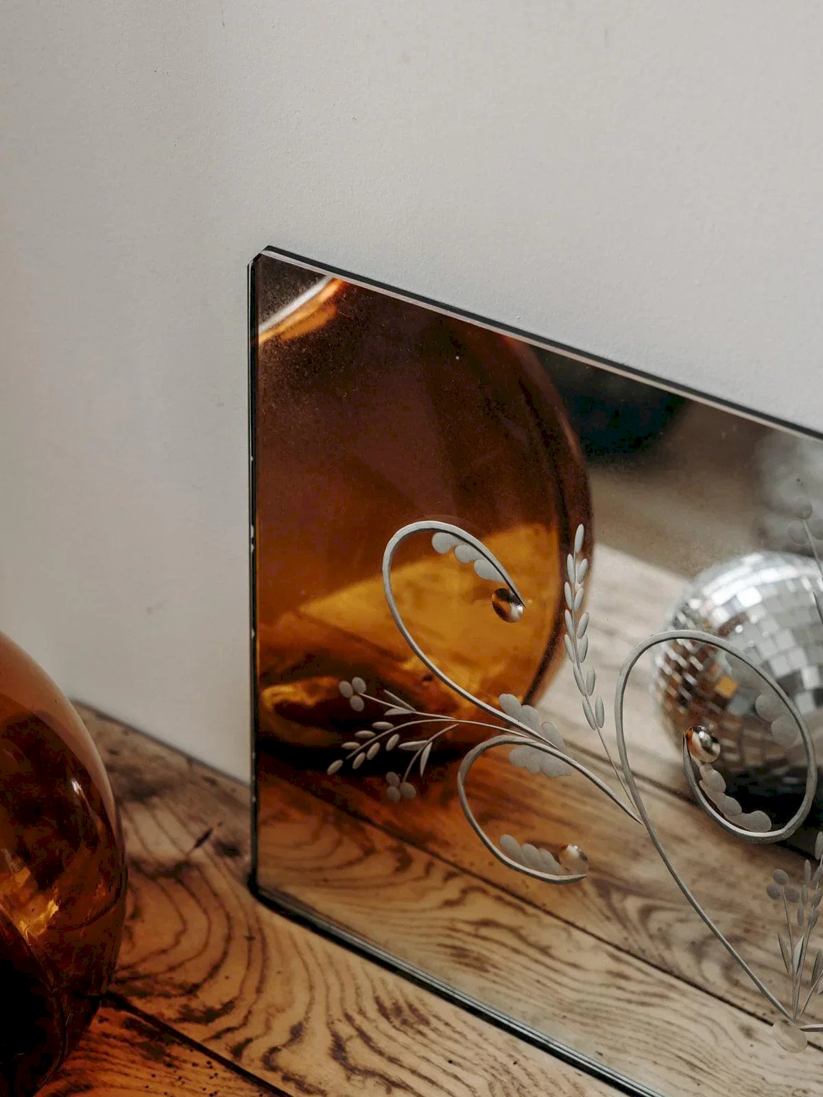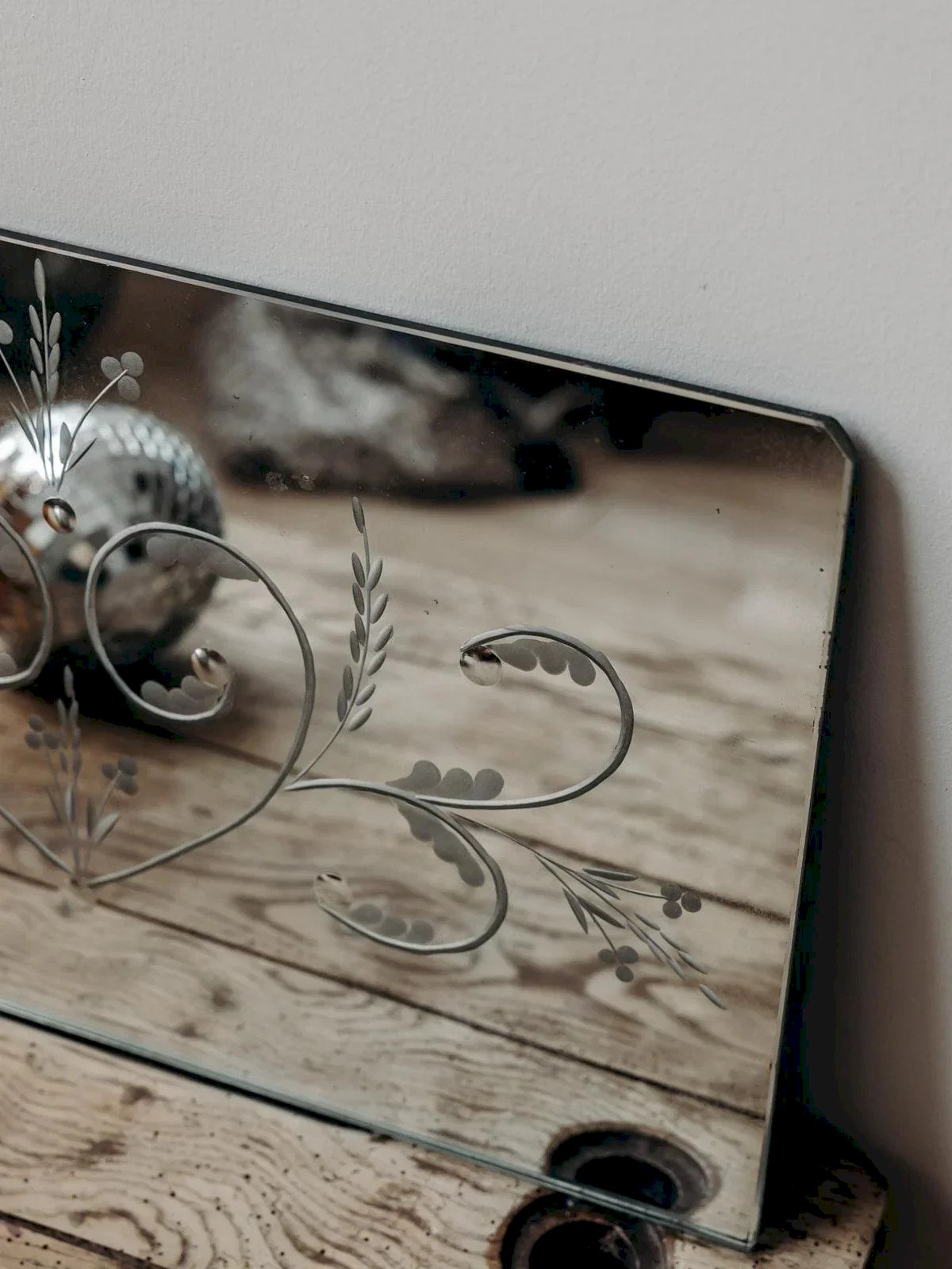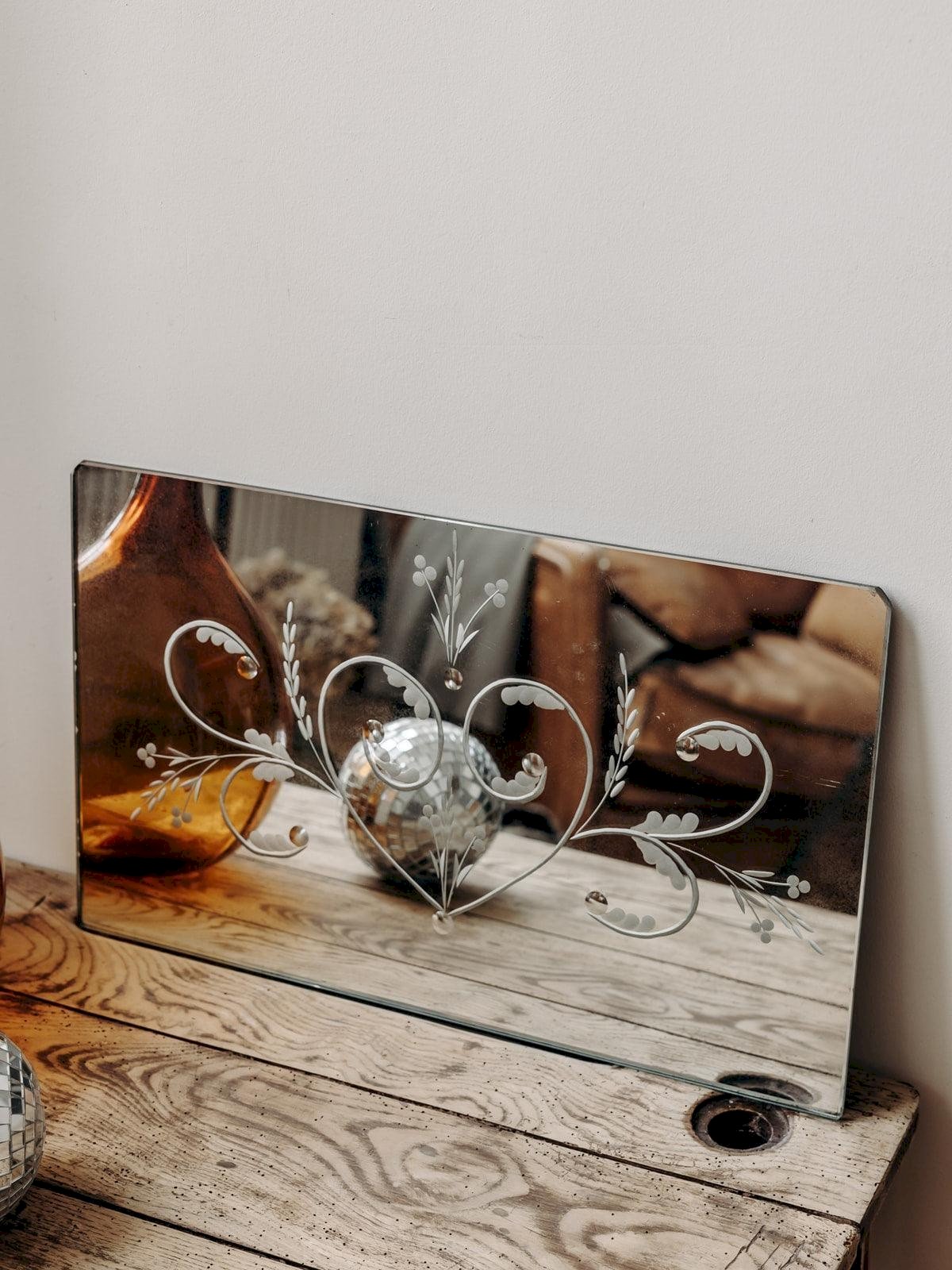 This engraved rectangular mirror is an exceptional piece! We love its pretty designs that give it all its charm. For a bathroom or the corner of a bedroom, it is the ideal mirror! Length: 50 cm Width: 30 cm Condition: Used: Item that has been used. Item showing some signs of superficial wear... Used: Item that has been used. Item showing some signs of superficial wear, fully operational and functioning correctly. It may be a demonstration model or a returned item after a short period of use. any possible imperfections. Brand: Debongout Type: Thrifted product Material: Glass Style: Country