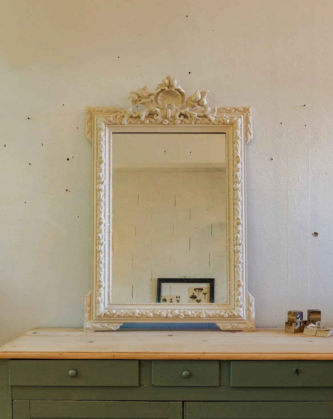 Discover this beautiful antique mirror, carefully repainted in white to bring a touch of elegance to your interior. Its wooden frame, with timeless charm, highlights a parqueted back, adding a note of refinement. Ideal for enhancing your decoration, this mirror will easily fit into different styles, from vintage to contemporary. Add a touch of authenticity to your space with this design gem. Length: 81 cm Height: 119 cm Depth: 6 cm Condition: Used: Item has been used. Item shows some superficial signs of wear, fully operational and functioning correctly. It may be a demonstration model or an item returned to the store after a short period of use, including any imperfections. Brand: Debongout Type: Vintage product Material: Wood Style: Country.