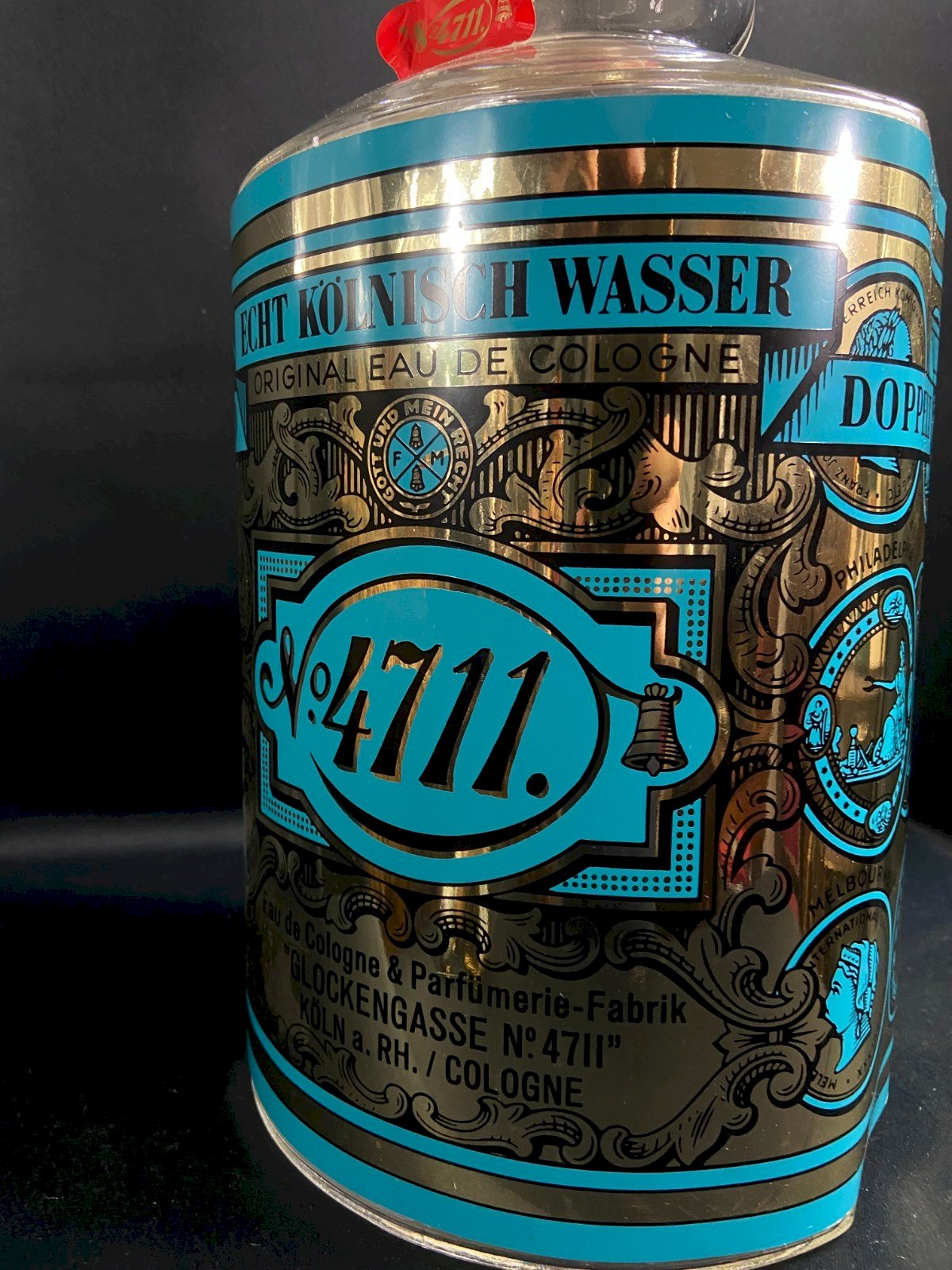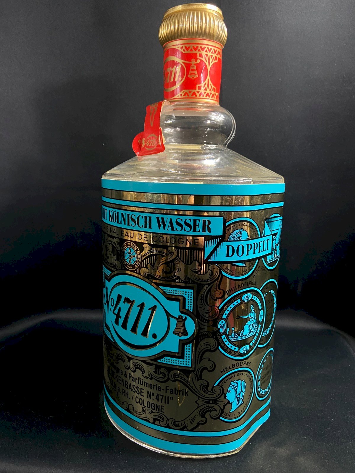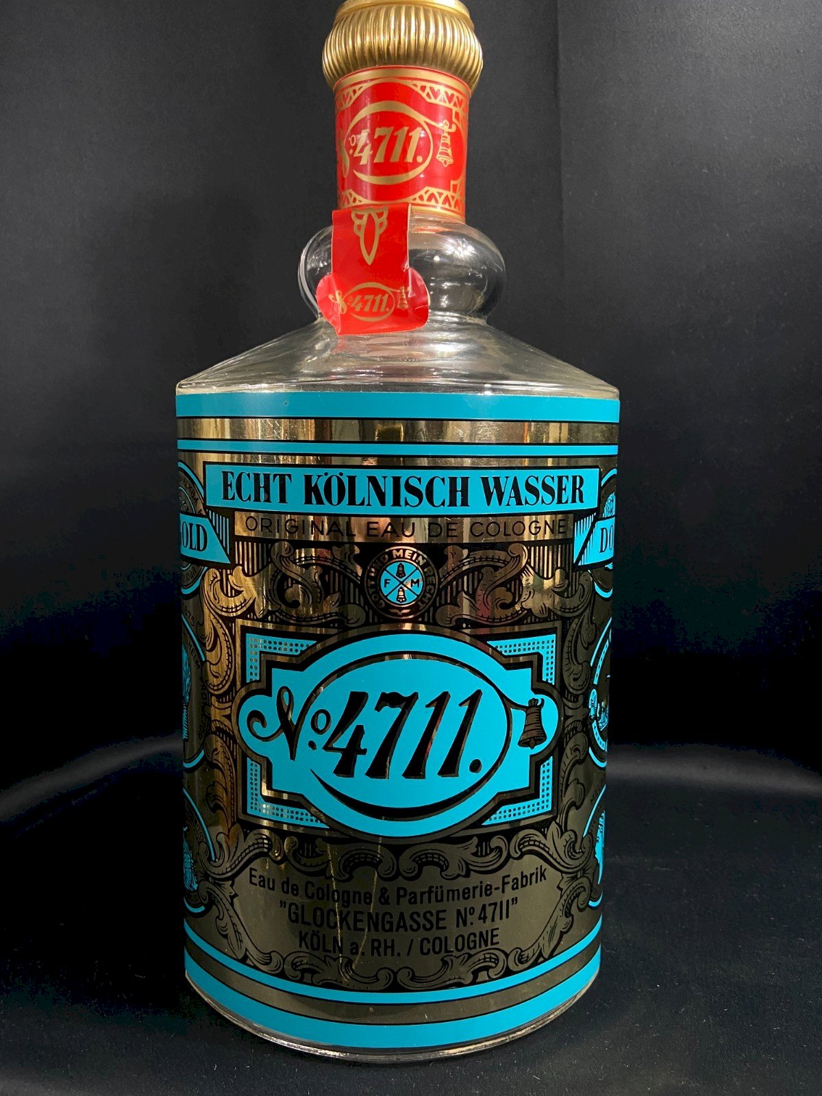 Imposing advertising display bottle (mock-up for window display) made of blown-molded glass, decorated with the famous turquoise and gold label of n°4711 – Glockengasse, Köln. Red collar and seal printed with the 4711 logo (present), golden plastic/spiral cap. Baroque graphics presented in large format on the entire body. Brand: 4711 – Echt Kölnisch Wasser (Original Eau de Cologne) Function: mock bottle for perfume store displays (not intended for retail sale) Era: 1960s–1980s (typical red graphics and collar) Material: clear glass; turquoise/gold metallic paper covering; red paper collar Maximum dimensions: H 40.5 × 18 × 17 cm Weight: 2,941 g Condition: very good display condition; slight signs of use on the red collar, small wear on the gold decoration in places (consistent with store use). No chips on the glass. Iconic object of European advertising design, perfect for store decor, antique perfume collection, photo studio, barbershop, etc. SHIPPING WORLDWIDE Condition:Used Item that has been used. possible imperfections. Materials from: Germany Number of pieces: 1 Type: Giant Mock-up Subtype: Eau de Cologne Material: Glass Gender: Unisex Feature: Empty