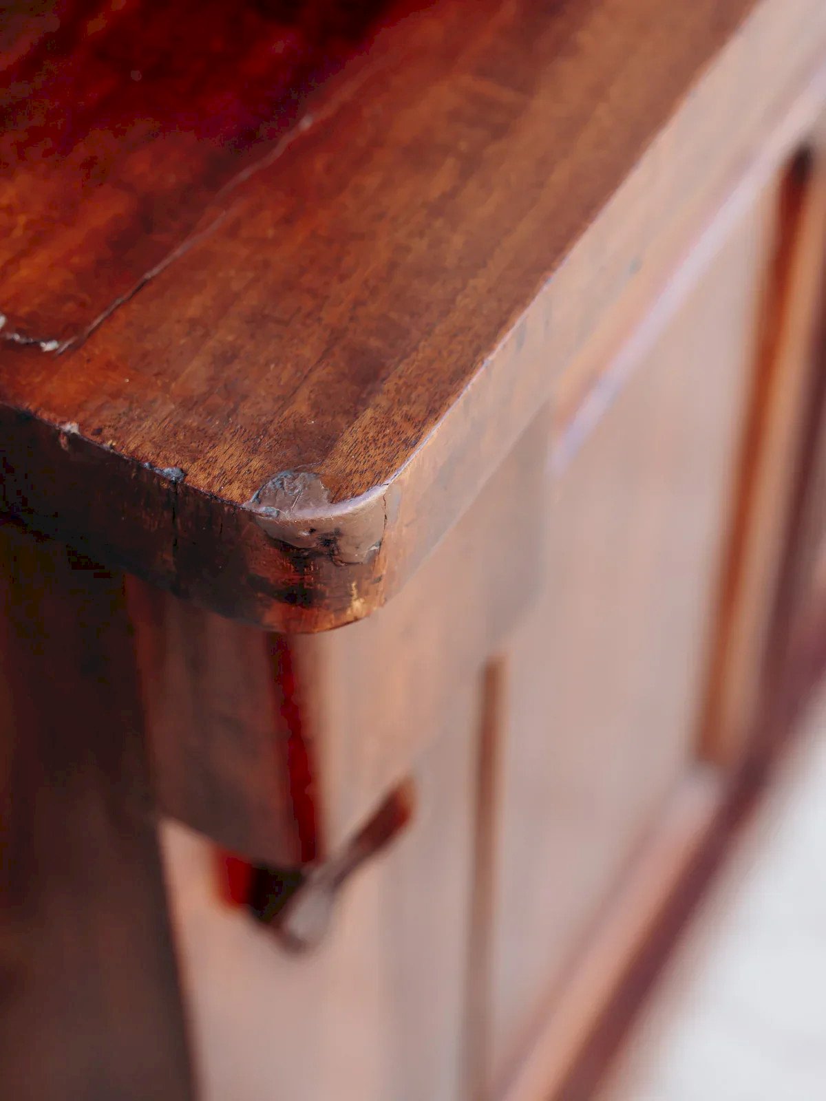 Elevate your interior with this refined wooden veneer buffet, where a curved drawer and a small key create a subtle sophistication; its slender proportions offer clever storage for an entryway or dining room, while the warm hue and wood grain establish a soft and inviting atmosphere. The main drawer slides poorly. Length: 105 cm Width: 38 cm Height: 85 cm Drawer height: 9 cm Niche height: 30 / 27.5 cm Condition: Used item with some superficial wear marks. Fully operational and functioning correctly. It may be a demonstration model or an item returned to the store after a short period of use. Possible imperfections. Brand: Debongout Type: Vintage product Material: Wood Style: Country Customized: Buffets
