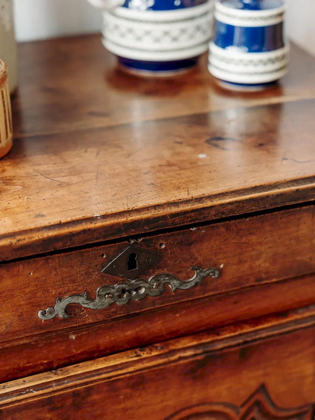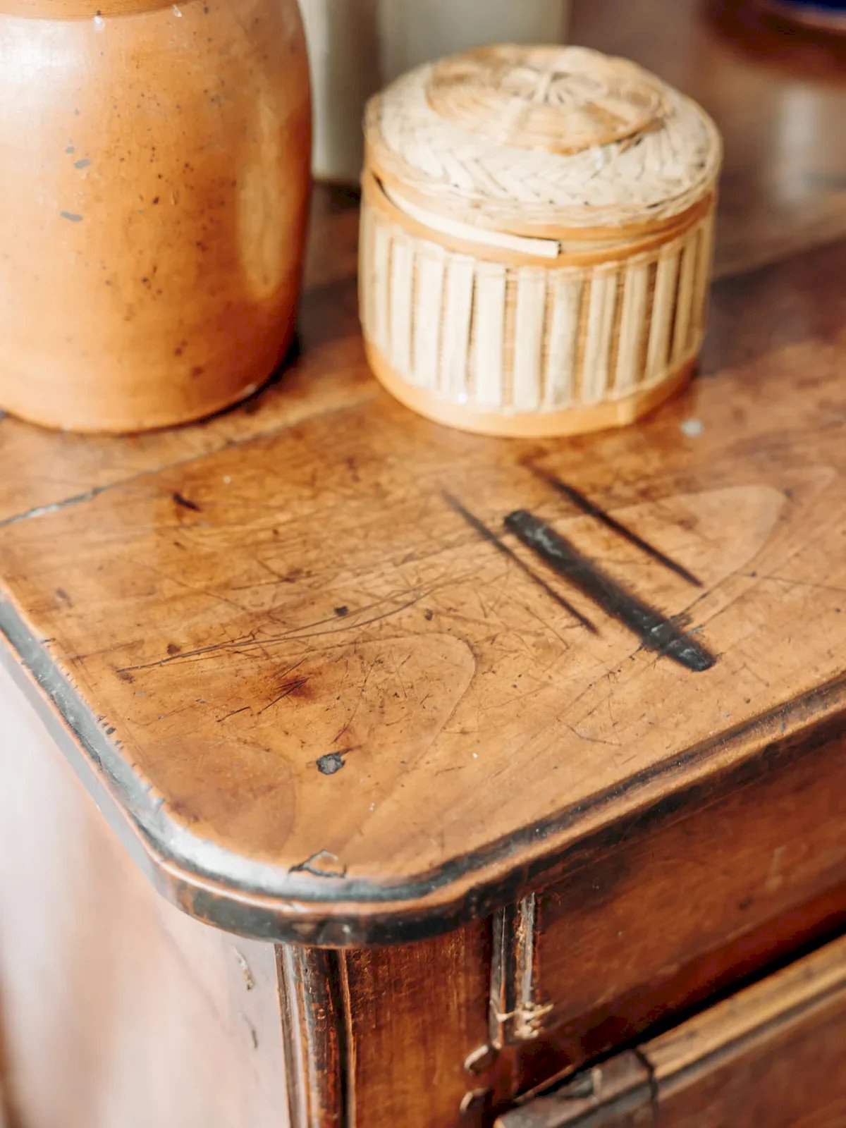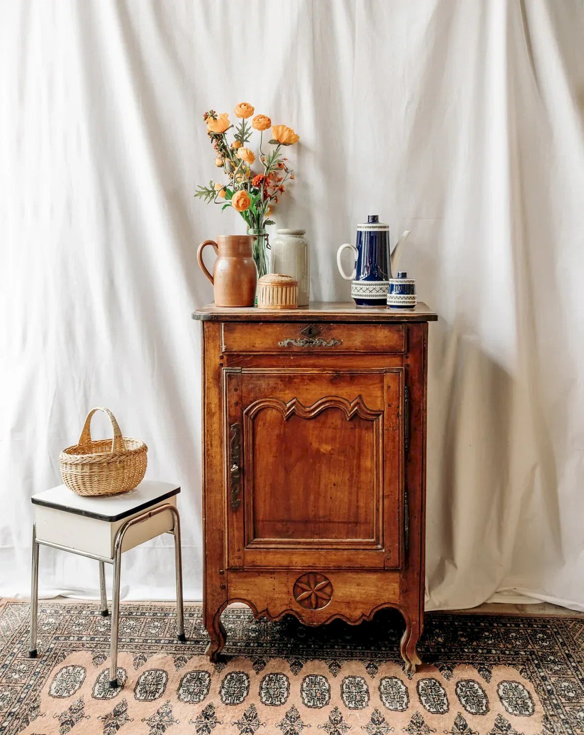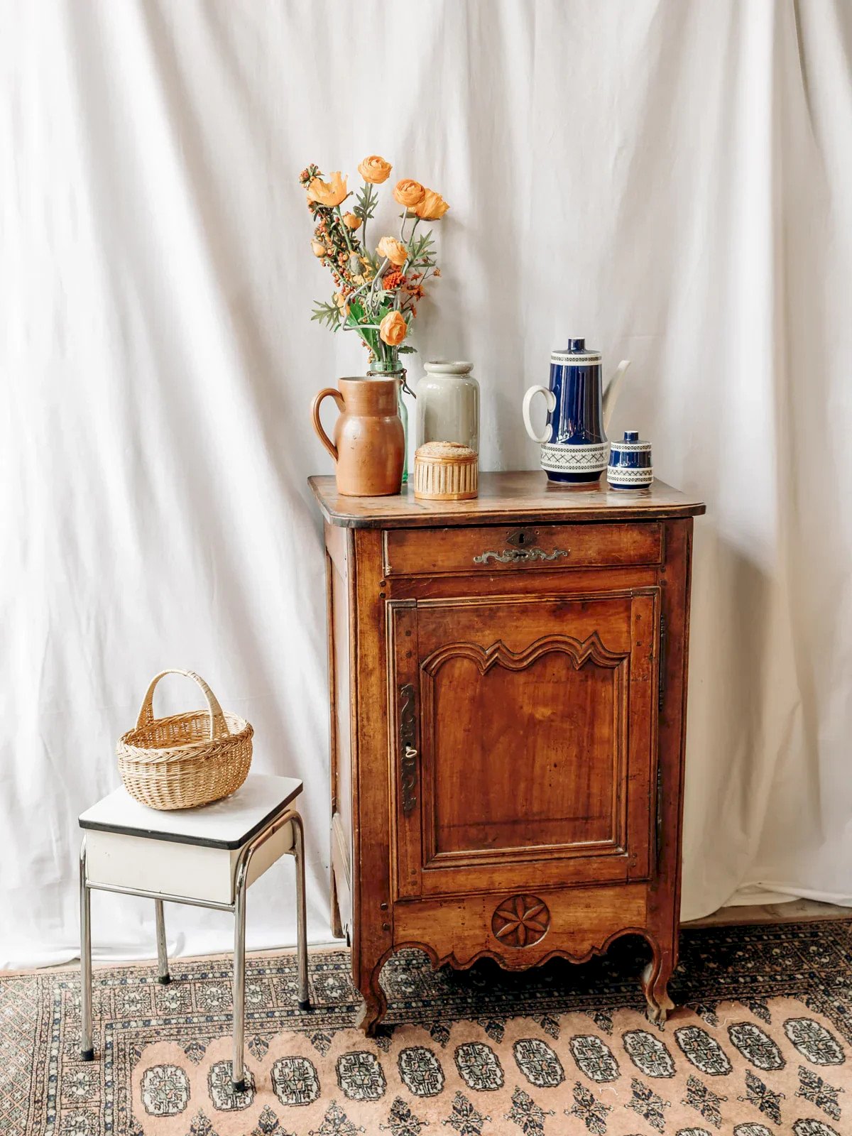 Bring a touch of authenticity to your home with this beautiful wooden sideboard or jam cabinet, carefully crafted with a patina of time and a few marks on the top that give it a unique charm. Equipped with a compartmentalized drawer and a lockable cabinet, this piece combines functionality and aesthetics. Its lovely wood details and patinated metal accents add a vintage touch, making it a must-have for lovers of warm and timeless decor. Please note that one of the back legs shows some signs of wear, without affecting its use. Length: 64 cm Height: 95 cm Drawer height: 4.5 cm Depth: 45 cm Condition: Used: Item has been used. Item shows some superficial signs of wear, ... Used: Item has been used. Item shows some superficial signs of wear, fully operational and functioning correctly. It may be a demonstration model or an item returned to the store after a short period of use. Possible imperfections. Brand: Debongout Type: Vintage product Material: Wood, Metal Style: Country Customized: Sideboards