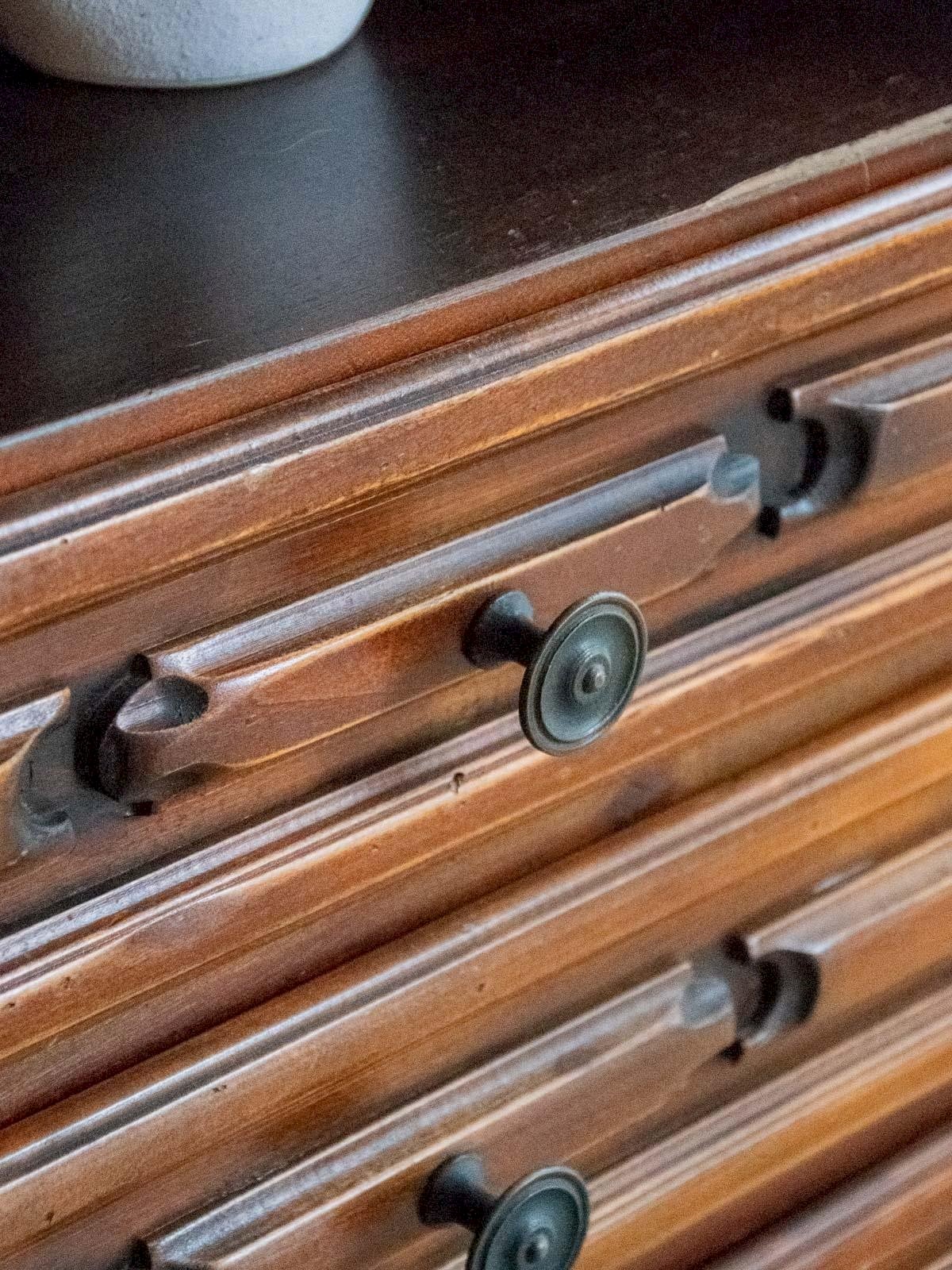 Adopt this small wooden sideboard with discreet charm, equipped with three drawers and an open niche to display dishware or decorative items. Its removable shelf offers modular configurations, adapting to the hallway, living room, or kitchen, and reveals the warmth and grain of the wood for a calming atmosphere. Its compact size optimizes small spaces while remaining elegant and functional. Some signs of use that contribute to its authenticity. Length: 52 cm Width: 32.5 cm Height: 69.5 cm Height of the niche: 19.5 cm Shelf dimensions: 43 cm x 21 cm Drawer dimensions (x3): 6 cm x 40 cm Condition: Used: Item that has been used. Item showing some superficial signs of wear, ...Used: Item that has been used. Item showing some superficial signs of wear, fully operational and functioning correctly. It may be a demonstration model or a returned item after a short period of use. any potential imperfections. Brand: Debongout Type: Vintage product Material: Wood Style: Country Custom: Sideboards
