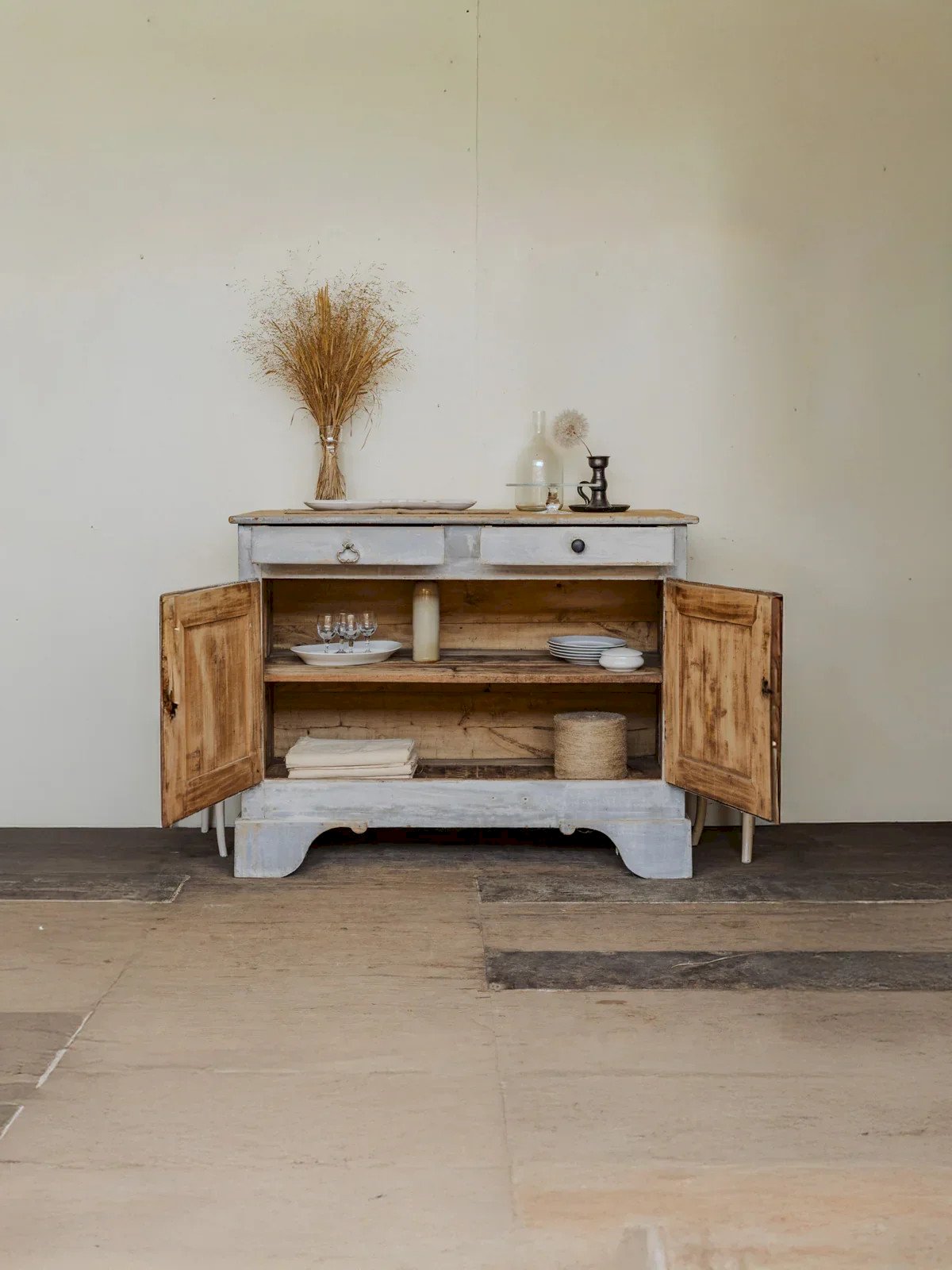 Bring into your interior this country-style buffet in poplar wood with a warm top and a natural patina, dressed in a soft blue-grey. Its two drawers and two doors hide an internal shelf, offering generous storage for dishes or linen, while the top easily accommodates objects and floral arrangements. The contrasting handles — one in slightly gilded metal, the other in painted black wood — give it a handcrafted and bold character. Some signs of age, a stain at the back, and a defect on the right rear leg. Length: 140 cm Width: 72 cm Height: 110 cm Drawer height: 8 cm Condition: Used: Item that has been used. Item showing some minor superficial wear...Used: Item that has been used. Item showing some minor superficial wear, fully operational and functioning correctly. It may be a demonstration model or an item returned to the store after a short period of use. Any potential imperfections. Brand: Debongout Type: Vintage product Material: Poplar, Metal, Wood Style: Country Customized: Buffets
