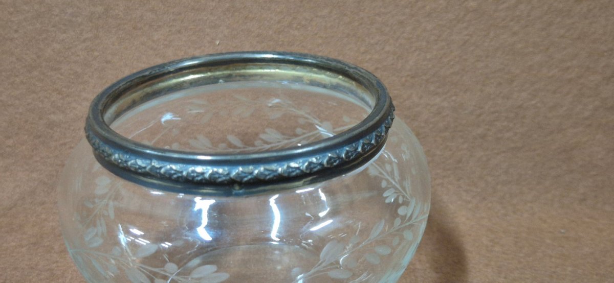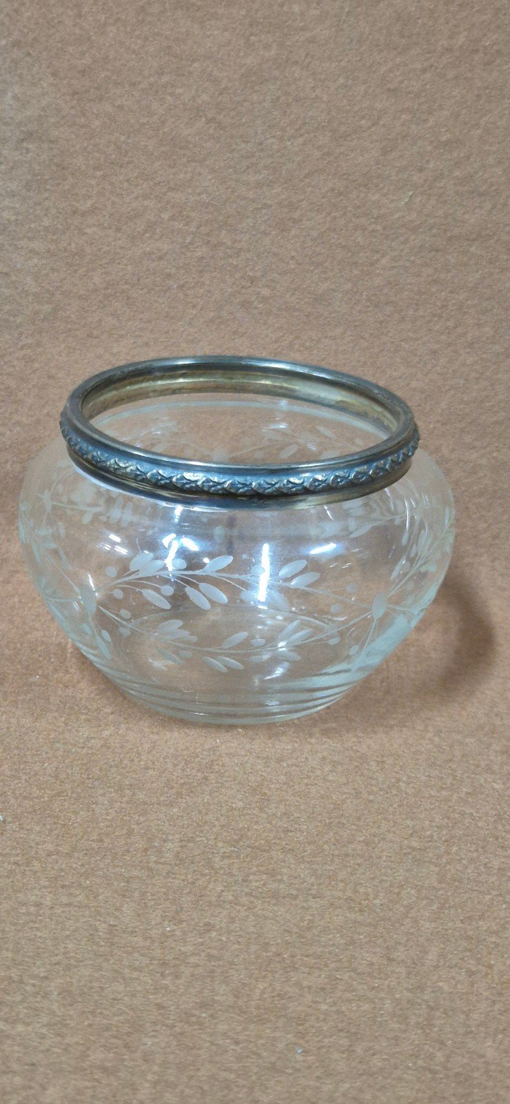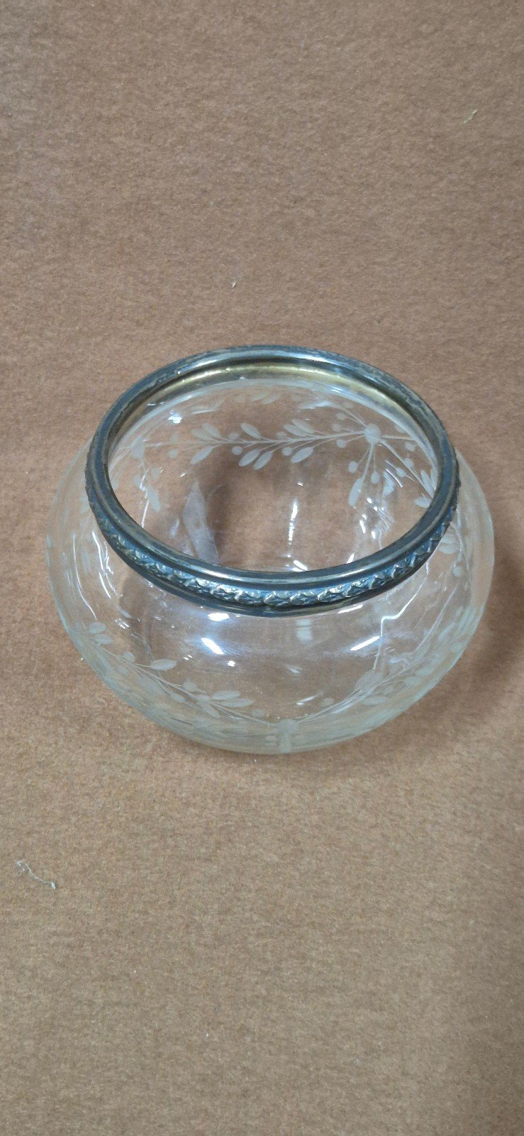 superb glass pot with solid silver edges, marked with the Minerva hallmark, weighing 126.61 grams. It is in very good condition, with just one scratch on the bottom. The glass is cut, and it is a very beautiful model. It measures 10 cm in diameter and 6.5 cm in height. Type: Tableware, Kitchen Subtype: GLASS POT Material: Solid Silver
