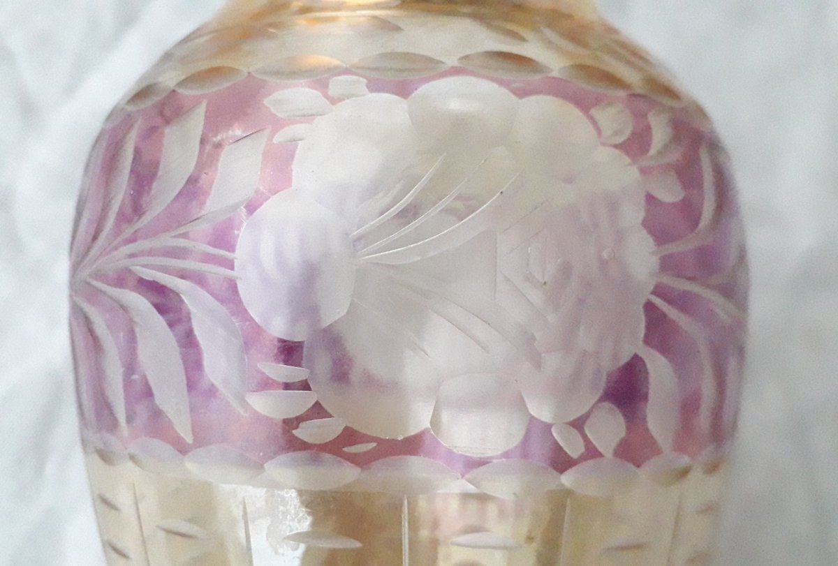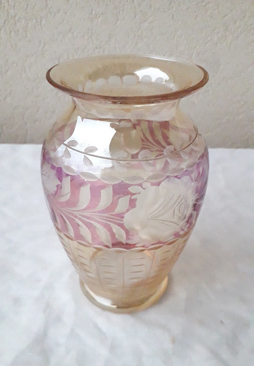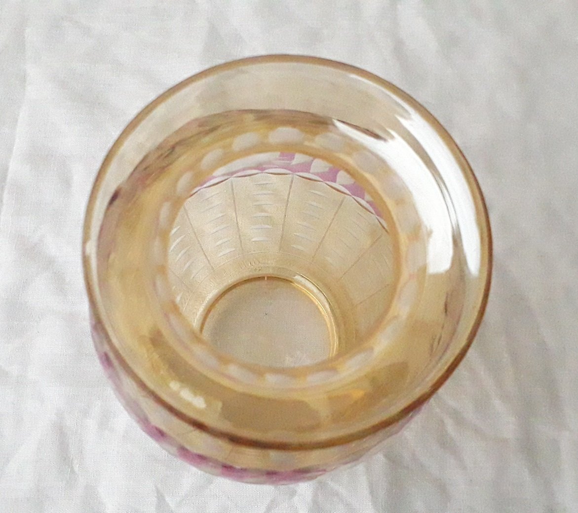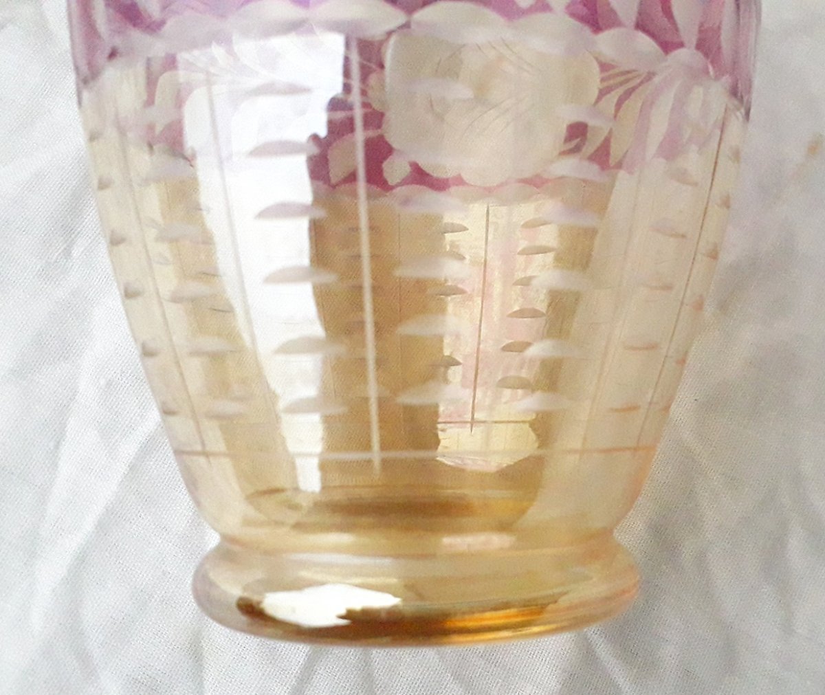 Small two-tone glass vase with incised decoration, marked underneath "Czechoslovakia." Very good overall condition, no chips or cracks. Dimensions: height 13.5 cm, maximum diameter 9 cm. Weight 0.2 kg. Feel free to contact me for any additional information and/or to make your offers. See my other items for sale.