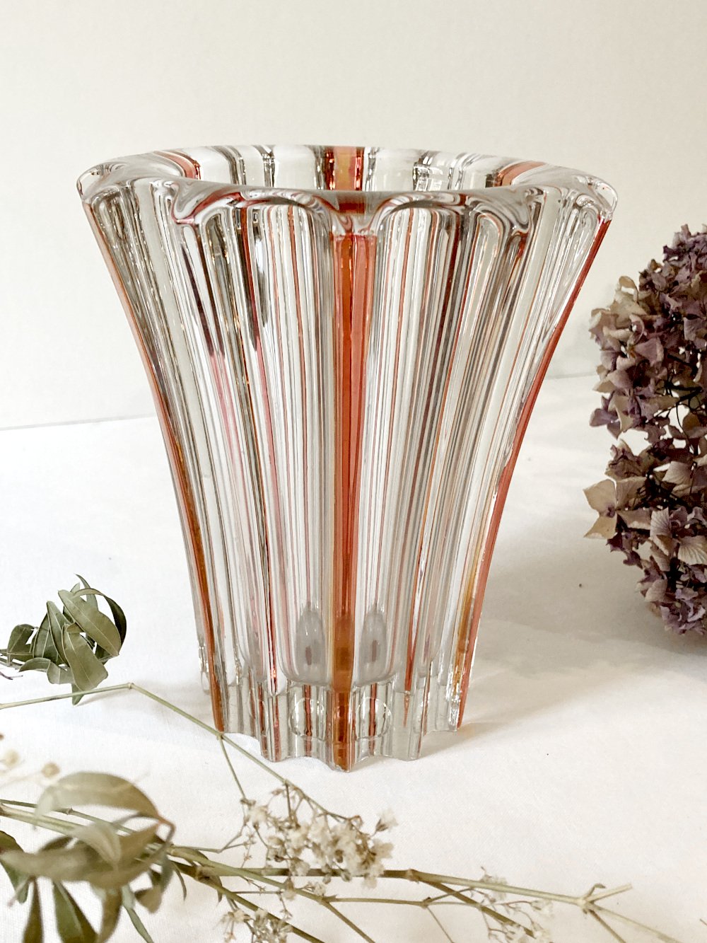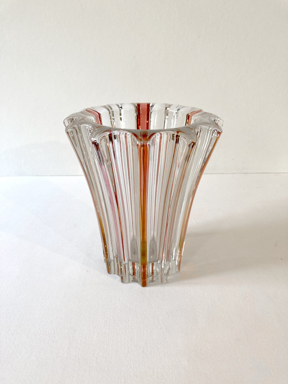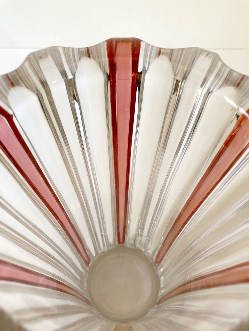 I present to you this beautiful Art Deco piece signed Pierre D'Avesn (1901-1990) - Made in France: a fully grooved vase made of transparent glass lined with red. 1940s. Very pretty striped light effects in the grooves of the glass. Overall condition is satisfactory, with some small scattered chips on the glass (sometimes tiny), particularly along the lower edge, including a larger chip on one groove (as shown in the photo). The price takes these defects into account.
