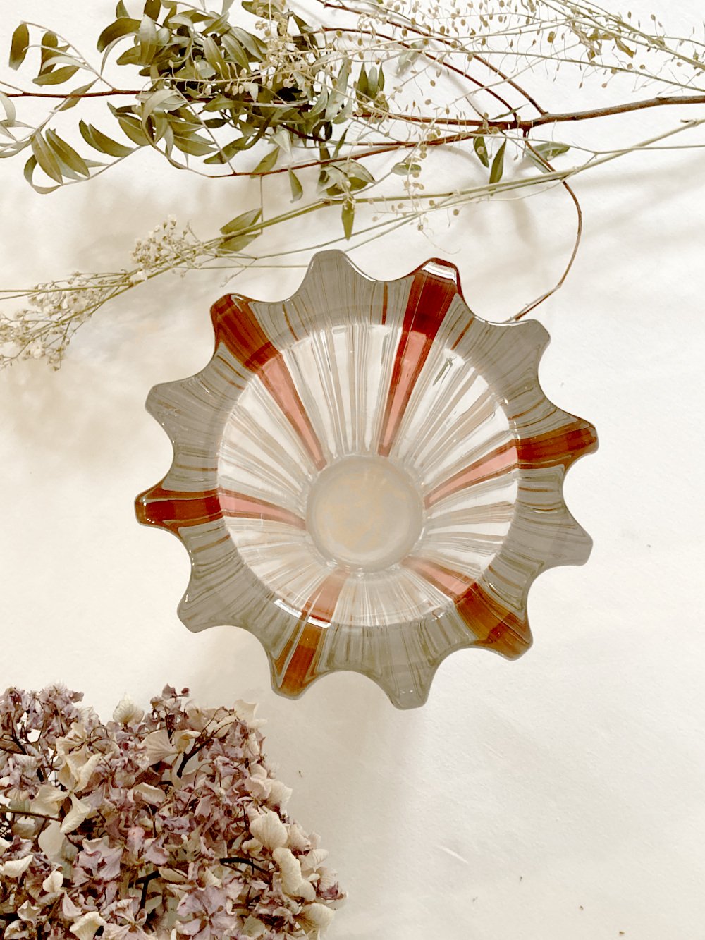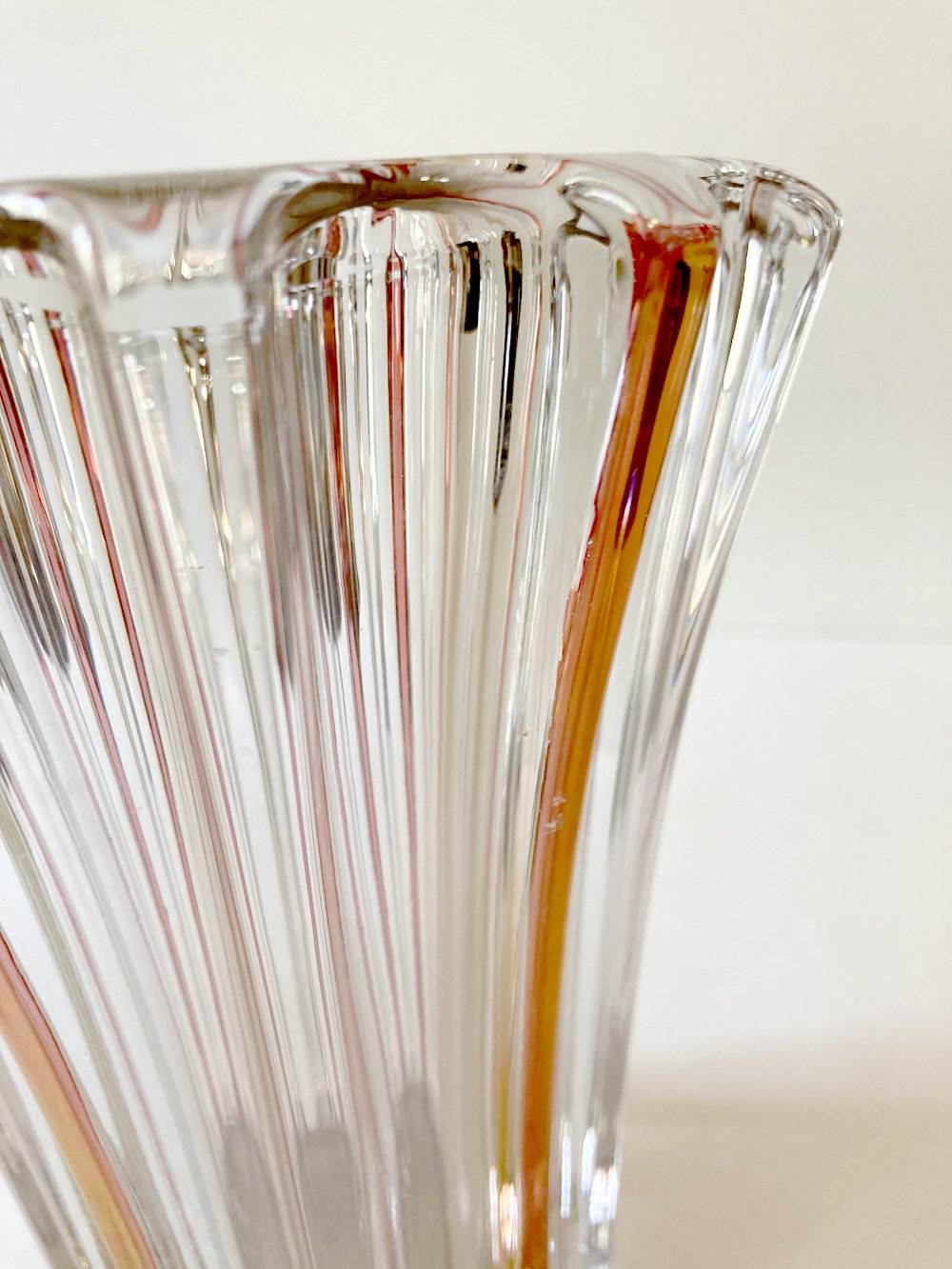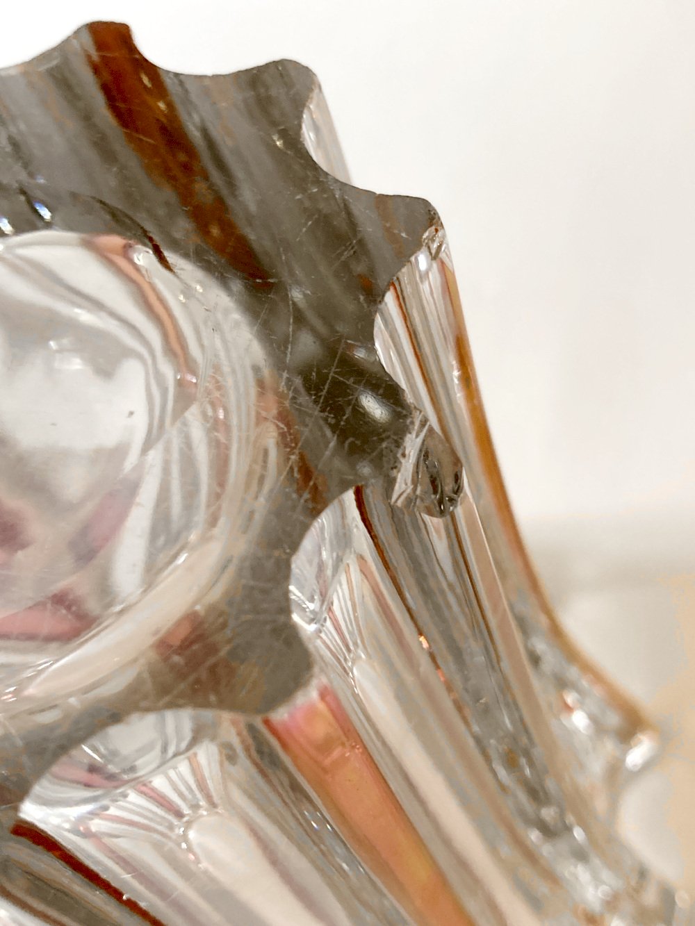 I present to you this beautiful Art Deco piece signed Pierre D'Avesn (1901-1990) - Made in France: a fully grooved vase made of transparent glass lined with red. 1940s. Very pretty striped light effects in the grooves of the glass. Overall condition is satisfactory, with some small scattered chips on the glass (sometimes tiny), particularly along the lower edge, including a larger chip on one groove (as shown in the photo). The price takes these defects into account.